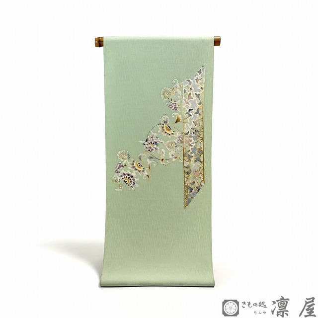 加賀友禅の九寸染め名古屋帯です。 作品の題は『悠久の敦煌』。加賀友禅作家・吉村伊佐子氏の生み出すシルクロードを巡る旅をモチーフとした数々の作品の中でも、シルクロードの分岐点として大変栄えたオアシス都市である「敦煌(とんこう)市」に想いを馳せてます。 落ち着きある若葉色の地色に、天平文様からの葡萄唐草を主軸とした東西の香りが漂う吉村氏独特の柄が繊細な彩色が映え、流れるような柄の紋意匠縮緬のゆらゆらとした艶が、幻想的な柄をより一層引き立てています。 ------------------------------------------ ※価格はお仕立て代(名古屋仕立て)も含みます。 ※ご注文いただいてからのお仕立てとなりますので、ご注文からお届けまでに4~5週間ほどかかります。お急ぎをご希望の場合はご注文前に必ずご相談くださいませ。 ※コーディネートは一例です。小物等は付属しません。 ※商品のお色目はできる限り現物に近づけるようにしておりますが、 お使いのモニター設定や室内環境により実際の商品と色味が異なる場合がございます。色の表現につきましては、こちらの色見本サイトをご参照ください。 「和色大辞典」 https://www.colordic.org/w