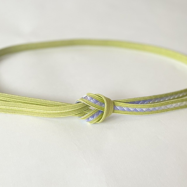 鮮やかな鶸色の片側中央に藤色~青藤へとぼかしの入った目を惹く綺麗色の帯締めです。絹糸一本一本が感じられる束感のある組が美しいですね。さりげなく全体に散らされた金がチラチラと控えめに光ります。 やや幅が広めで締めた時の安定感も抜群です。 長さ 約154㎝(房含まず) × 巾 約1.5㎝ 絹100% 日本製 ※簡易包装でのお届けとなります。