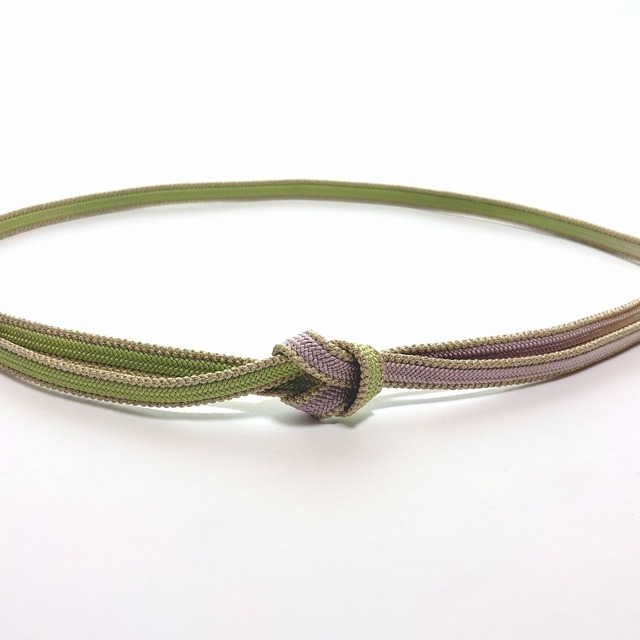 草色と桜色の2色による亀甲に、裏と撚り房はアイボリーの帯締めです。三色だんごや春の和菓子のような配色で雅やかな雰囲気。立体感のあるふっくらとした畝は大変美しく、締め心地も非常に良いお品です。 小紋や紬など、気の張らないカジュアルなお出かけに。 長さ 約154㎝(房含まず) × 巾 約1.3㎝ 絹100% 日本製