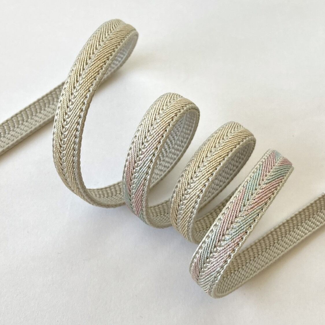 絶妙なエクリュカラーを基調に、片側は淡いブルーとサーモンピンクが織りなすぼかしになっています。柔らかで控えめな色調は着姿を品よくまとめてくれますね。効かせ色ではないこのようなお色の帯締めは品の良いなかなか重宝いたします。