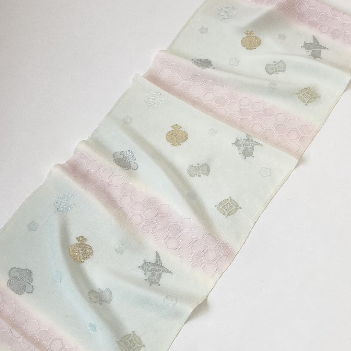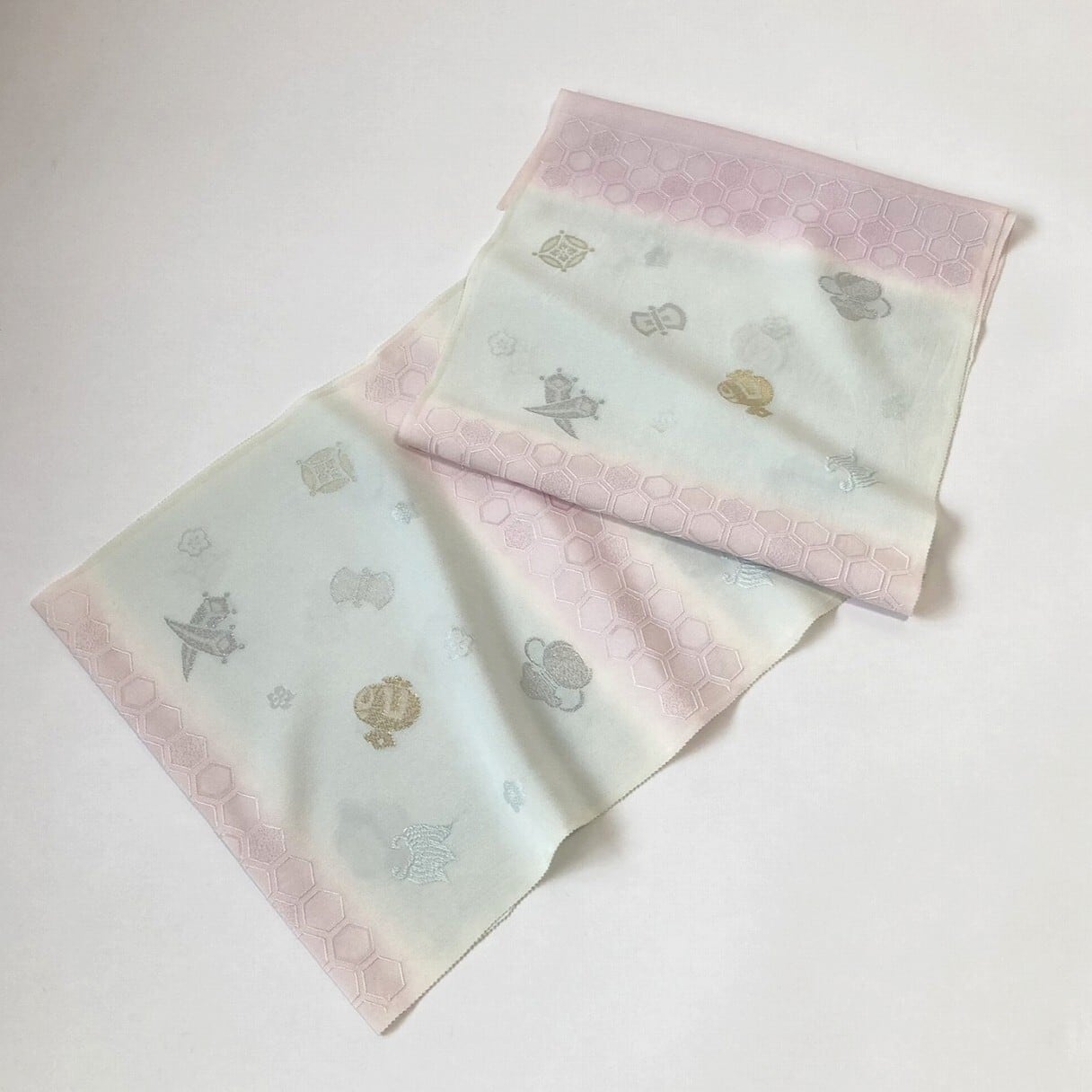 宝尽くしに亀甲の横段が入ったフォーマル用の帯揚げです。