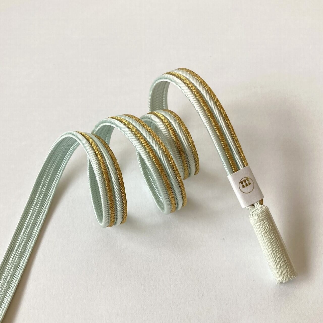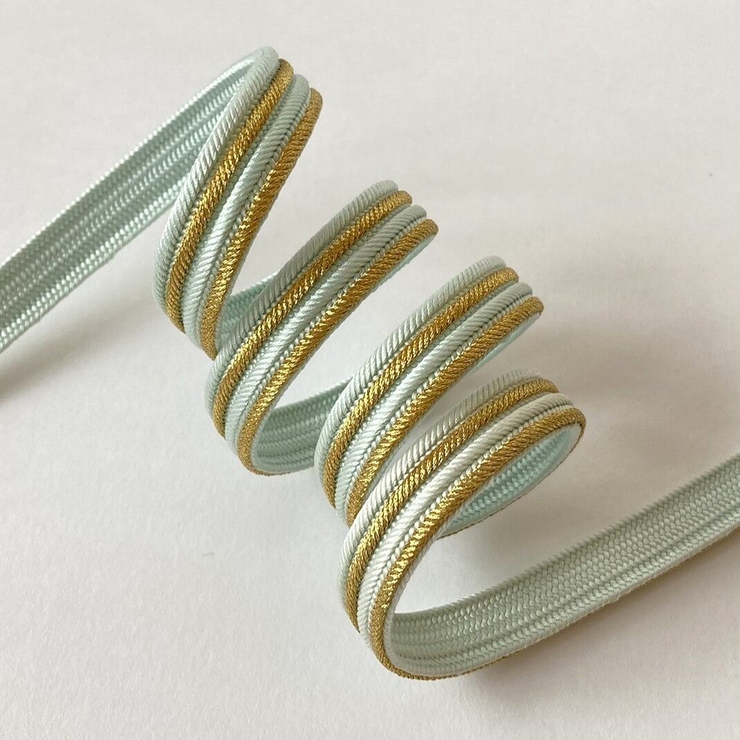 畝打組で、水色と金のそれぞれの畝筋が2本ずつ交互に並ぶ帯締めです。フォーマルなお席の装いを格調高く印象付け、しなやかでしっかりとした組は締め心地にも大変安心感があります。