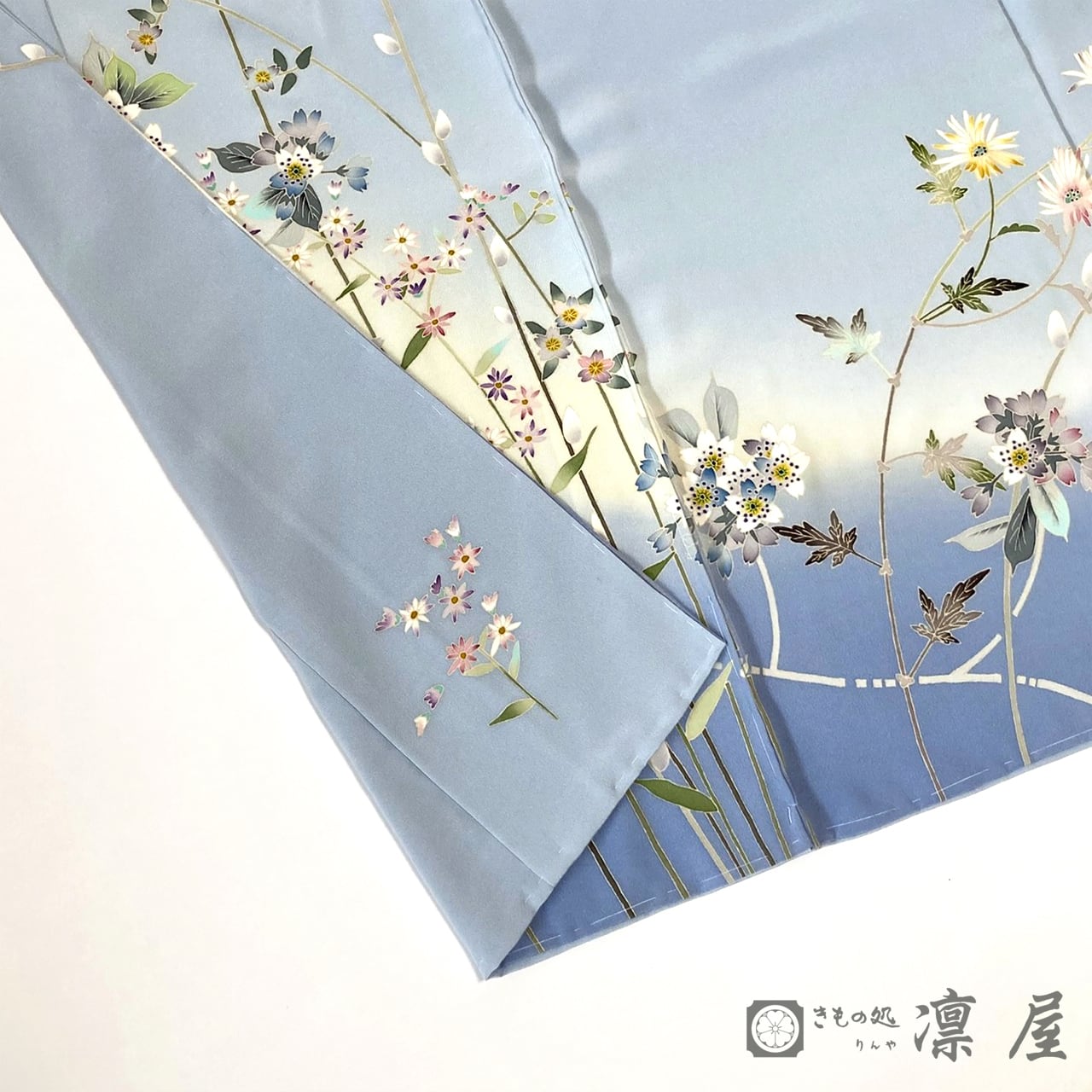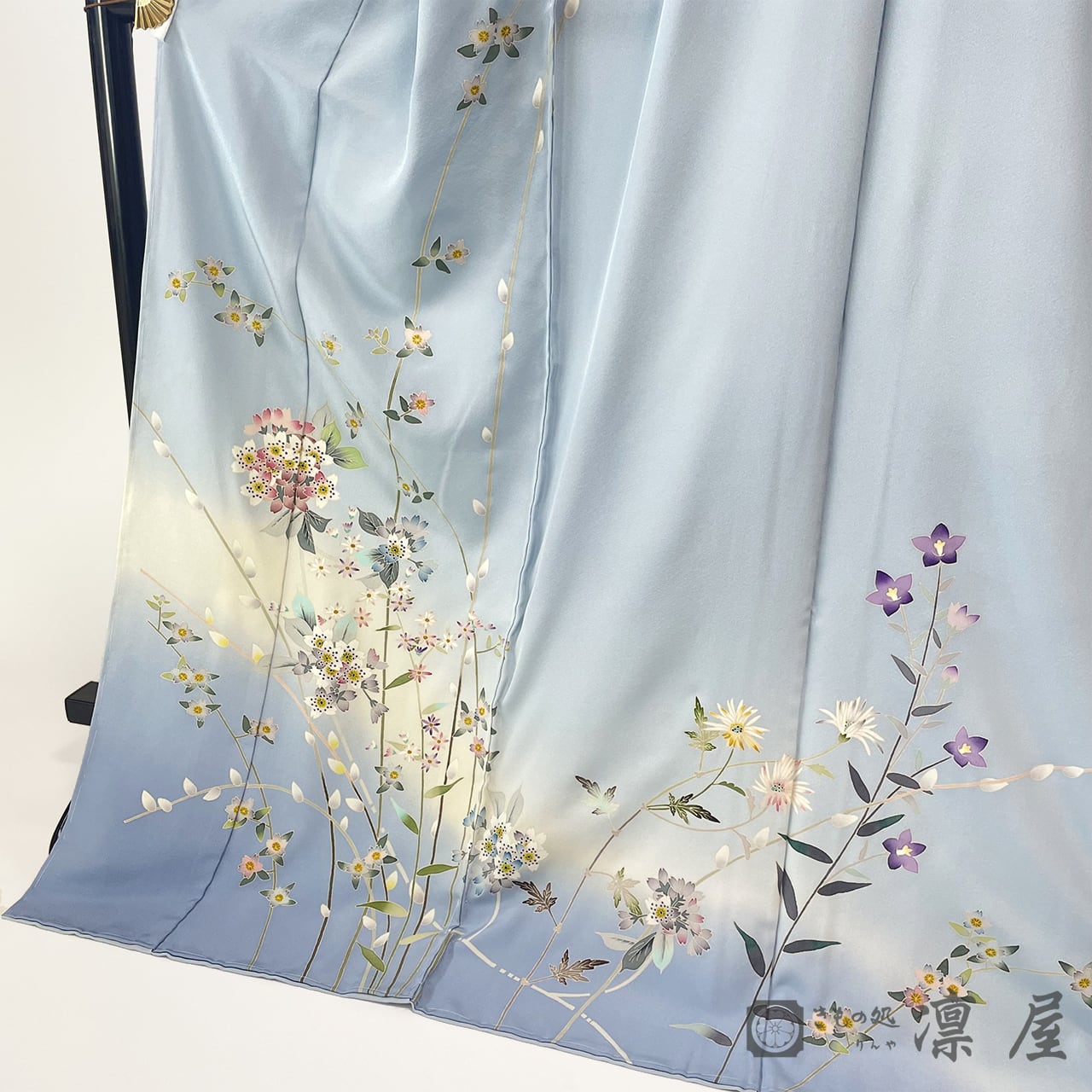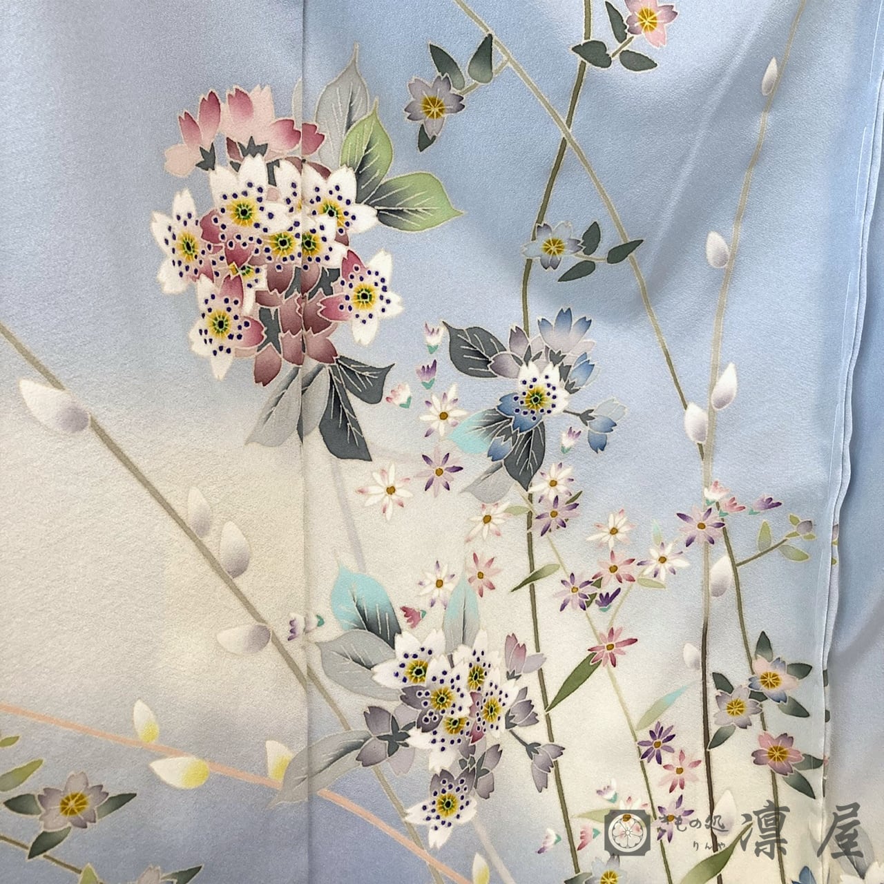 可憐で明るい勿忘草色(わすれなぐさいろ)の地色は澄んだ綺麗なブルーといった印象で、淡いクリームベージュのぼかしを挟み、裾ぼかしは落ち着きある薄花色です。