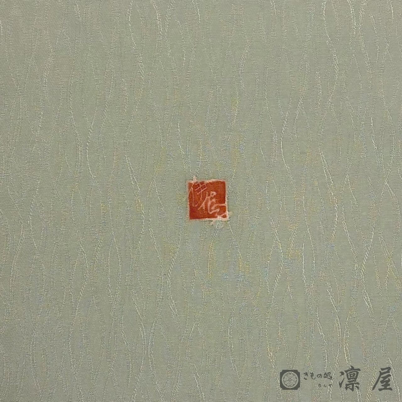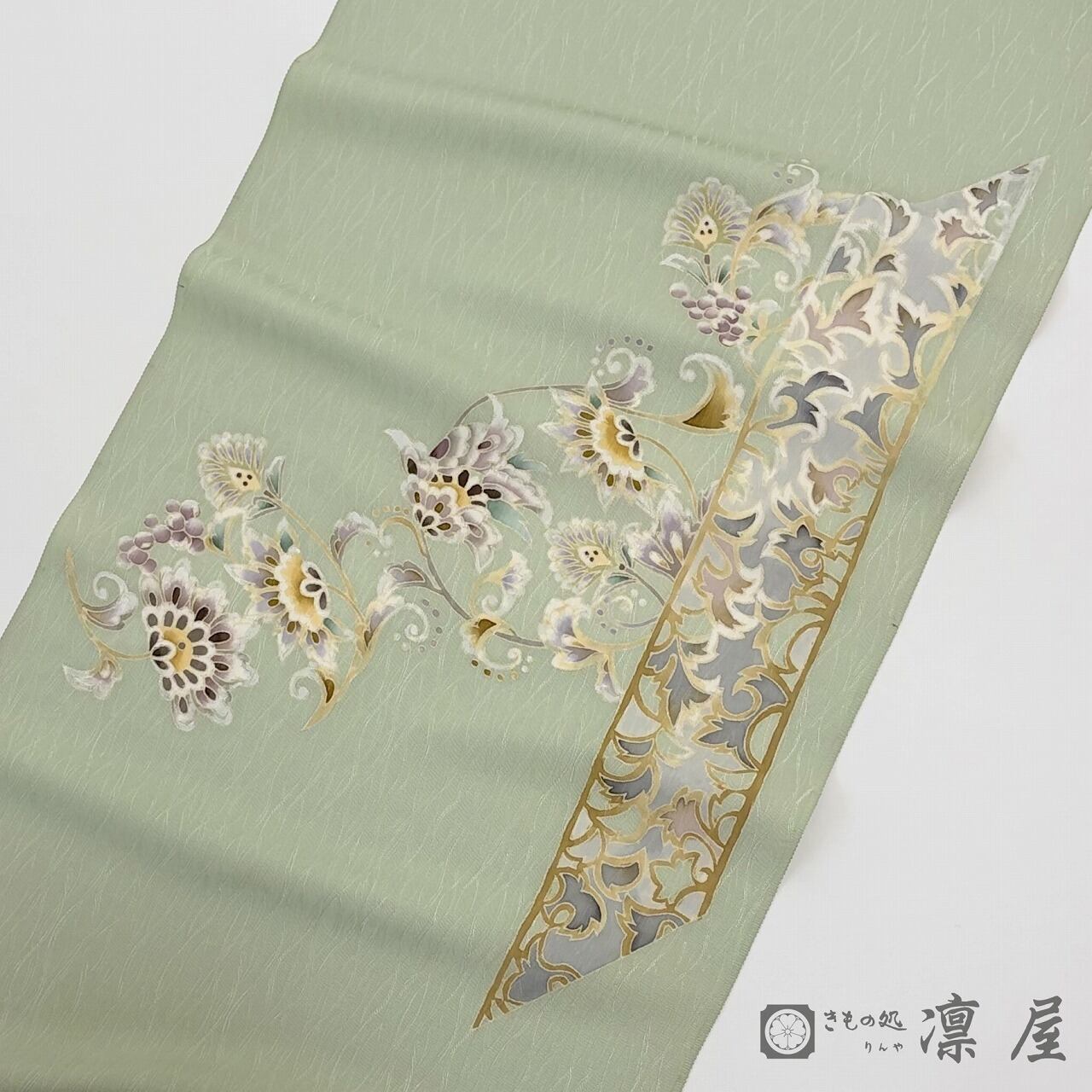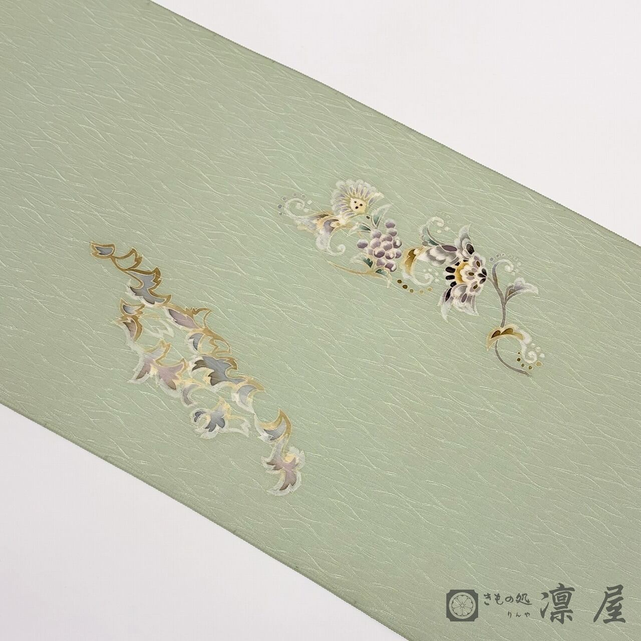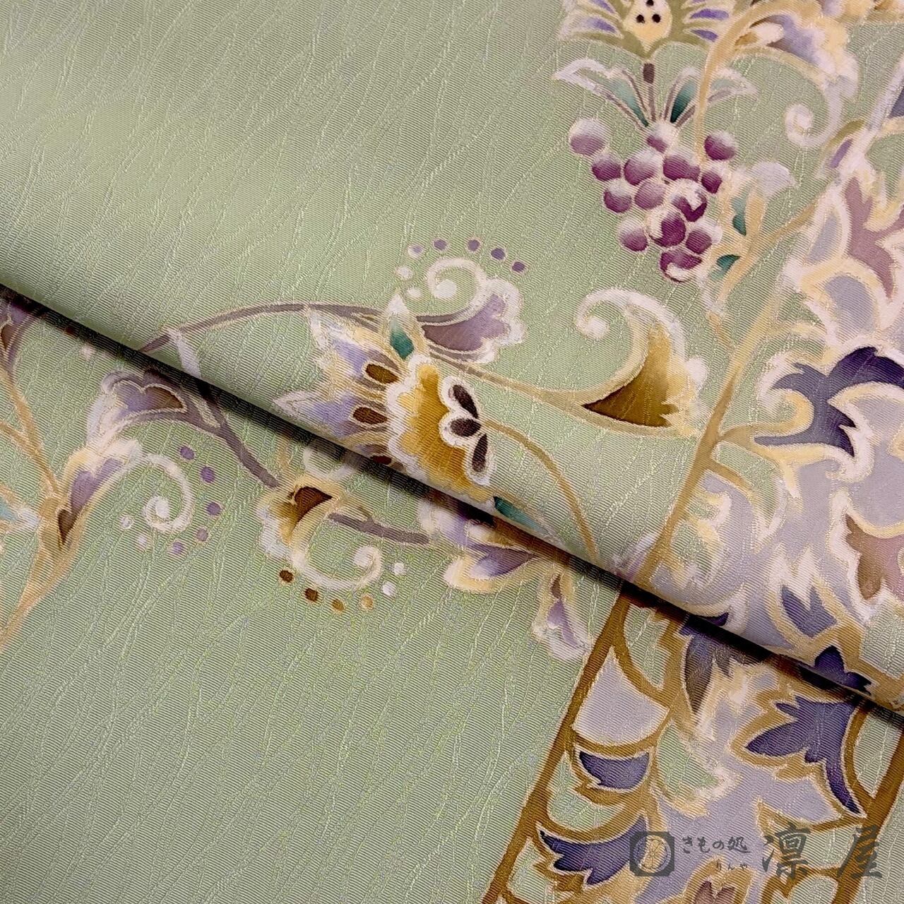 落ち着きある若葉色の地色に、天平文様からの葡萄唐草を主軸とした東西の香りが漂う吉村氏独特の柄が繊細な彩色が映え、流れるような柄の紋意匠縮緬のゆらゆらとした艶が、幻想的な柄をより一層引き立てています。