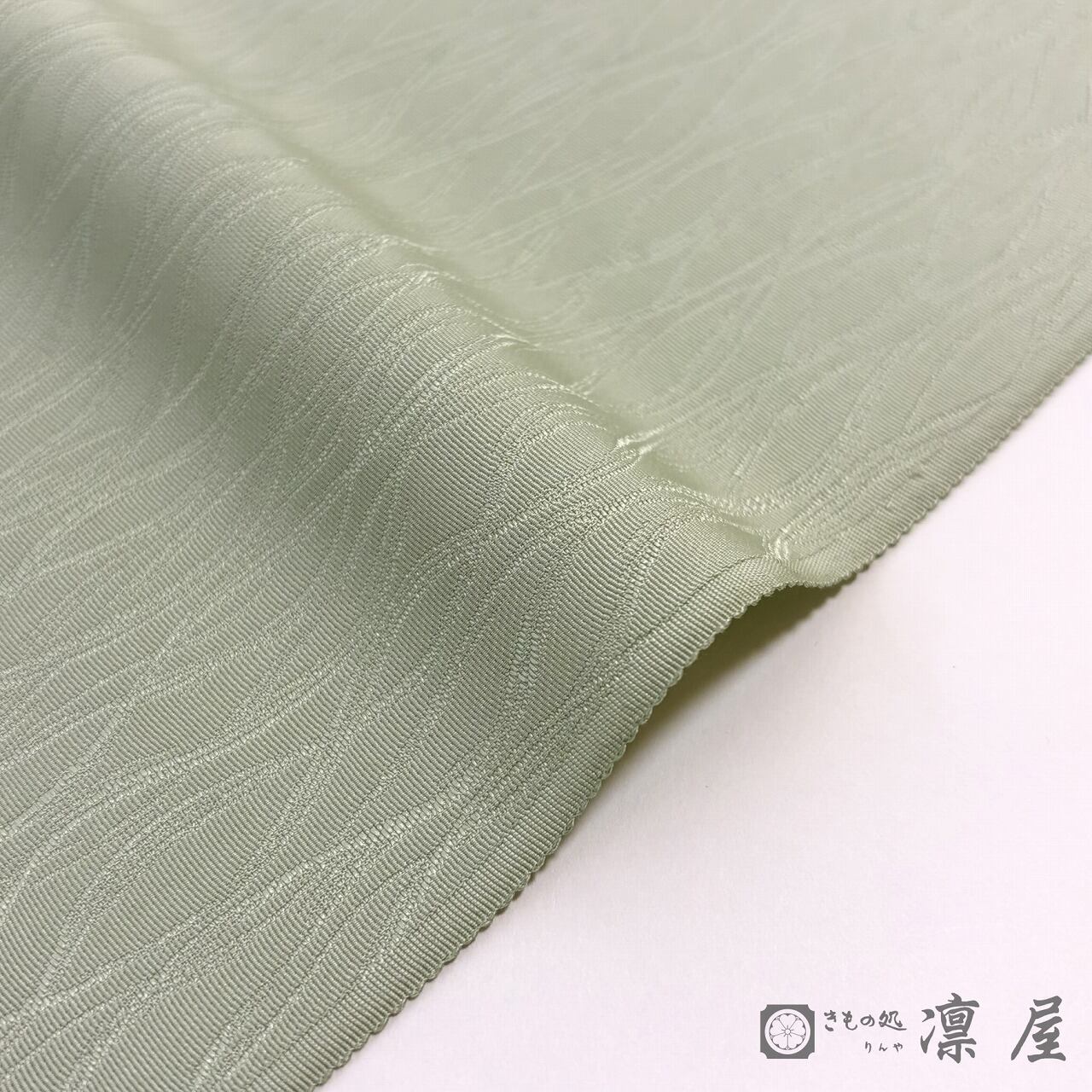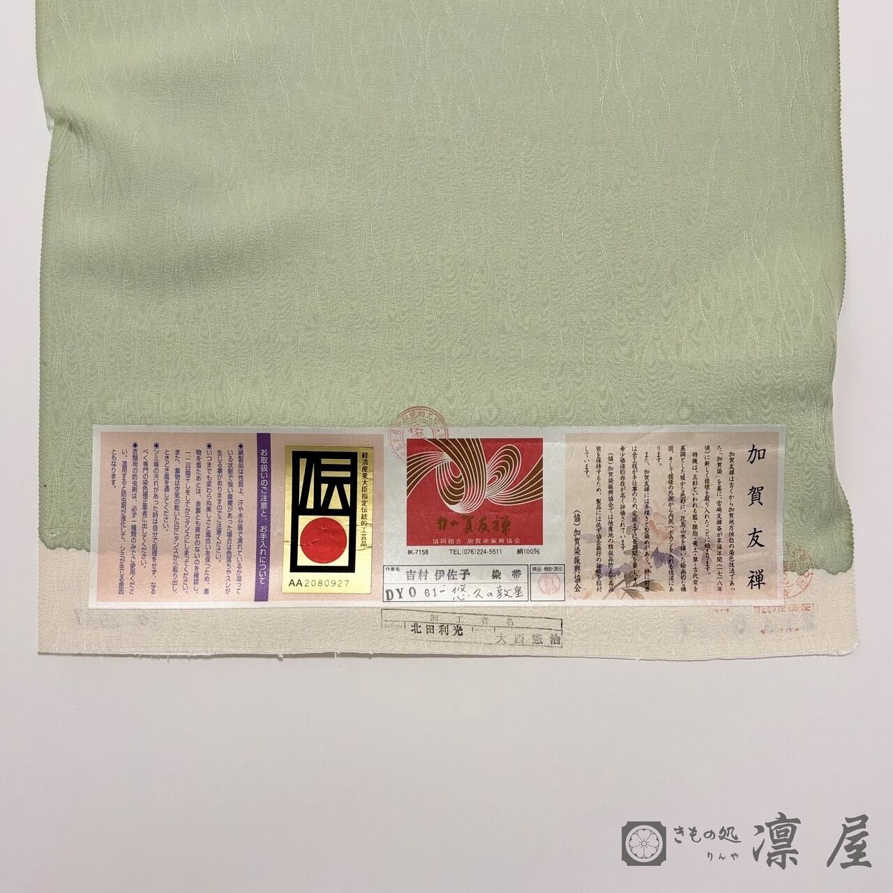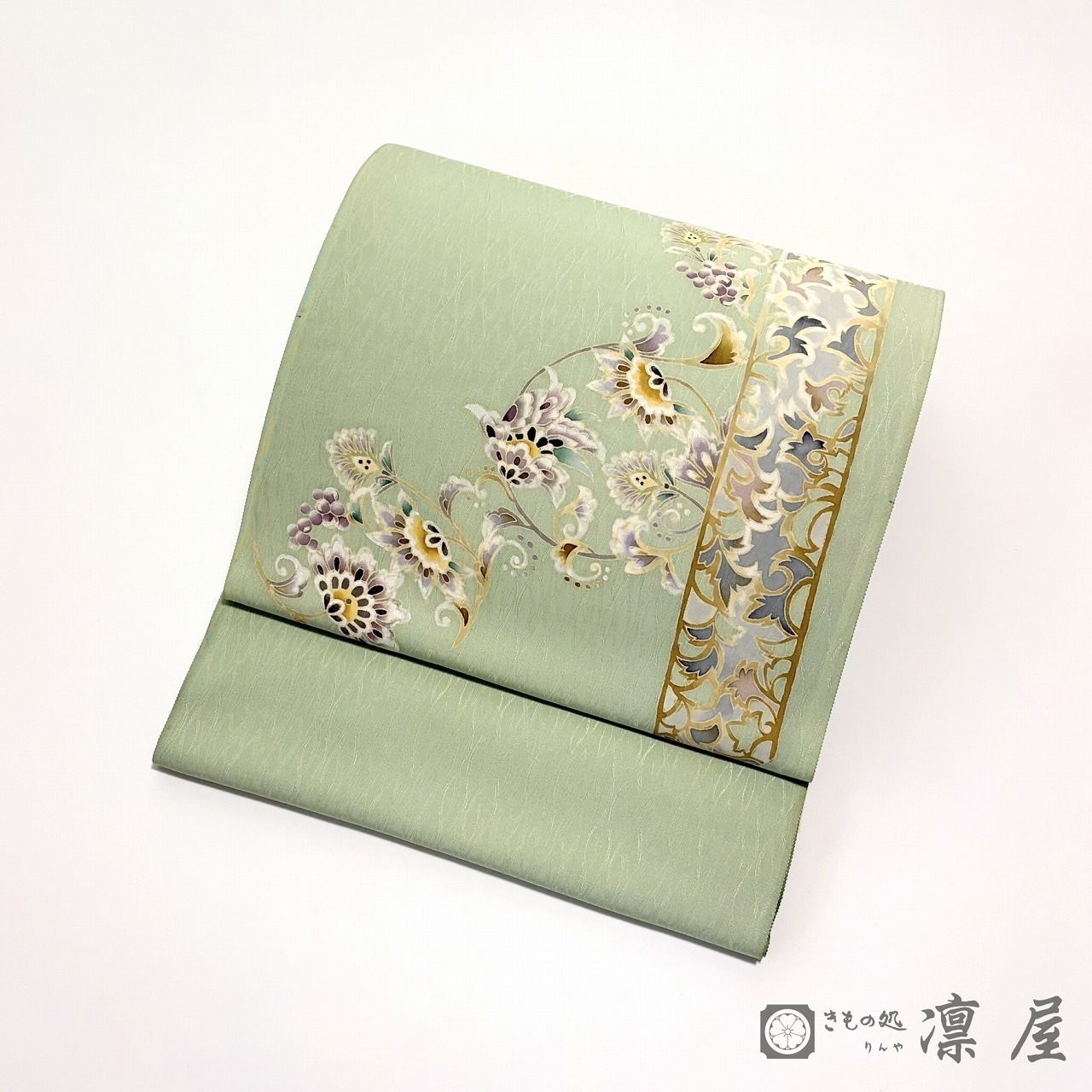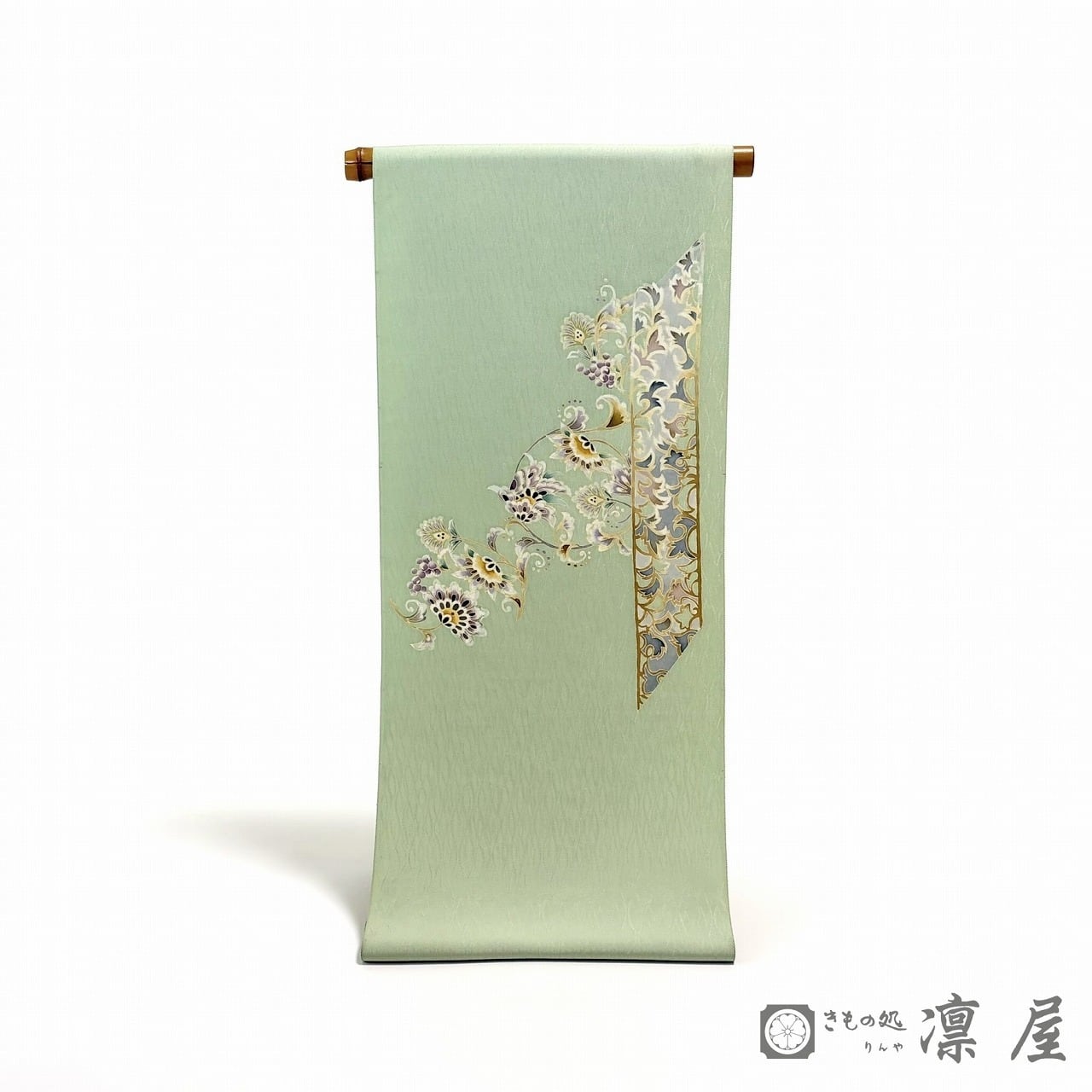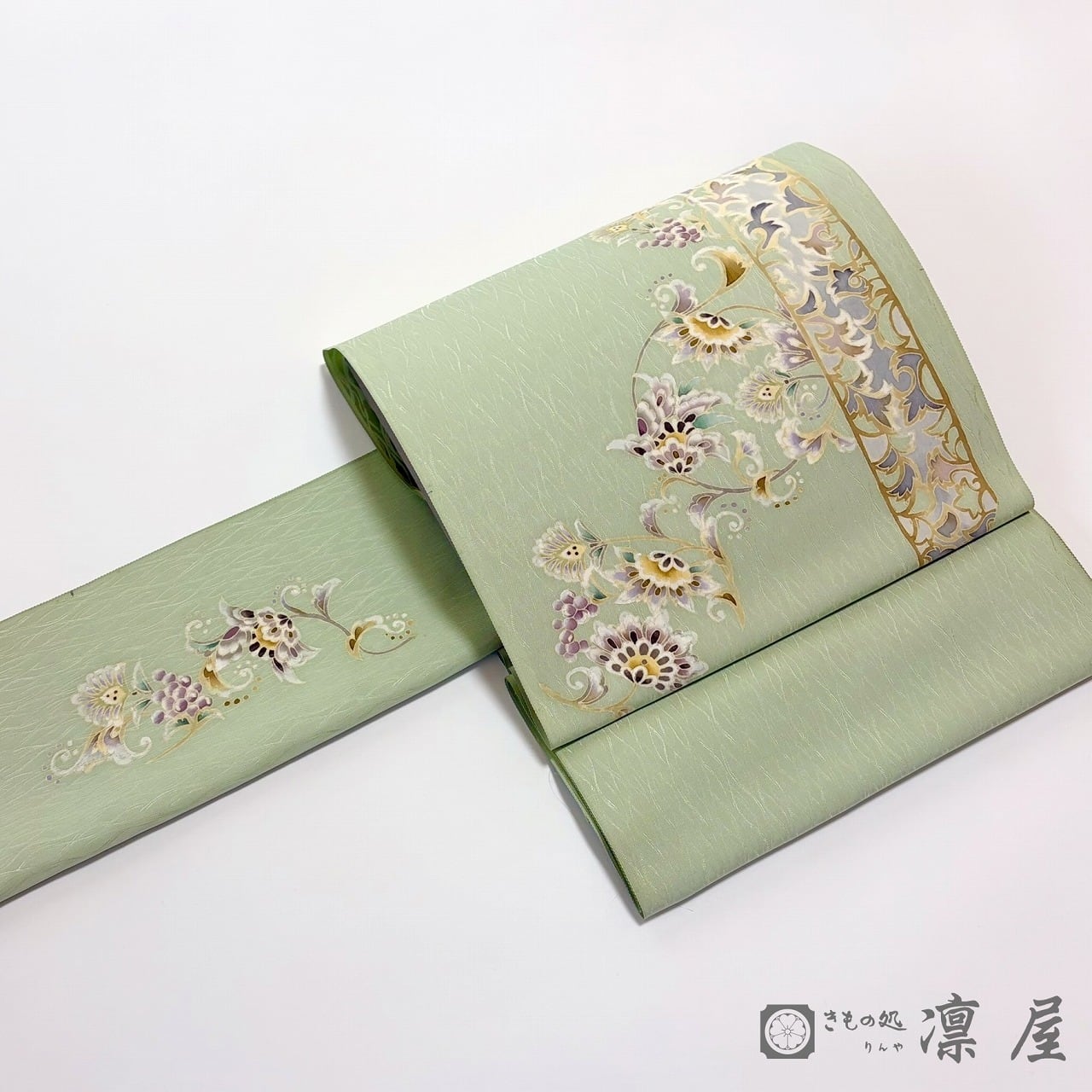 落ち着きある若葉色の地色に、天平文様からの葡萄唐草を主軸とした東西の香りが漂う吉村氏独特の柄が繊細な彩色が映え、流れるような柄の紋意匠縮緬のゆらゆらとした艶が、幻想的な柄をより一層引き立てています。