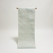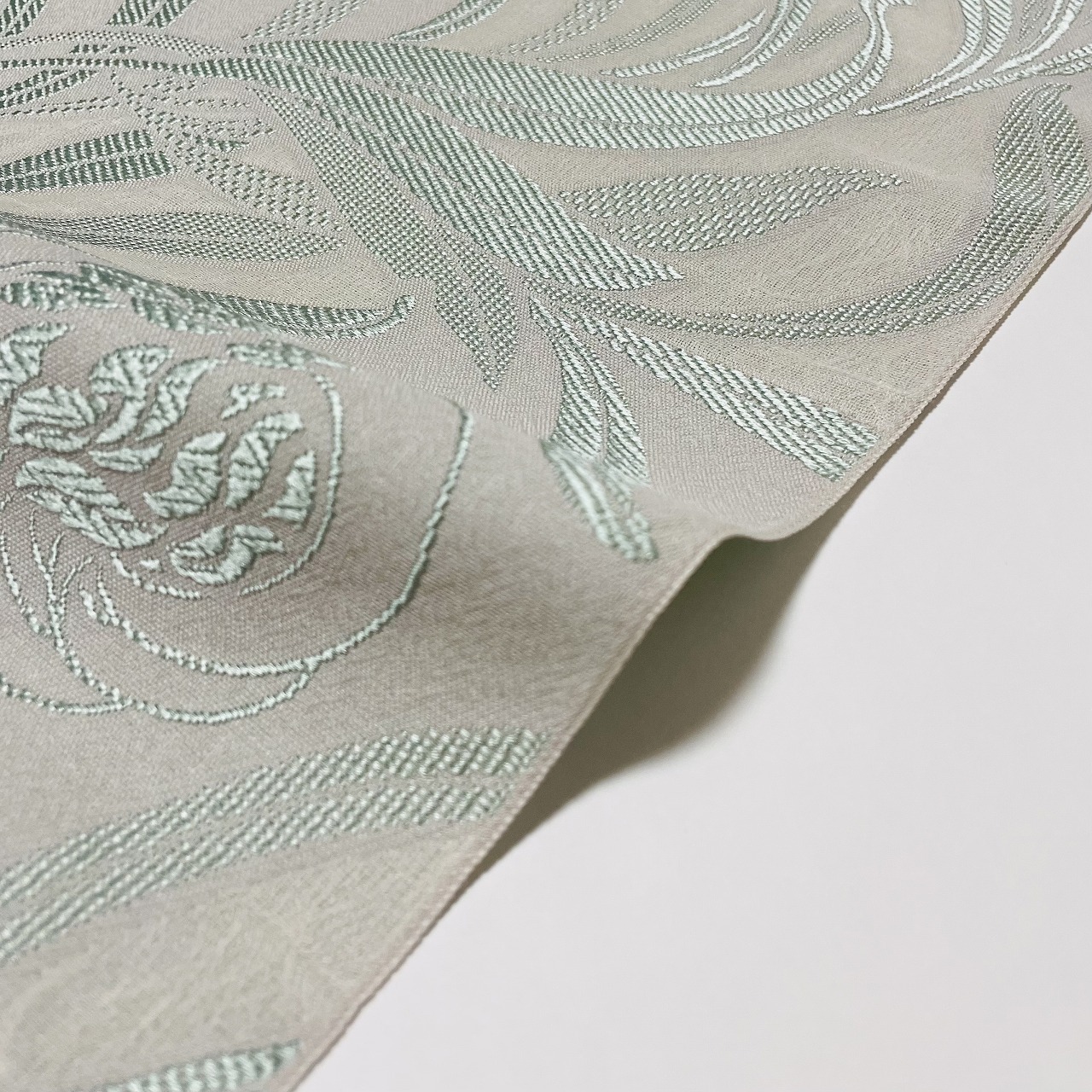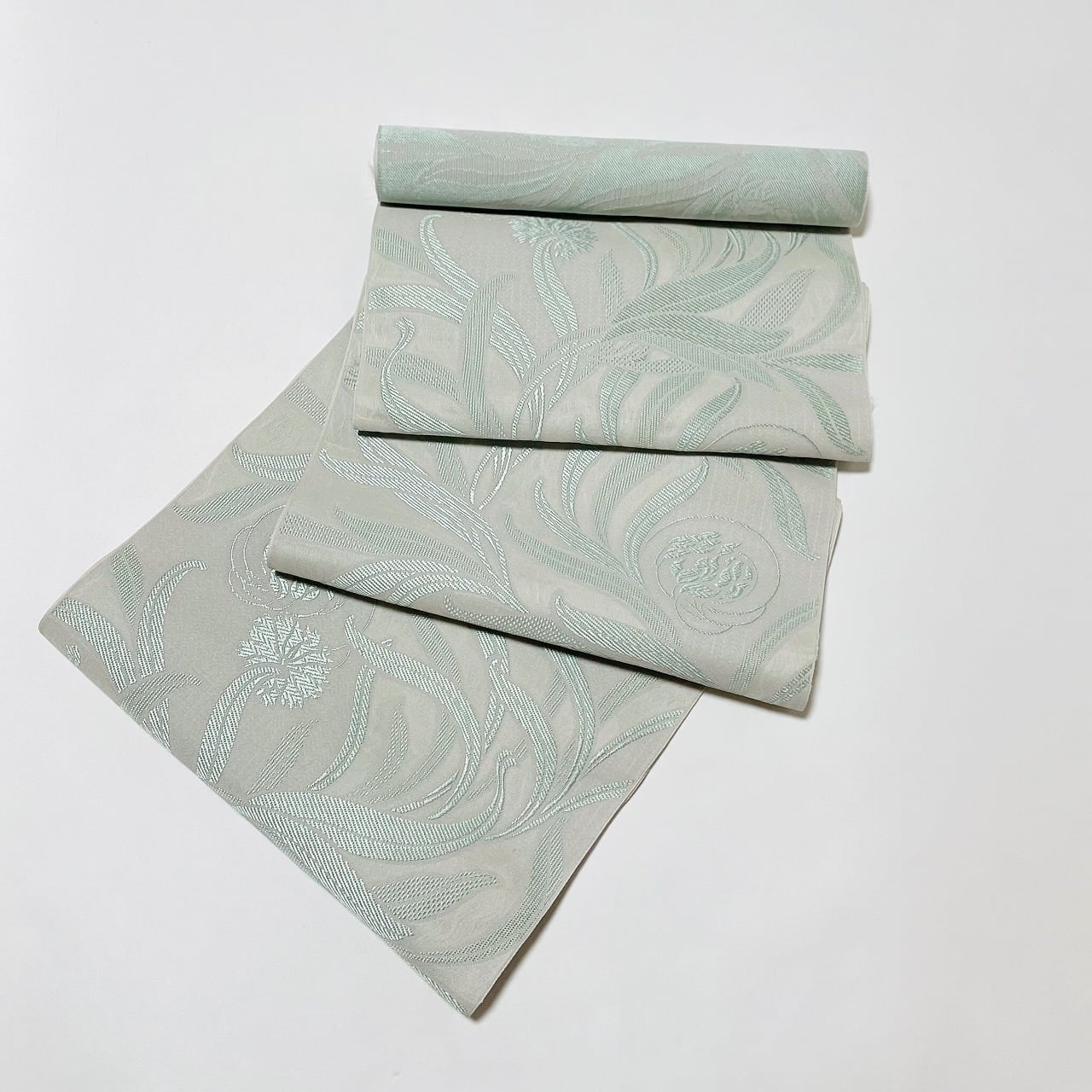 ごく淡い白練色の地に、爽やかな裏葉柳色で植物が織り出されたボタニカルなムードの名古屋帯です。落ち着いた品の良い色合いは合わせやすく重宝しそう。小紋や紬に。