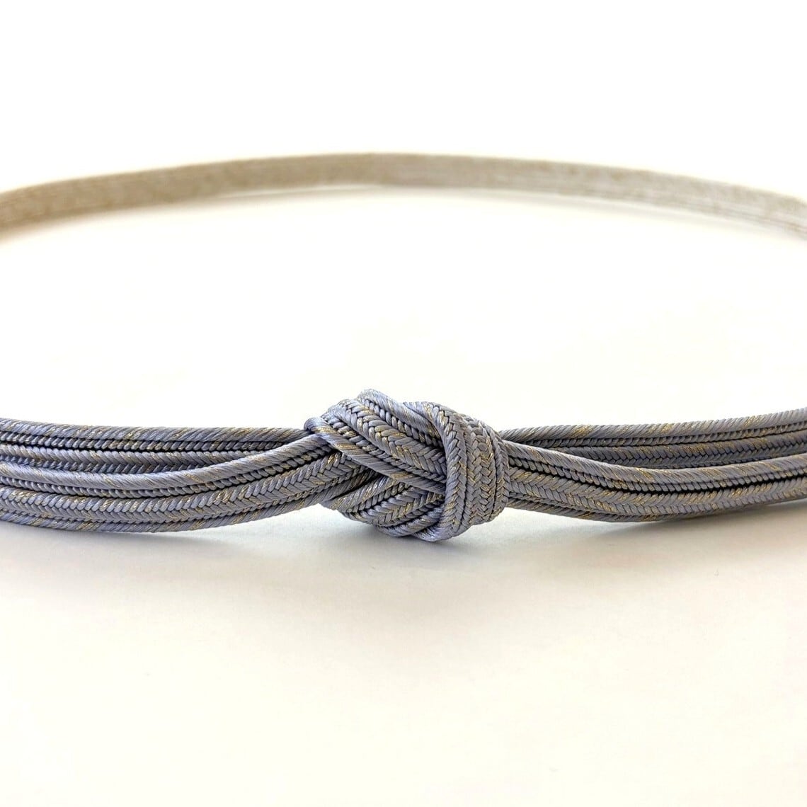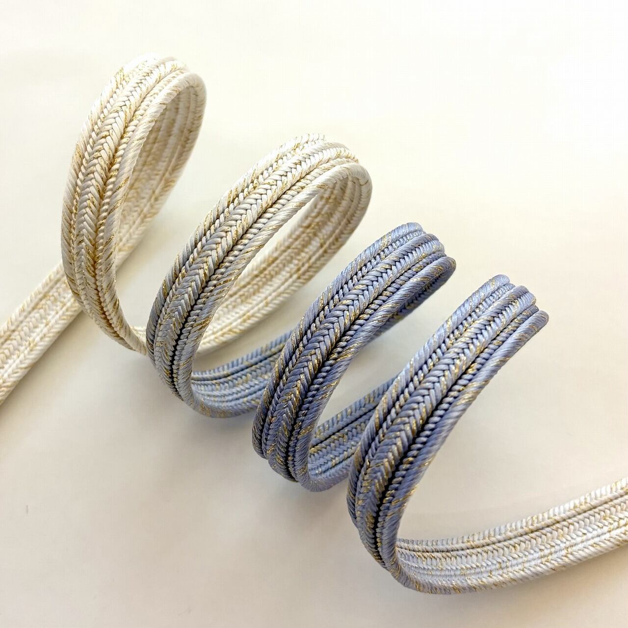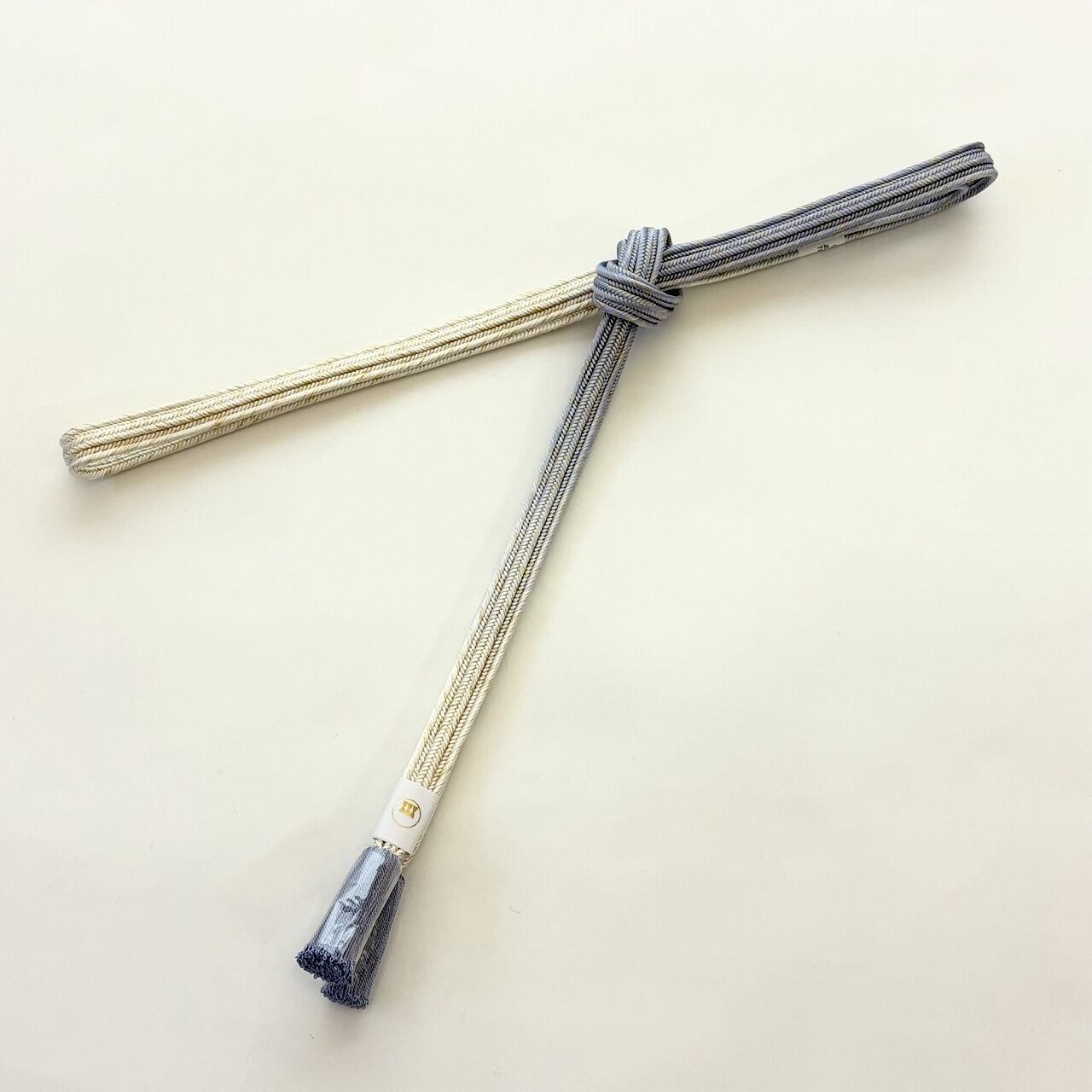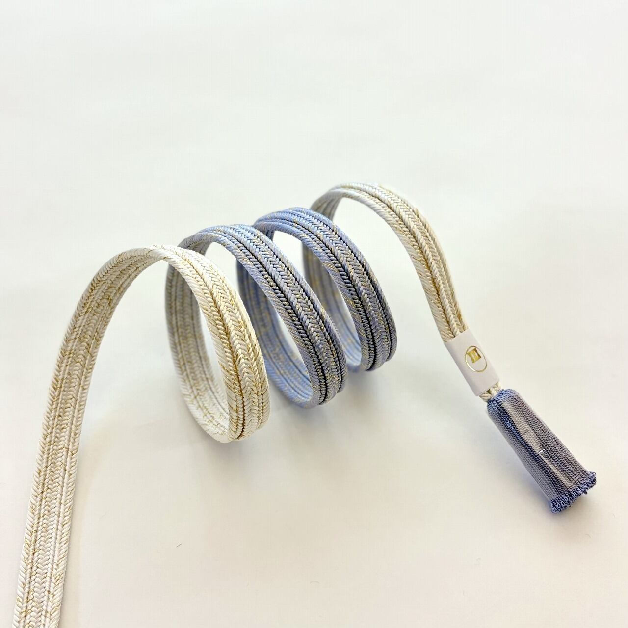 締めた時に前腹に出る部分と撚り房にはメインカラーが、そして背になる部分と先端に向けて白地へとぼかされています。畝打組の立体感のあるしっかりとした組みで格調高く、フォーマルな装いに重宝いたします。