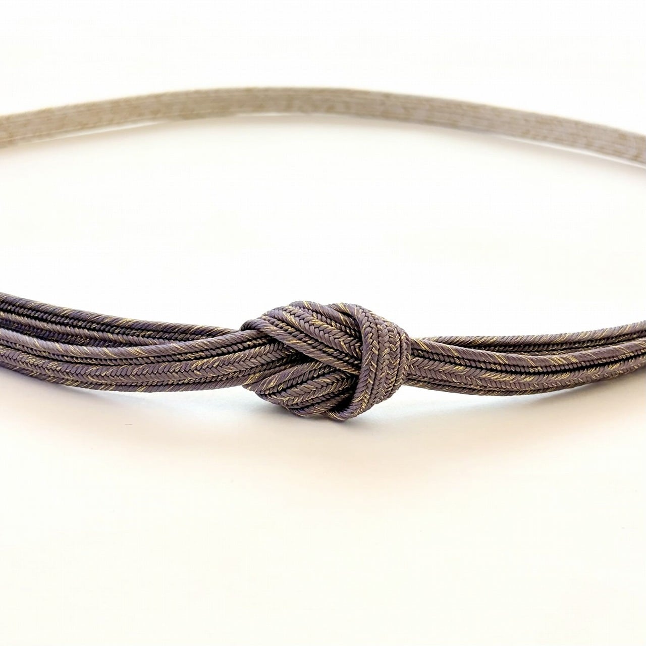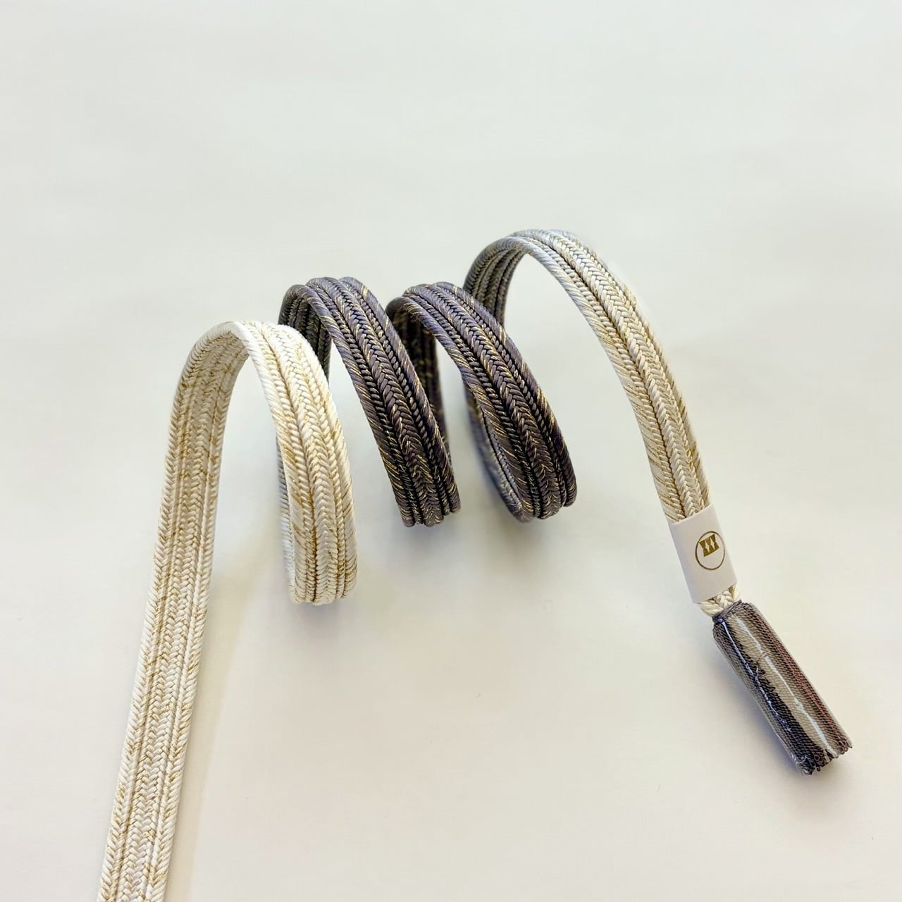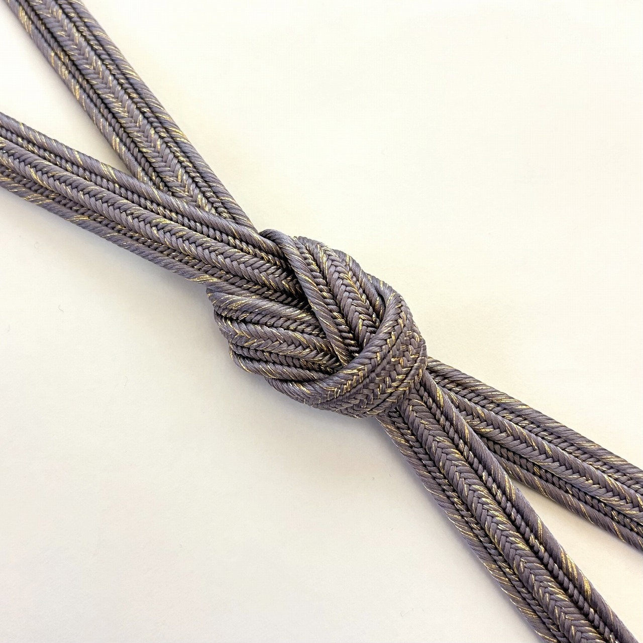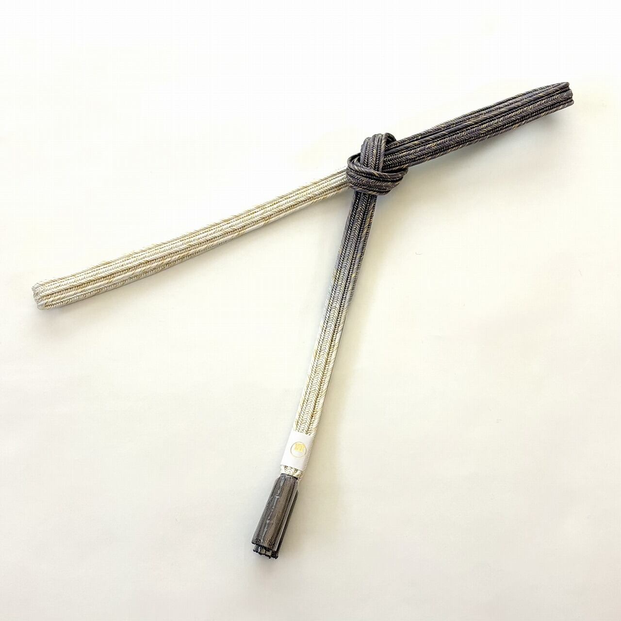 締めた時に前腹に出る部分と撚り房にはメインカラーが、そして背になる部分と先端に向けて白地へとぼかされています。畝打組の立体感のあるしっかりとした組みで格調高く、フォーマルな装いに重宝いたします。