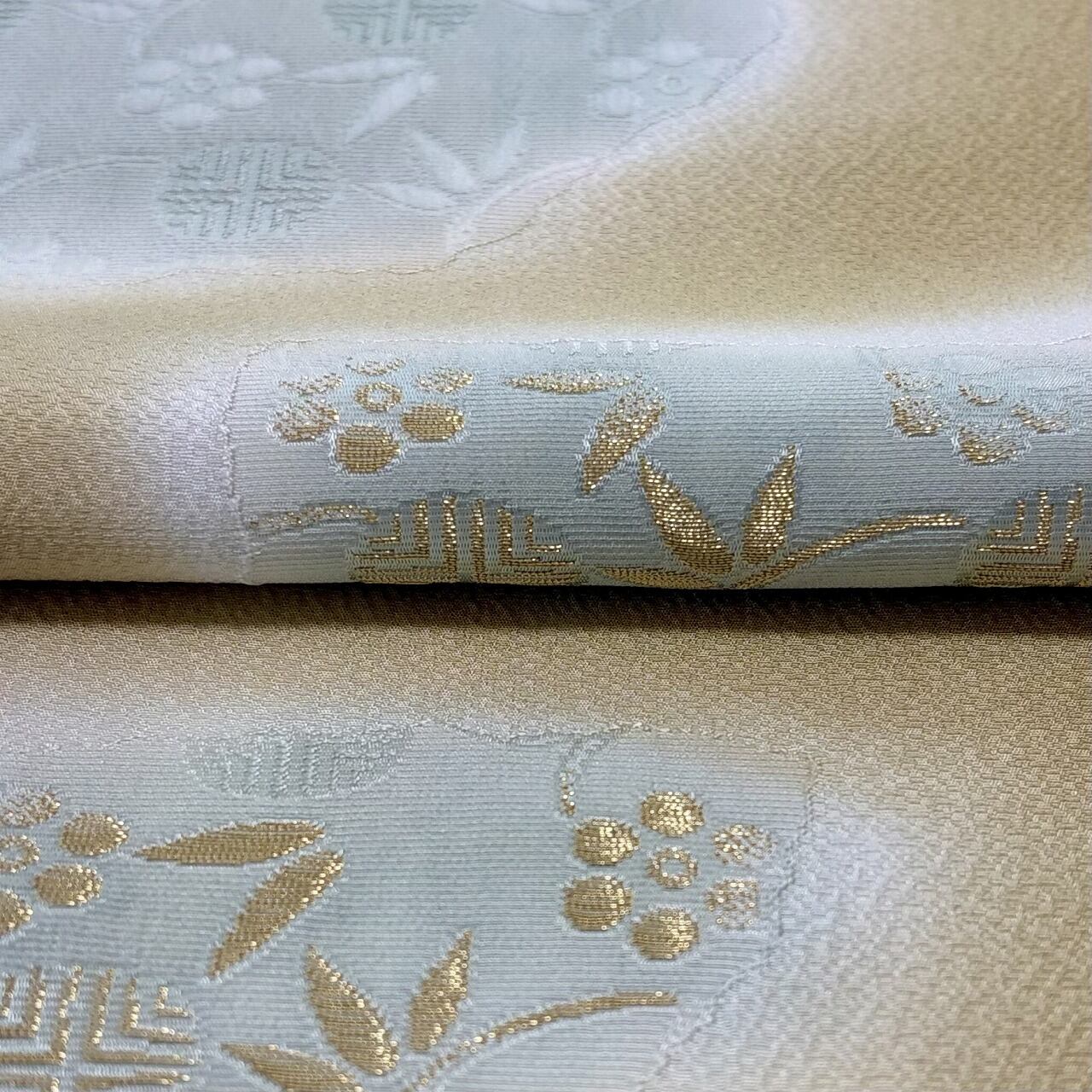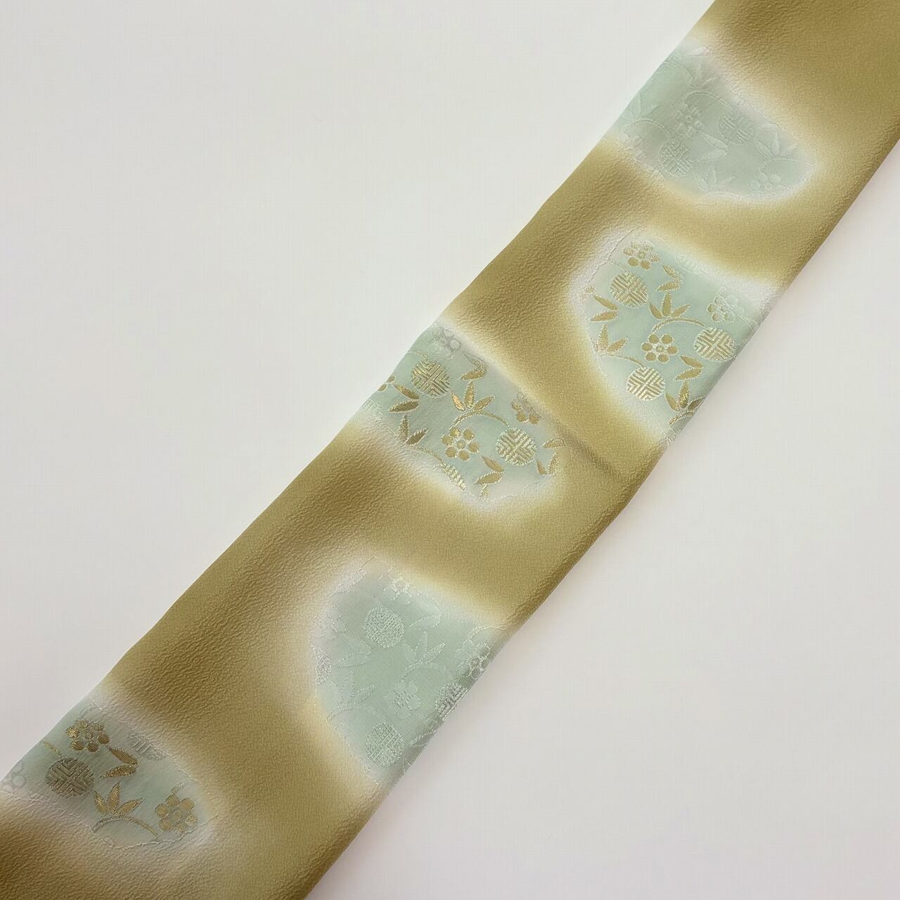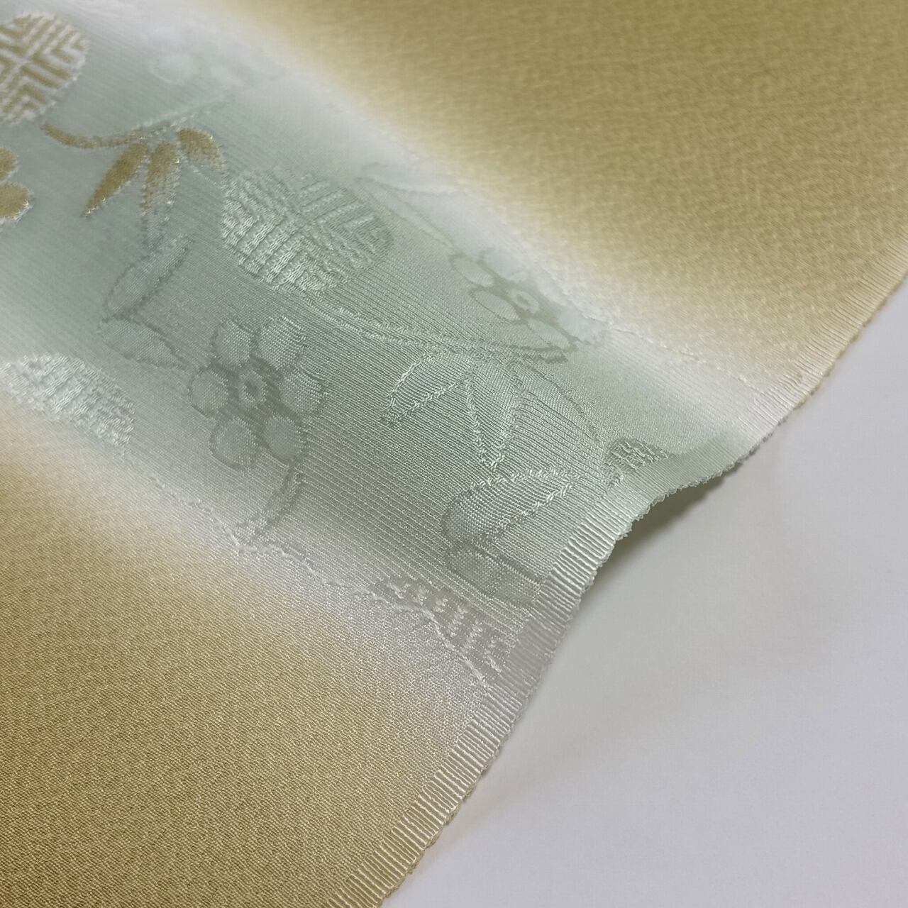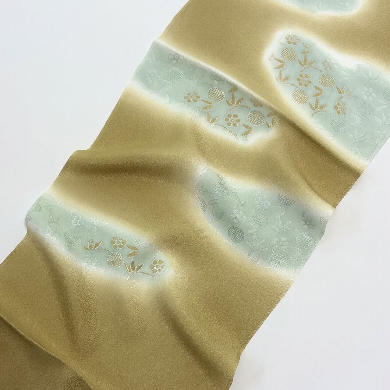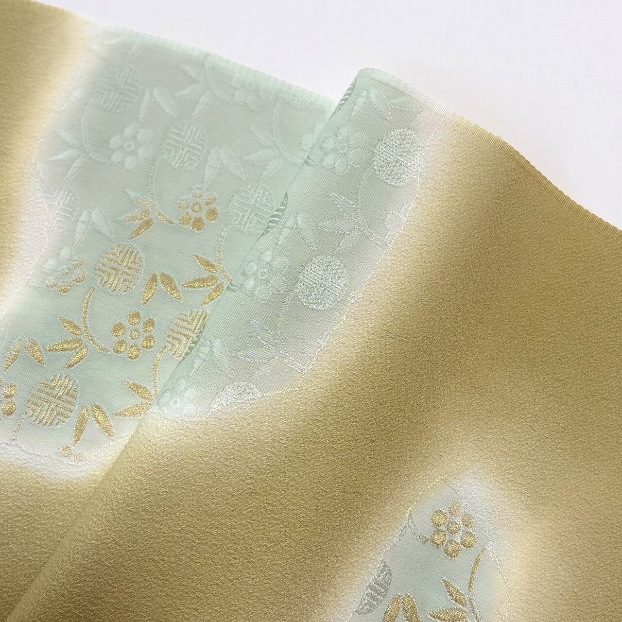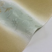 梅と笹蔓文様が金糸の縫取りで織り出された帯揚げです。