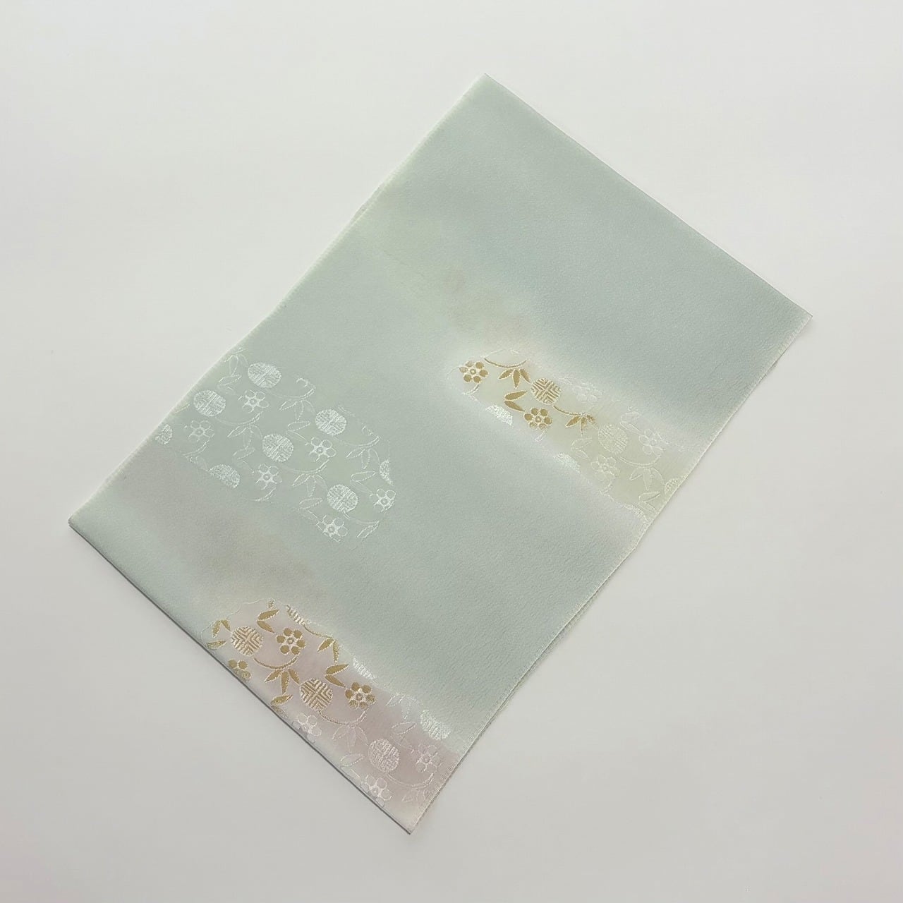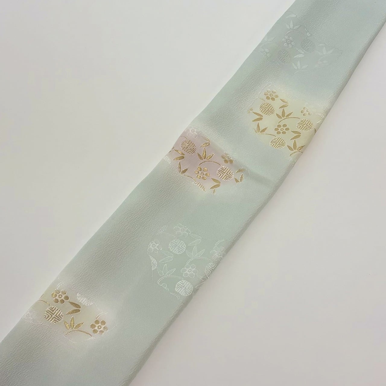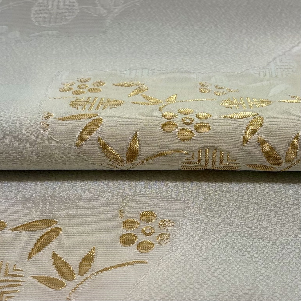 梅と笹蔓文様が金糸の縫取りで織り出された帯揚げです。