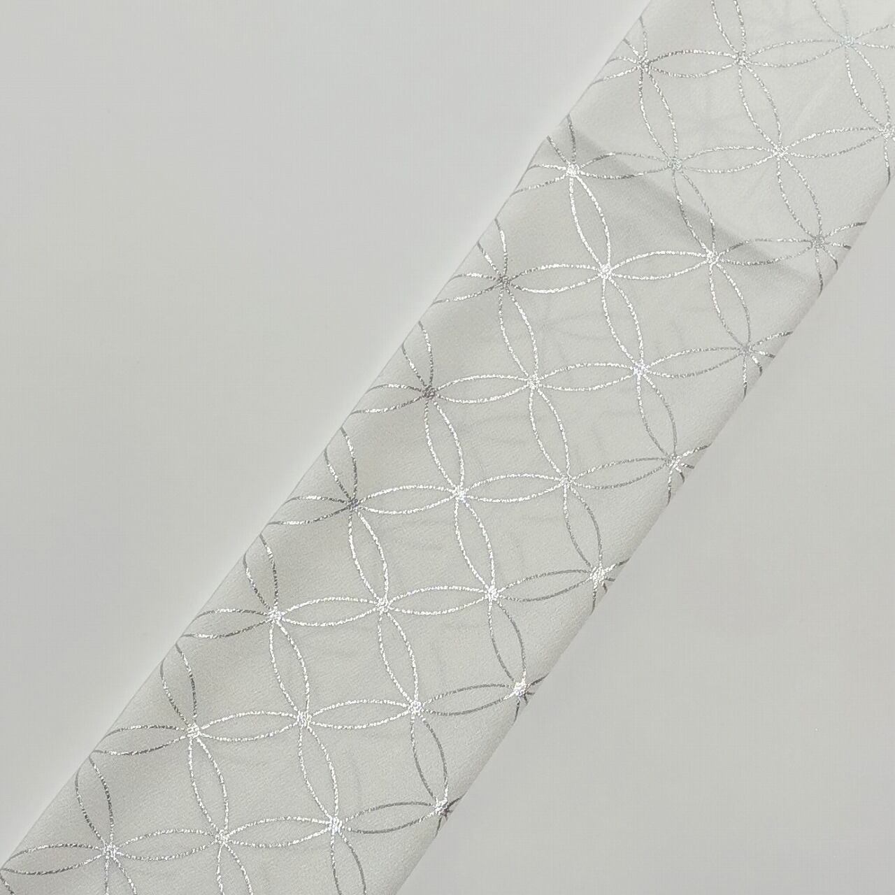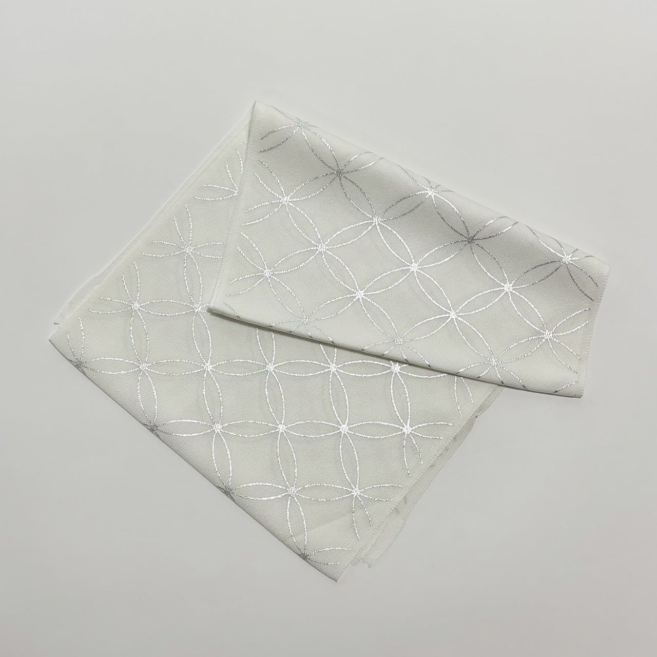 無地のちりめんに銀彩で七宝繋ぎが梅と笹蔓文様が金糸の縫取りで織り出された帯揚げです。