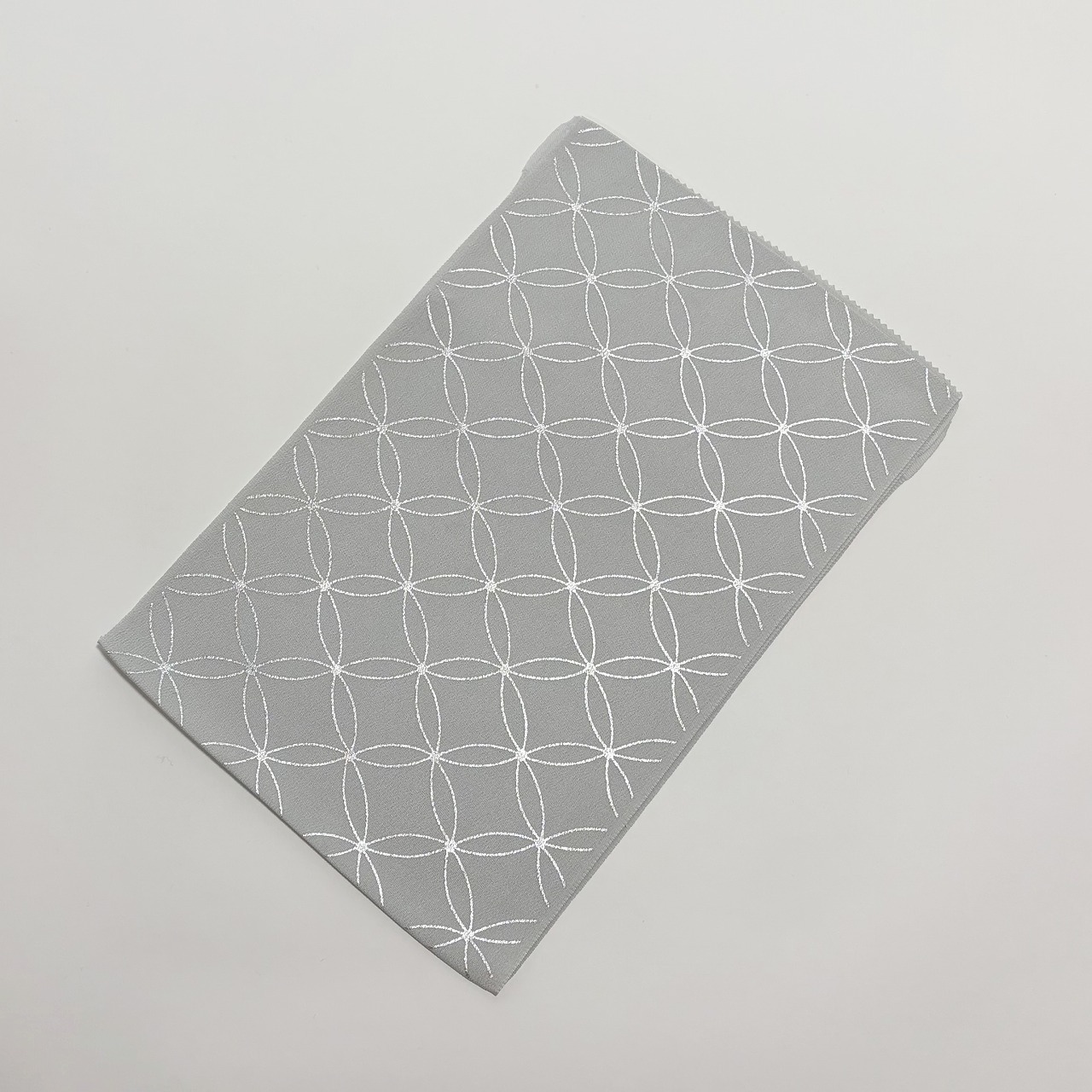 無地のちりめんに銀彩で七宝繋ぎが梅と笹蔓文様が金糸の縫取りで織り出された帯揚げです。