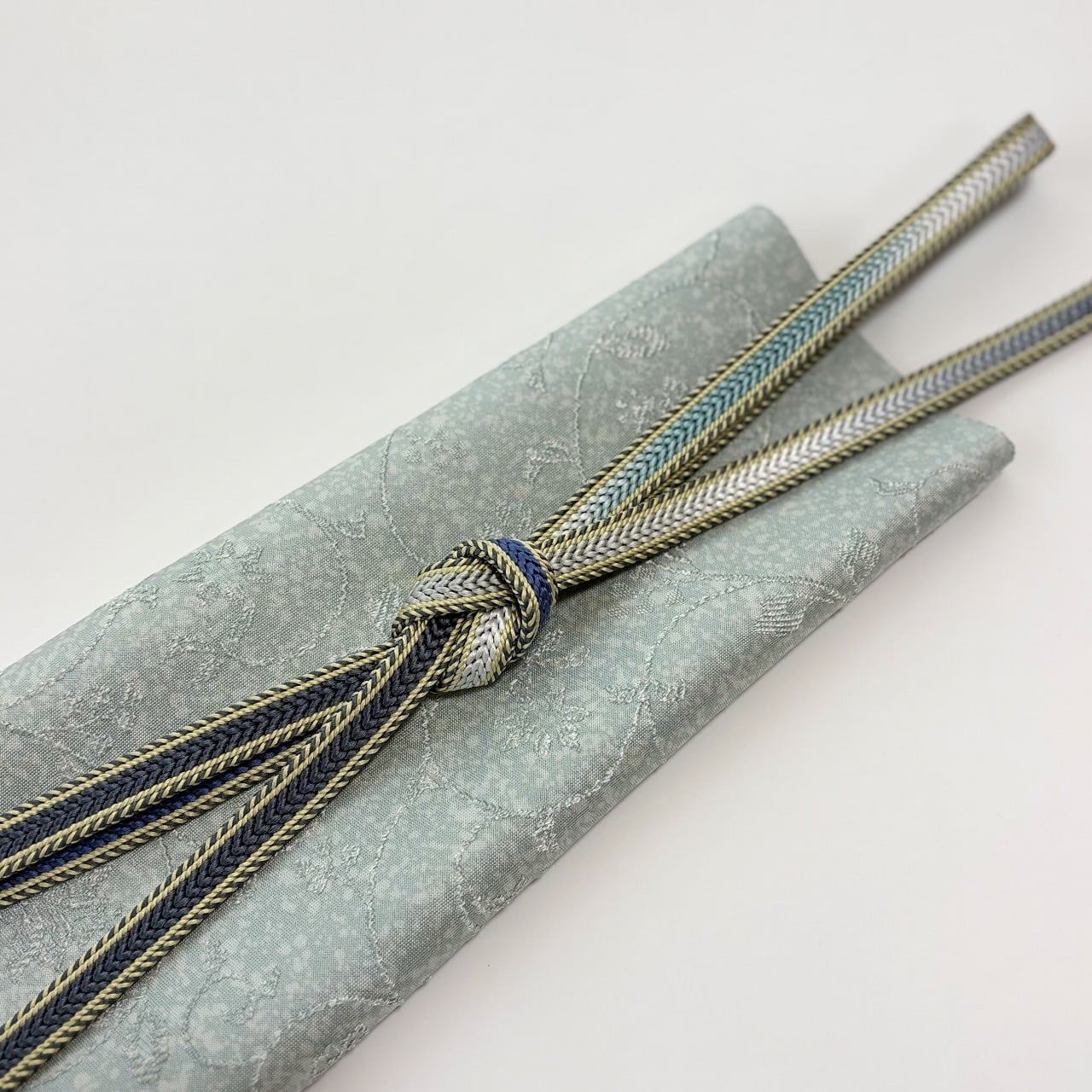 片側はくすみブルーグレー系の薄縹色のぼかしに鮮やかなミントグリーンのアクセント、n波組のリバーシブル帯締めです。