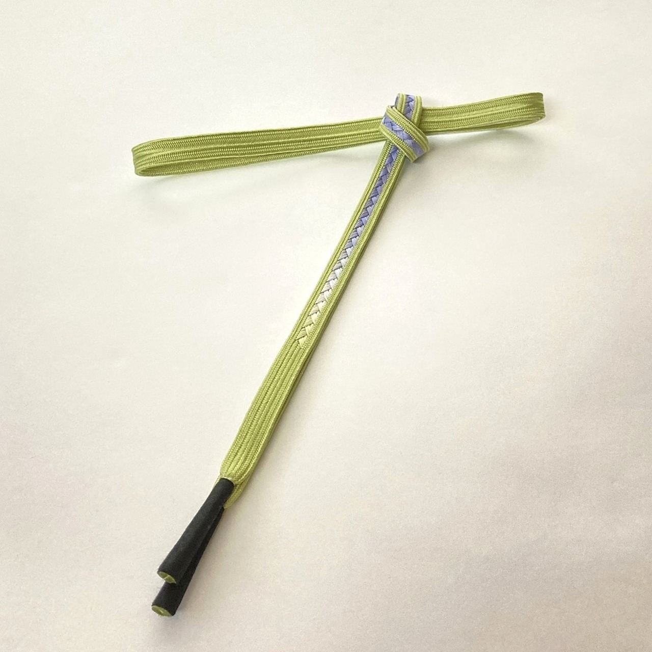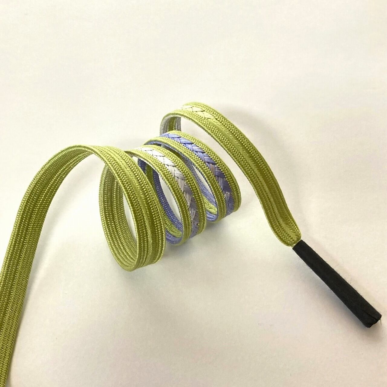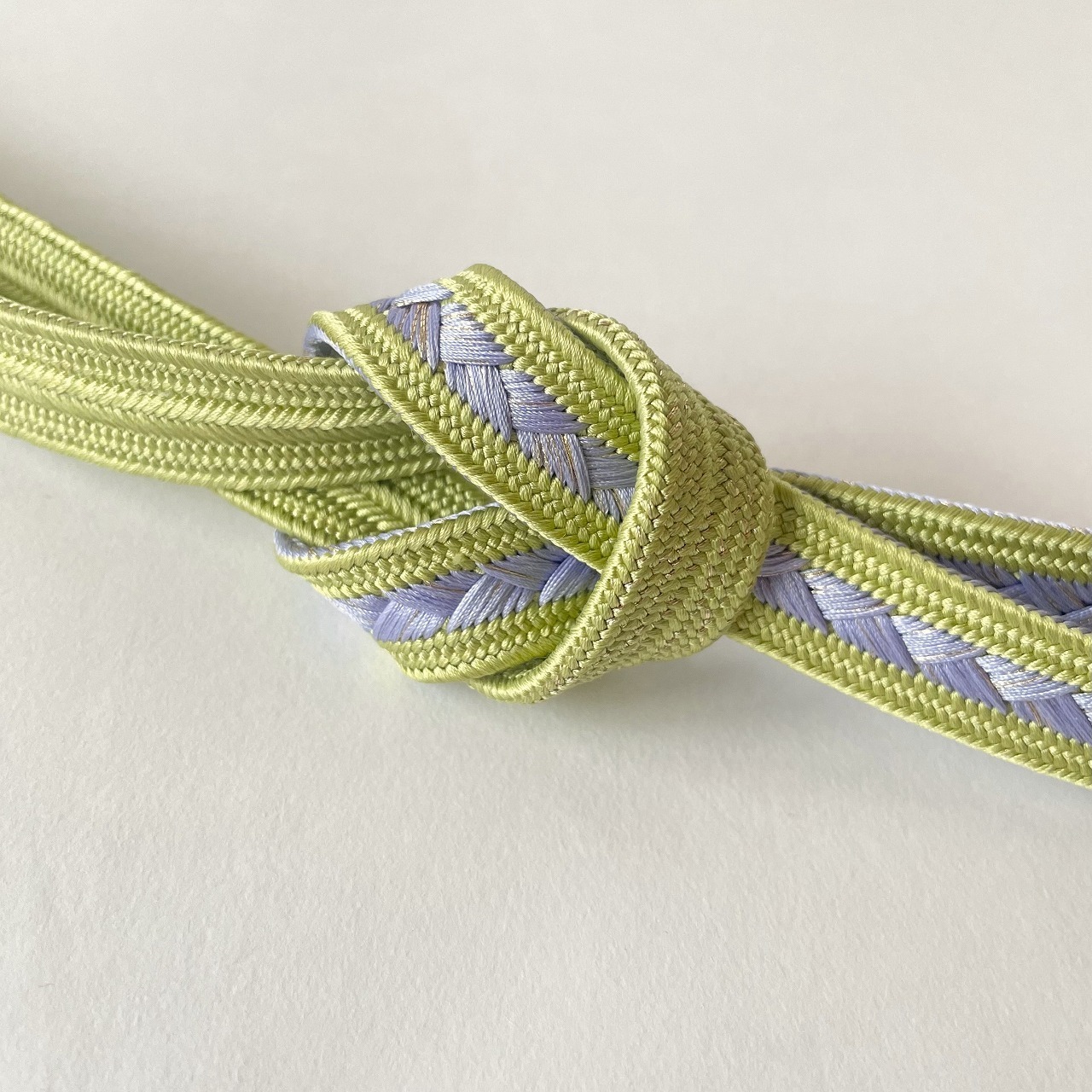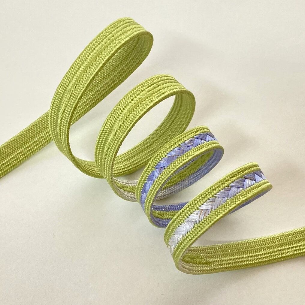鮮やかな鶸色の片側中央に藤色~青藤へとぼかしの入った目を惹く綺麗色の帯締めです。絹糸一本一本が感じられる束感のある組が美しいですね。さりげなく全体に散らされた金がチラチラと控えめに光ります。