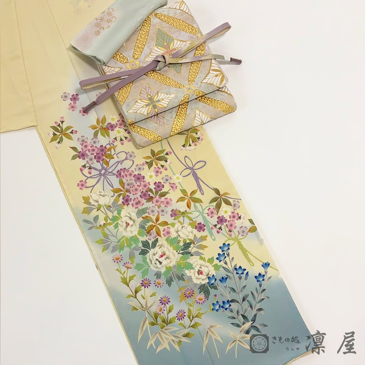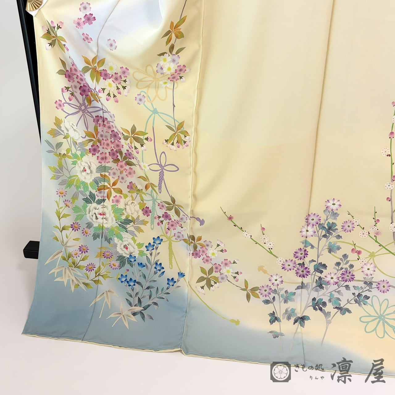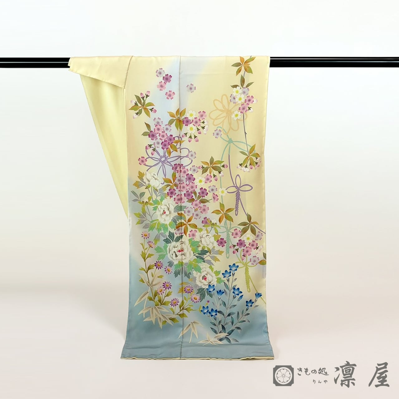 明るい刈安色の地色に、浅縹色といった落ち着きある灰みがかったブルーの裾ぼかし。