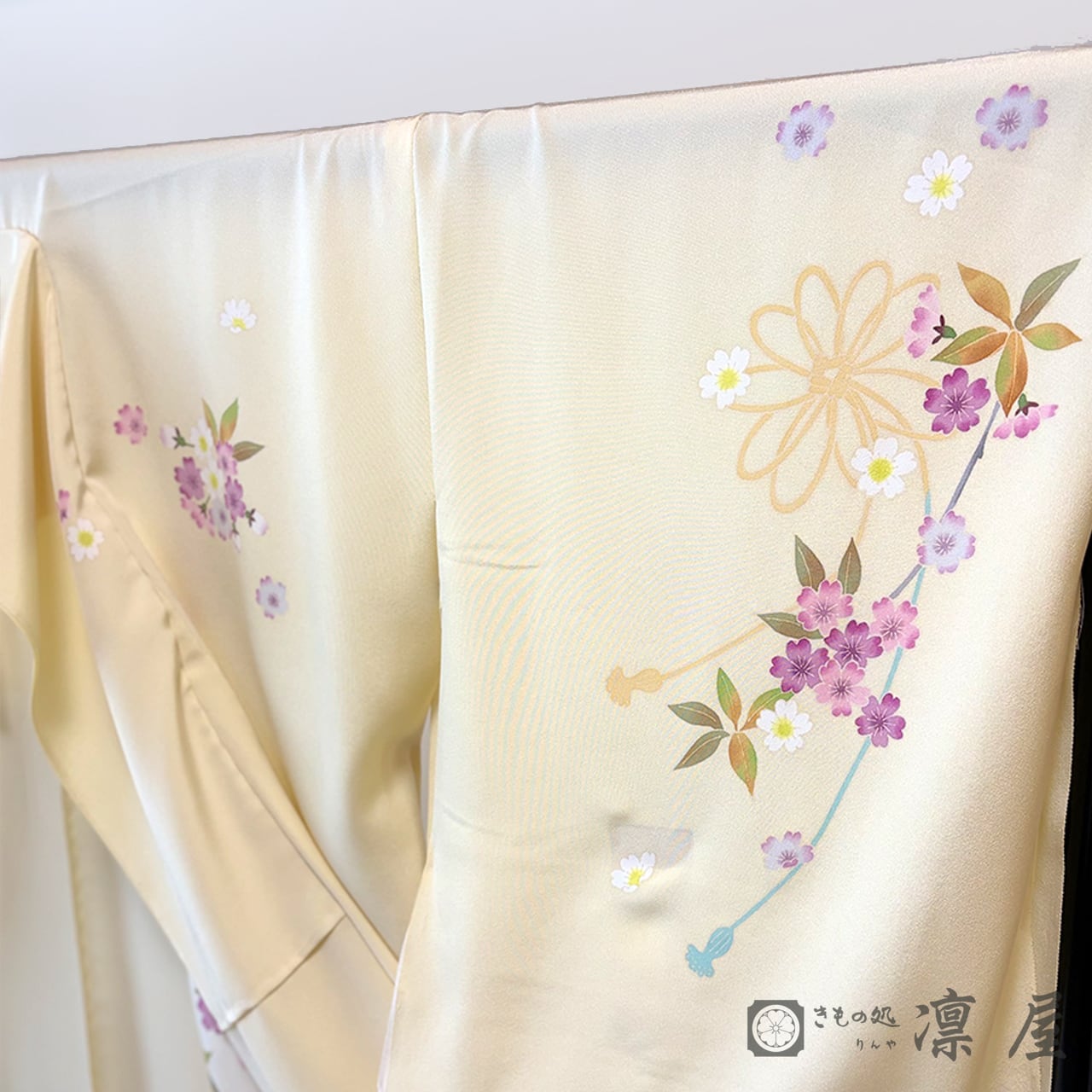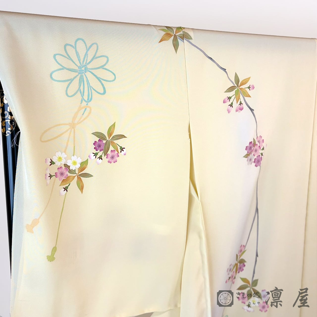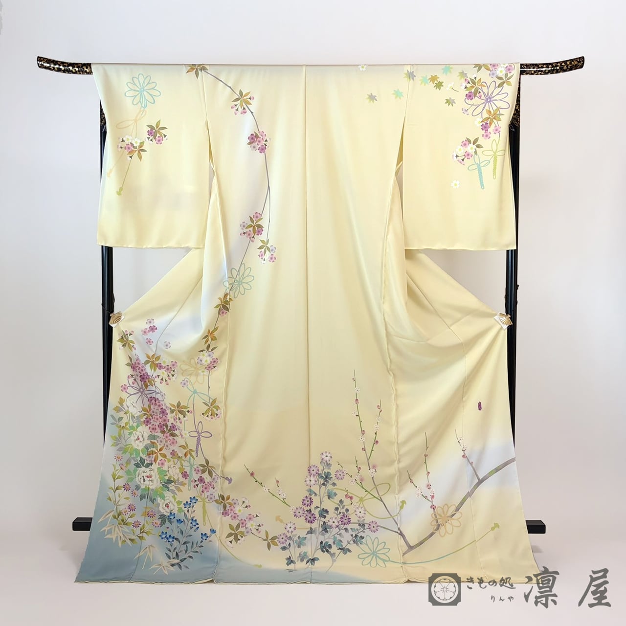 明るい刈安色の地色に、浅縹色といった落ち着きある灰みがかったブルーの裾ぼかし。