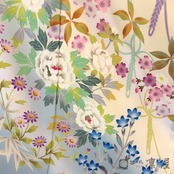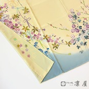 本作は柔らかな桜の枝を主軸に、牡丹、菊、笹、桔梗、梅、青楓、といった四季を巡る草花が伝統的な琳派の表現で描かれています。咲き誇る花々は大変色彩豊かに染めあげられ、鮮やかな花の美しさと加賀友禅らしさが溢れます。