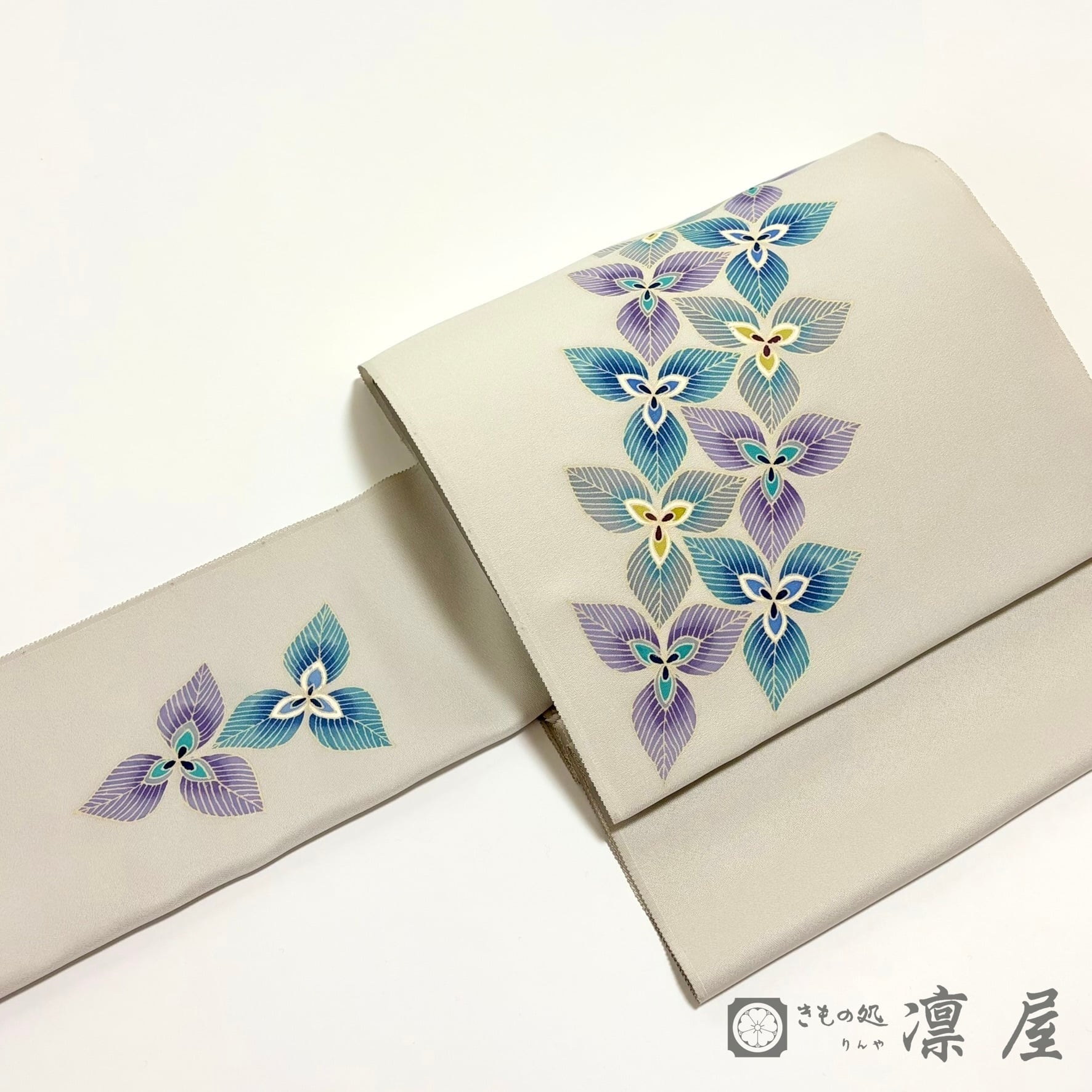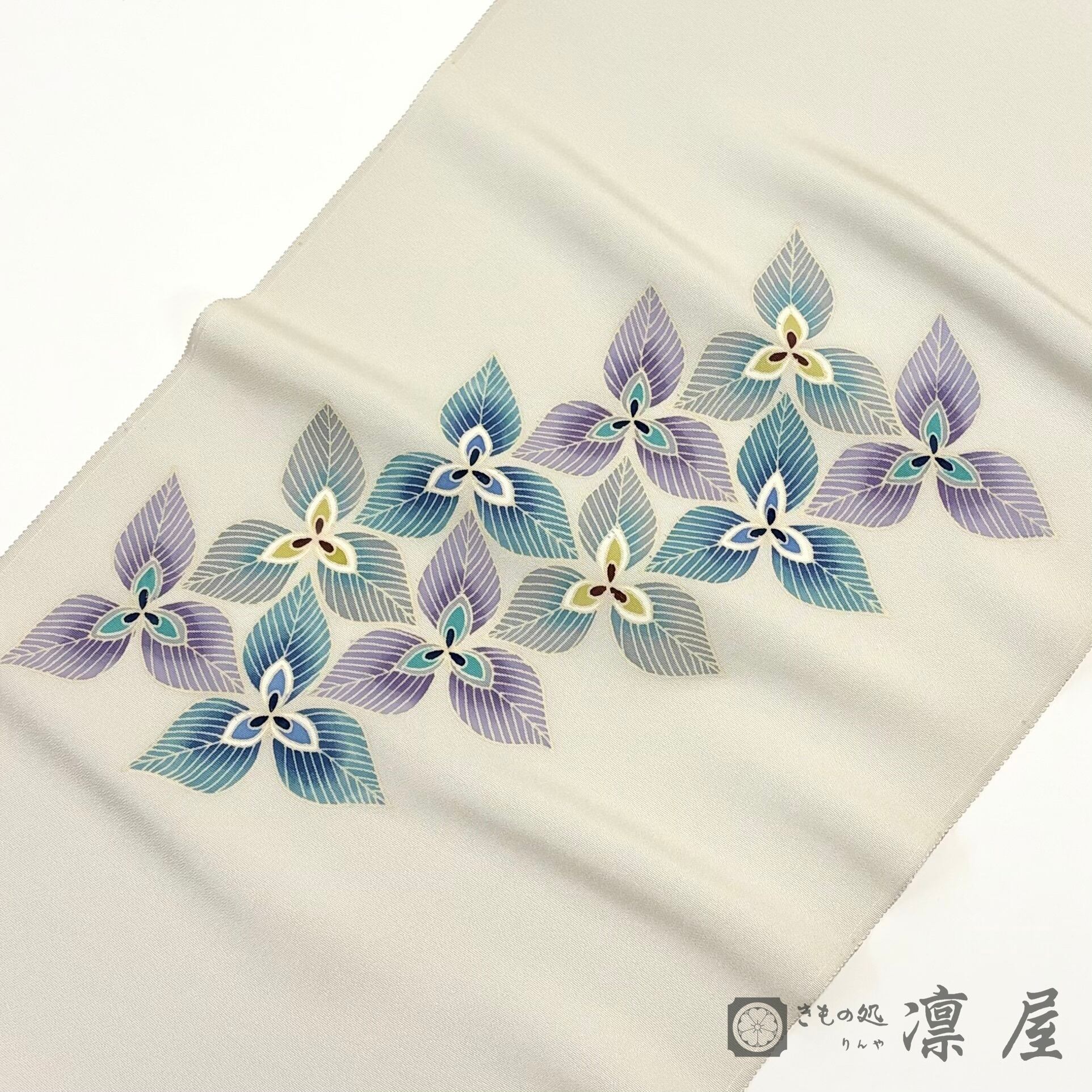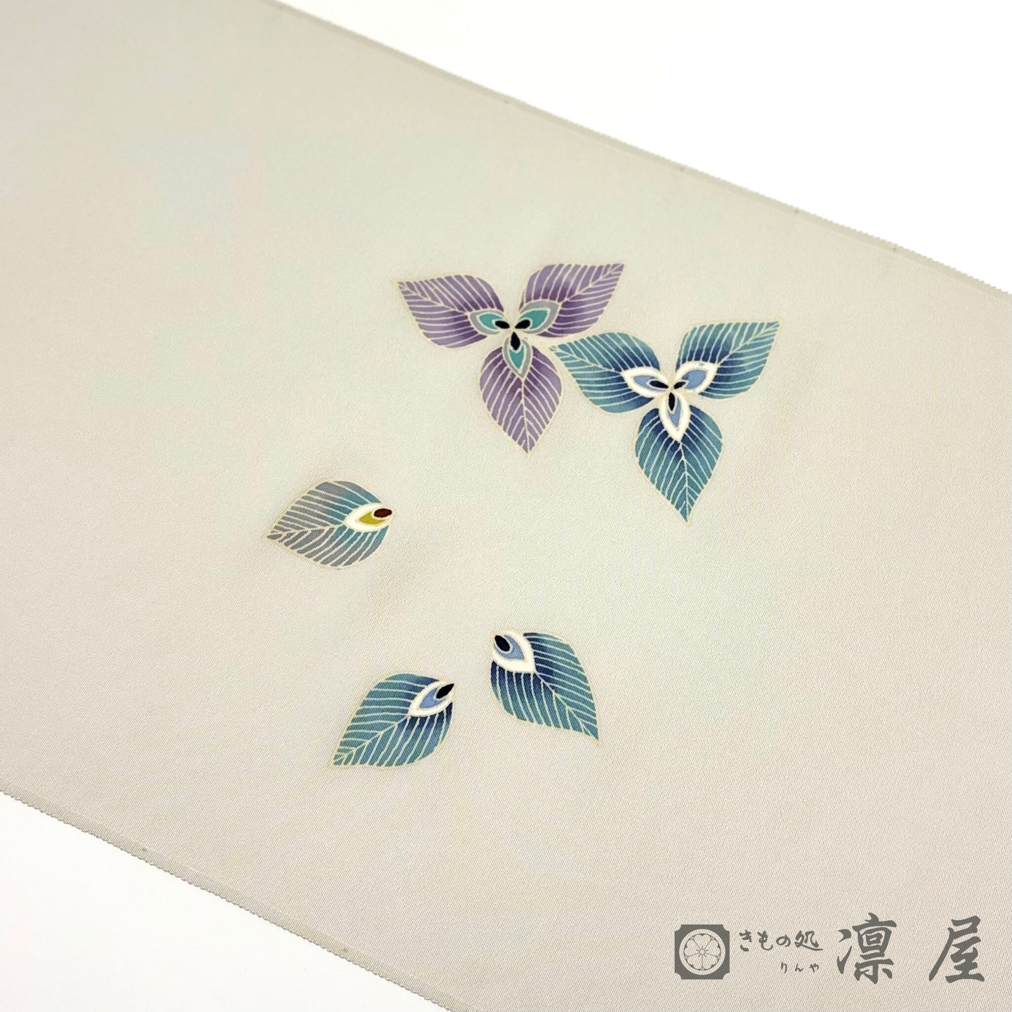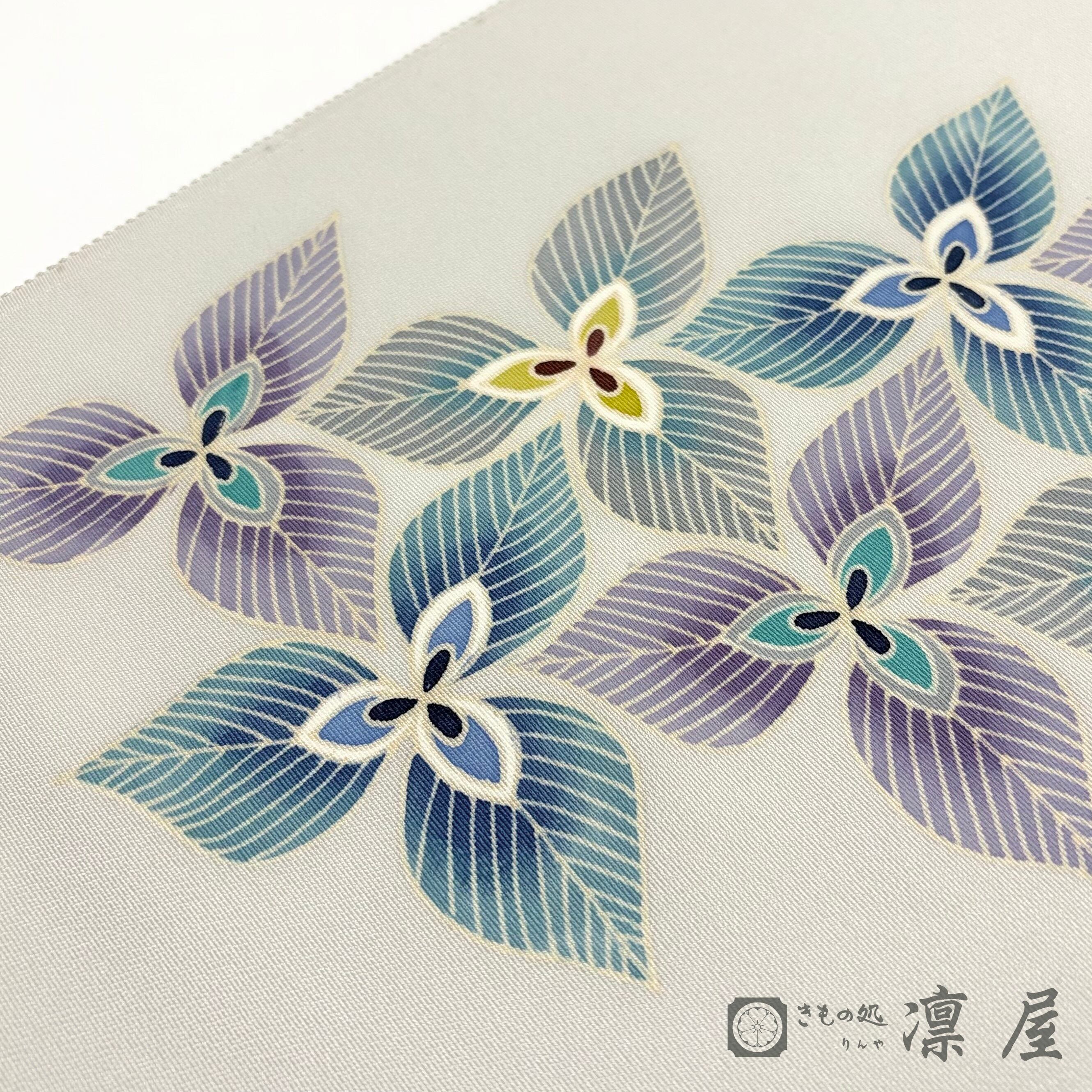 白鼠色の地色に、エンレイソウのような3枚の花弁の花が流れをもって描かれています。絶妙なグレーの背景に青緑~紫系の統一感ある色調で染められた意匠化された花は、その花弁の繊細な花脈の表現が目を惹きます。