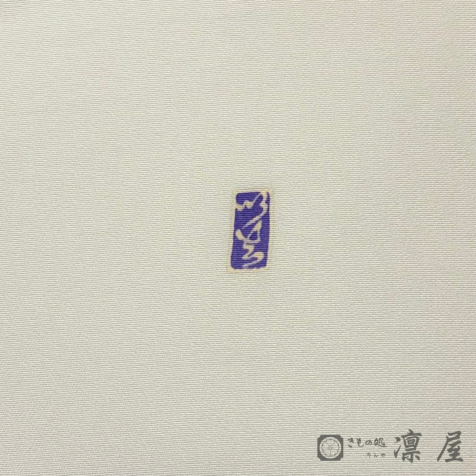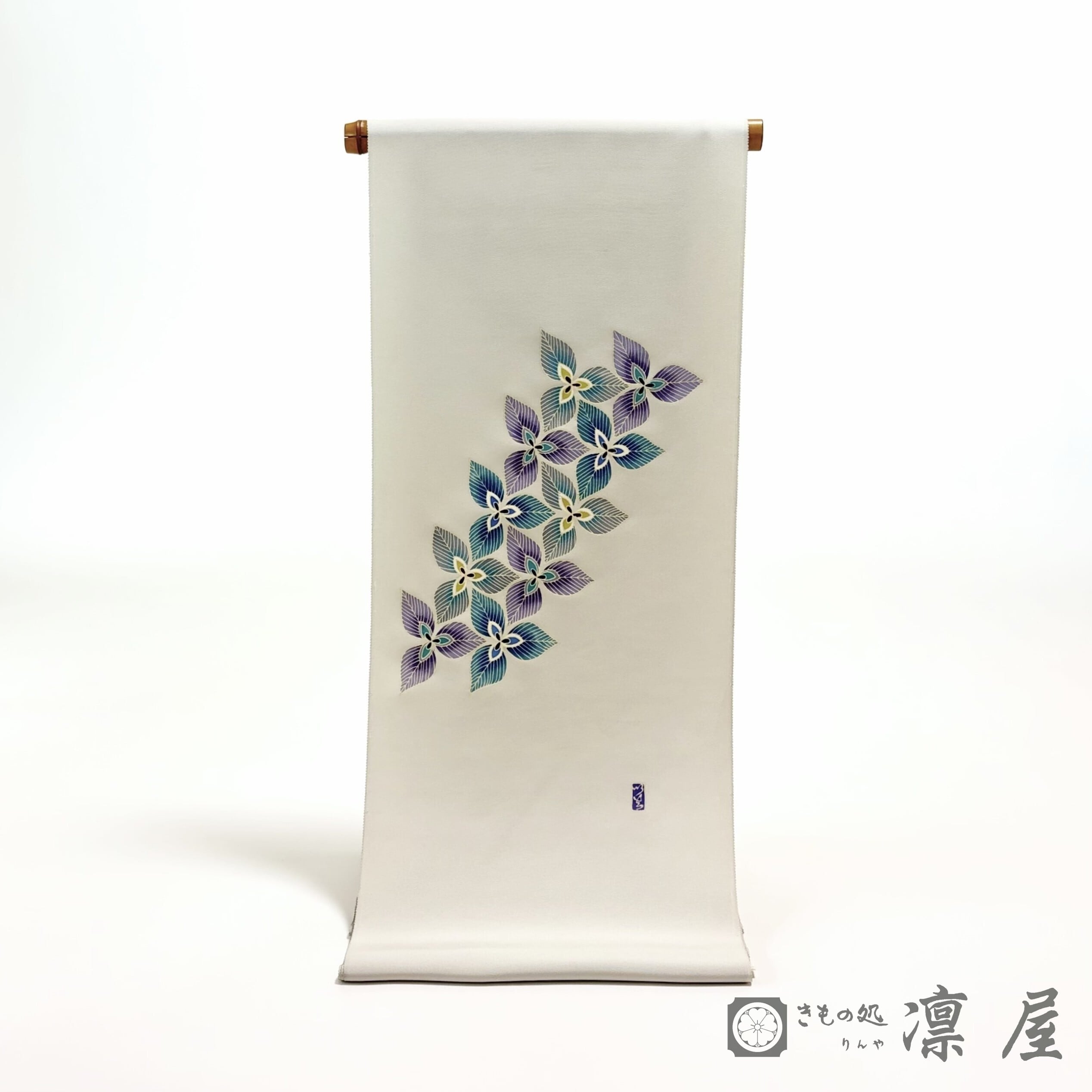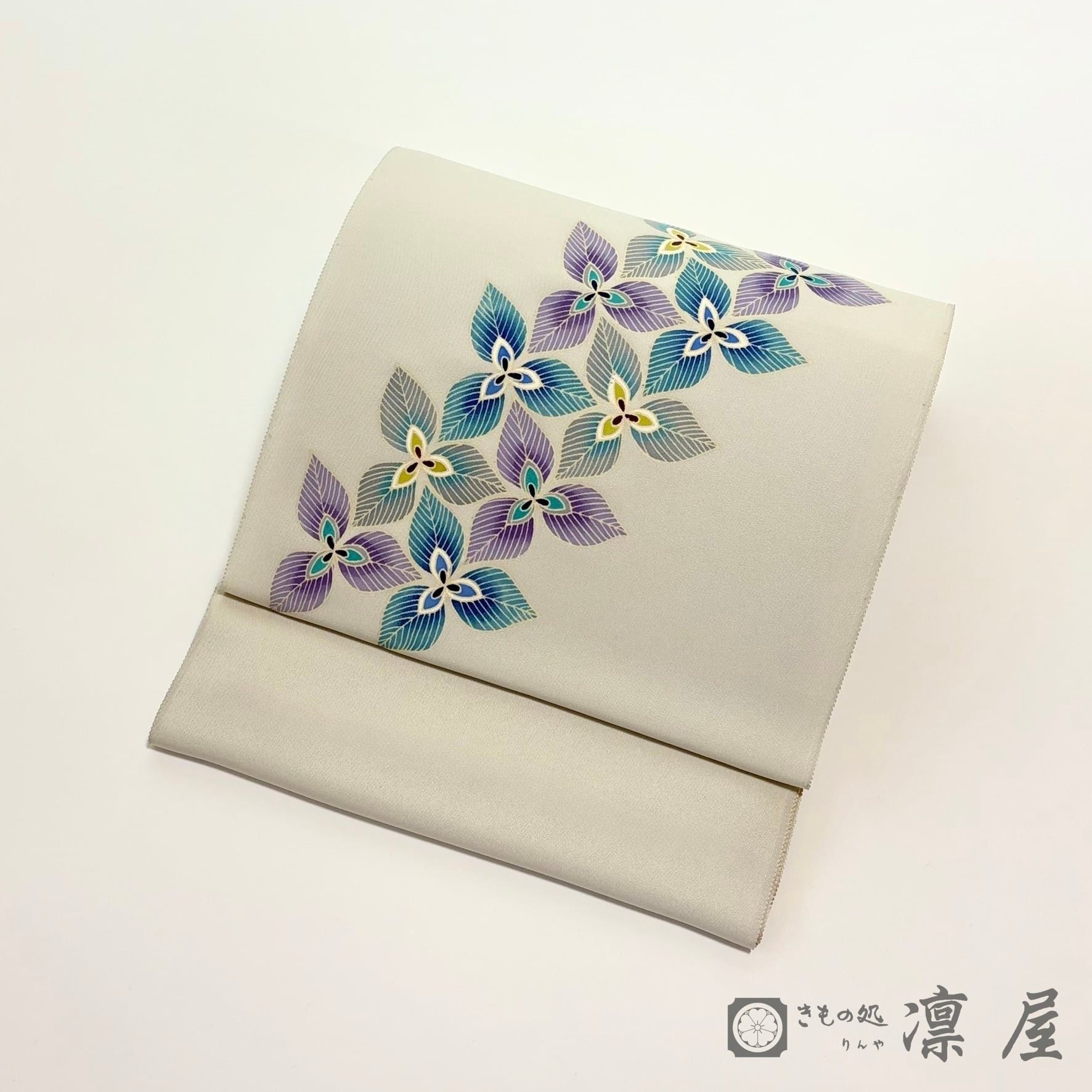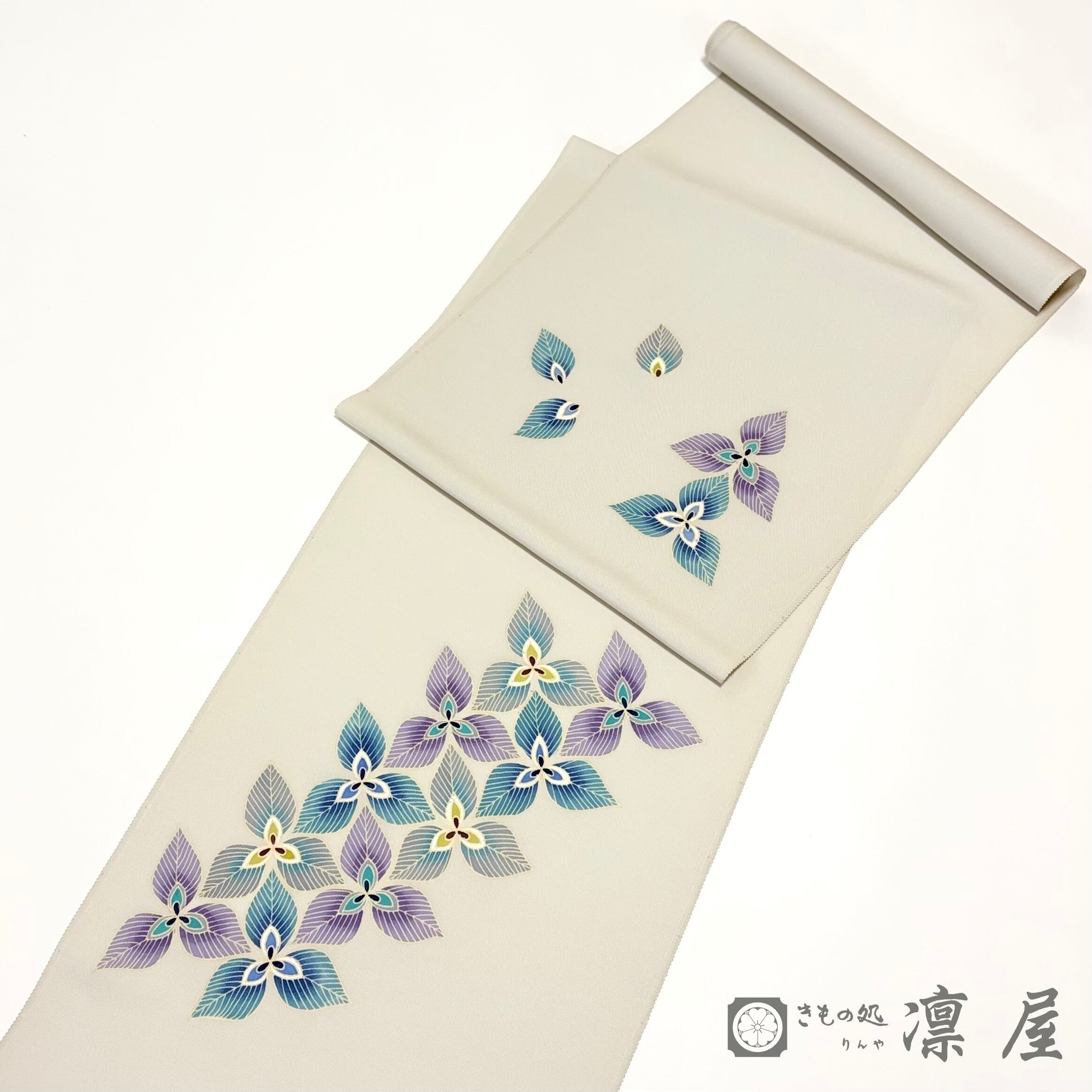 白鼠色の地色に、エンレイソウのような3枚の花弁の花が流れをもって描かれています。絶妙なグレーの背景に青緑~紫系の統一感ある色調で染められた意匠化された花は、その花弁の繊細な花脈の表現が目を惹きます。