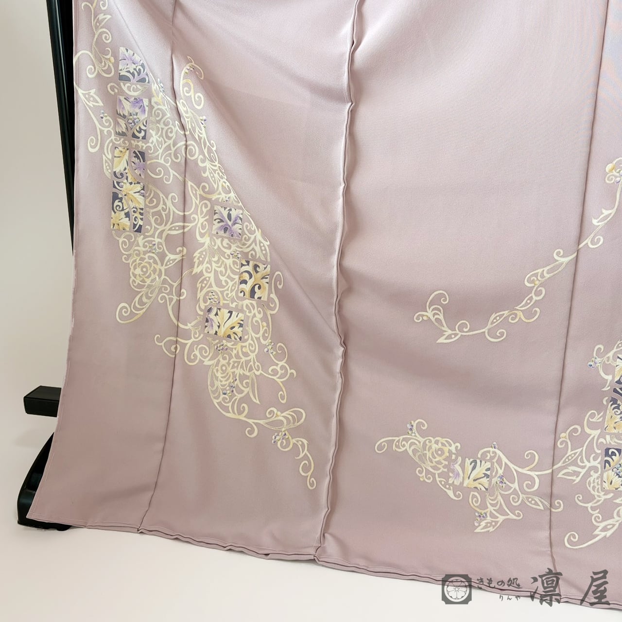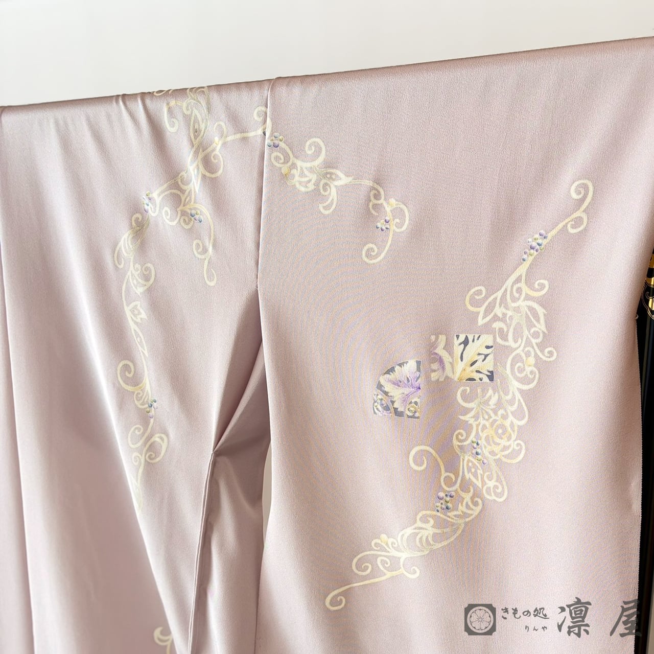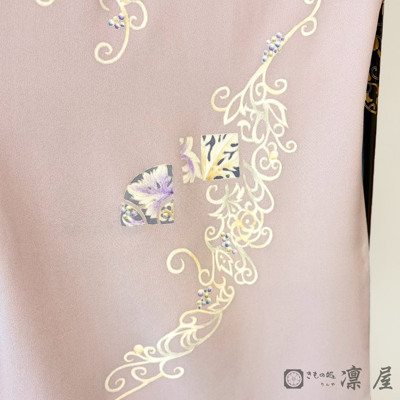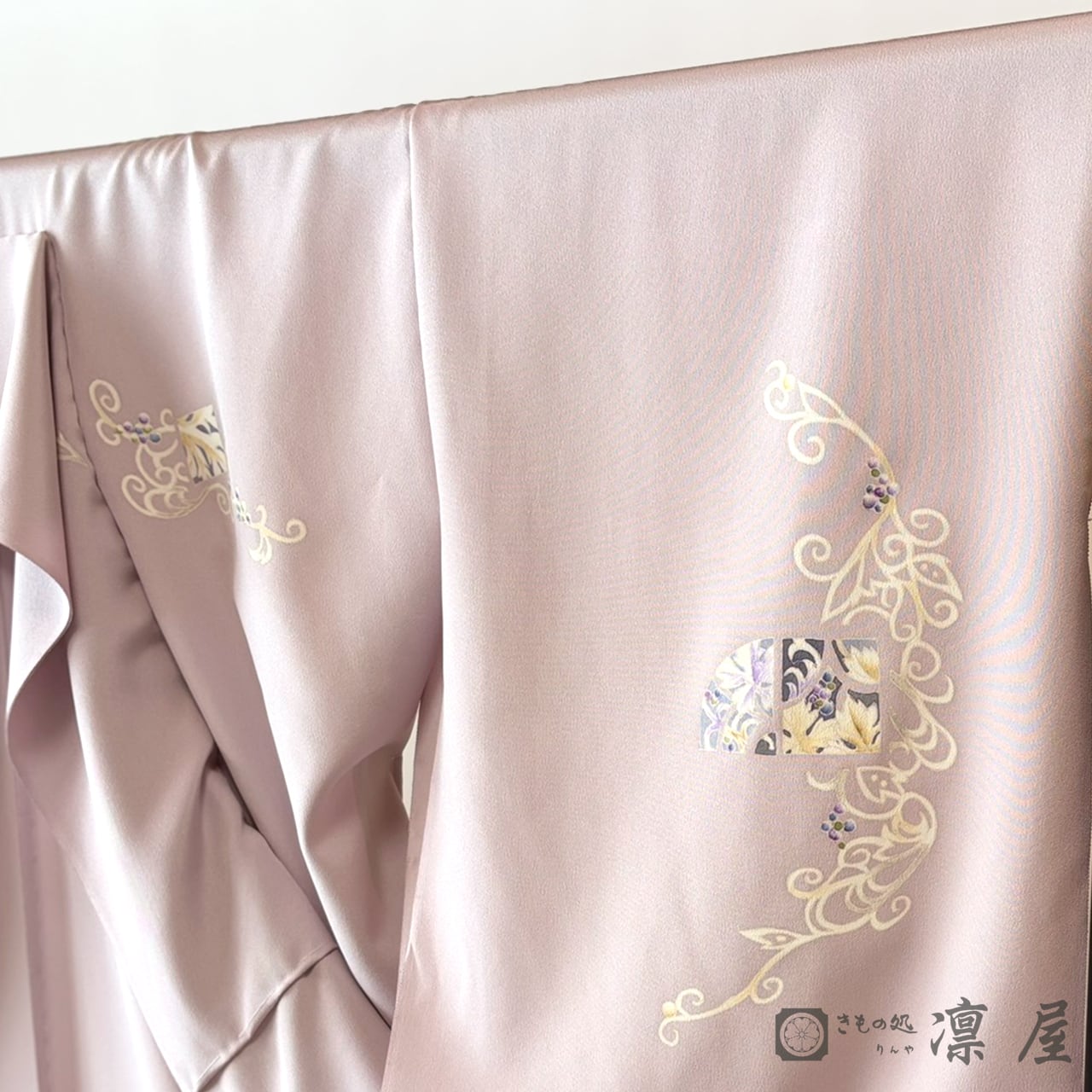 地色は灰桜と淡紅藤の中間のような上品で柔らかい色に染め上げました。軽やかでエレガント、かつ趣味性も高く、2枚目の訪問着としてもおすすめしたい一品です。