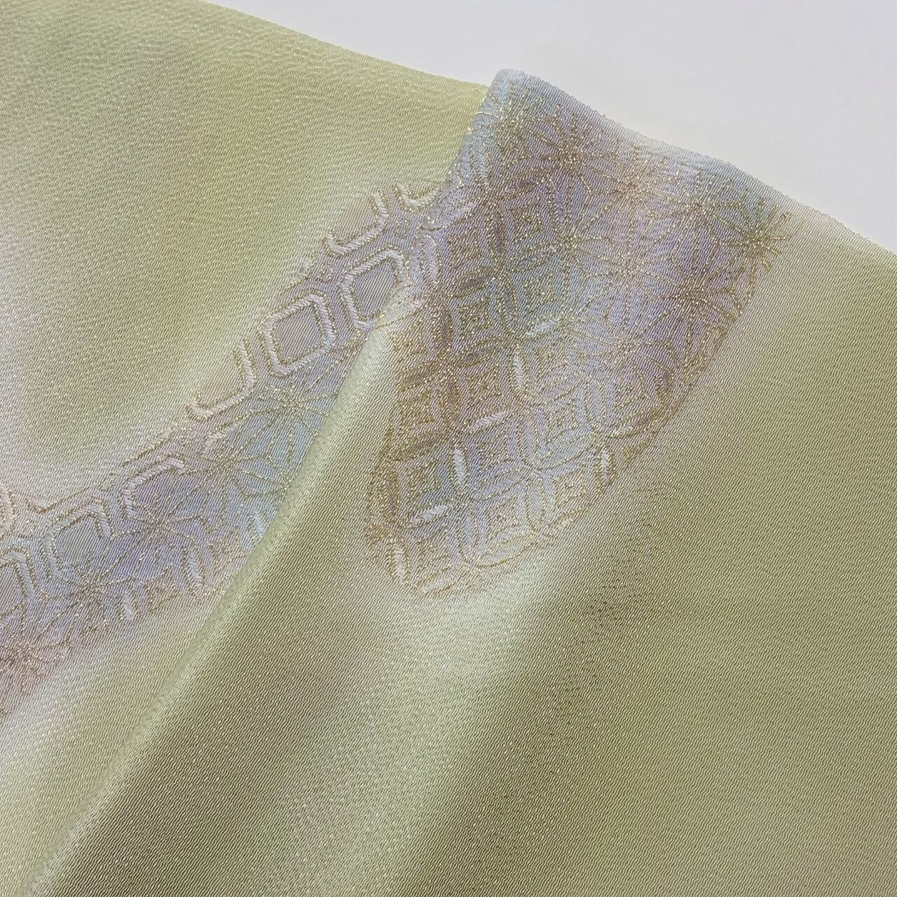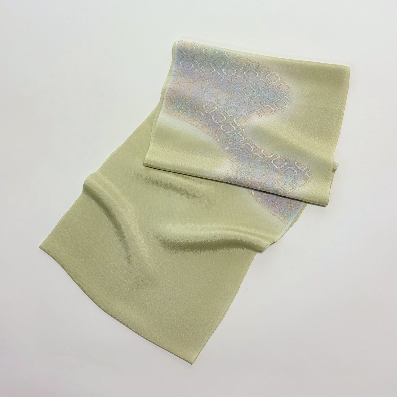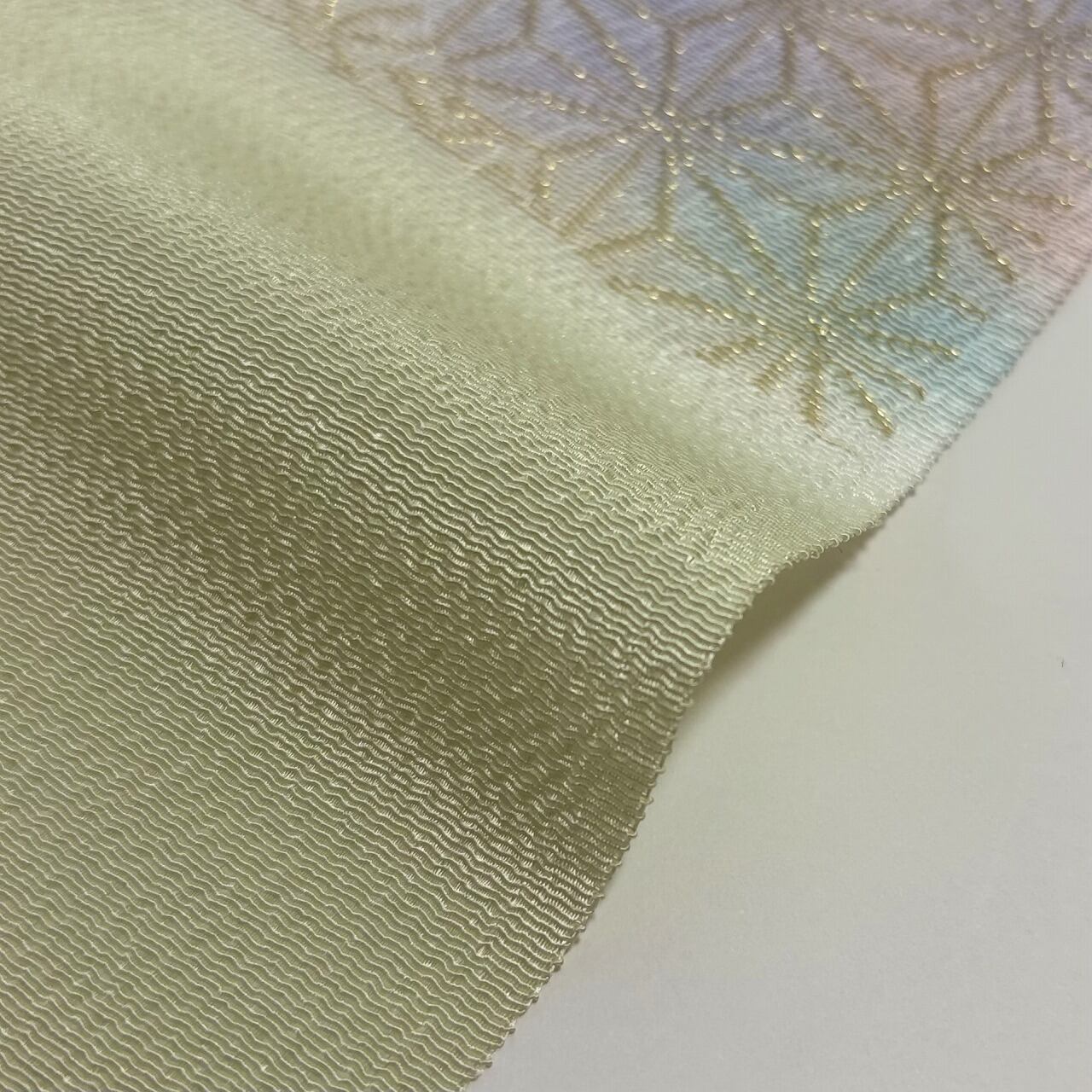 上質なちりめん地に縫取りで流水が施された帯揚げです。流水の中の柄付けは、麻の葉、七宝、菱。柔らかな玉虫色の流水取りはオーロラのようで、改まったお席の装いをより引き立て格上げしてくれそうです。