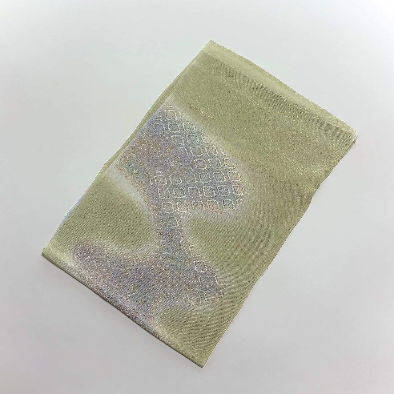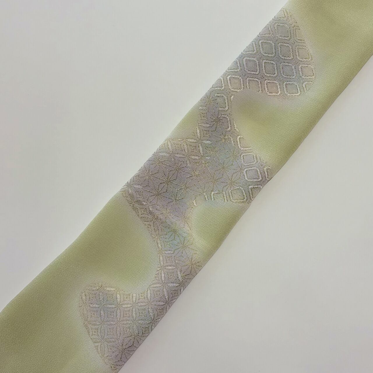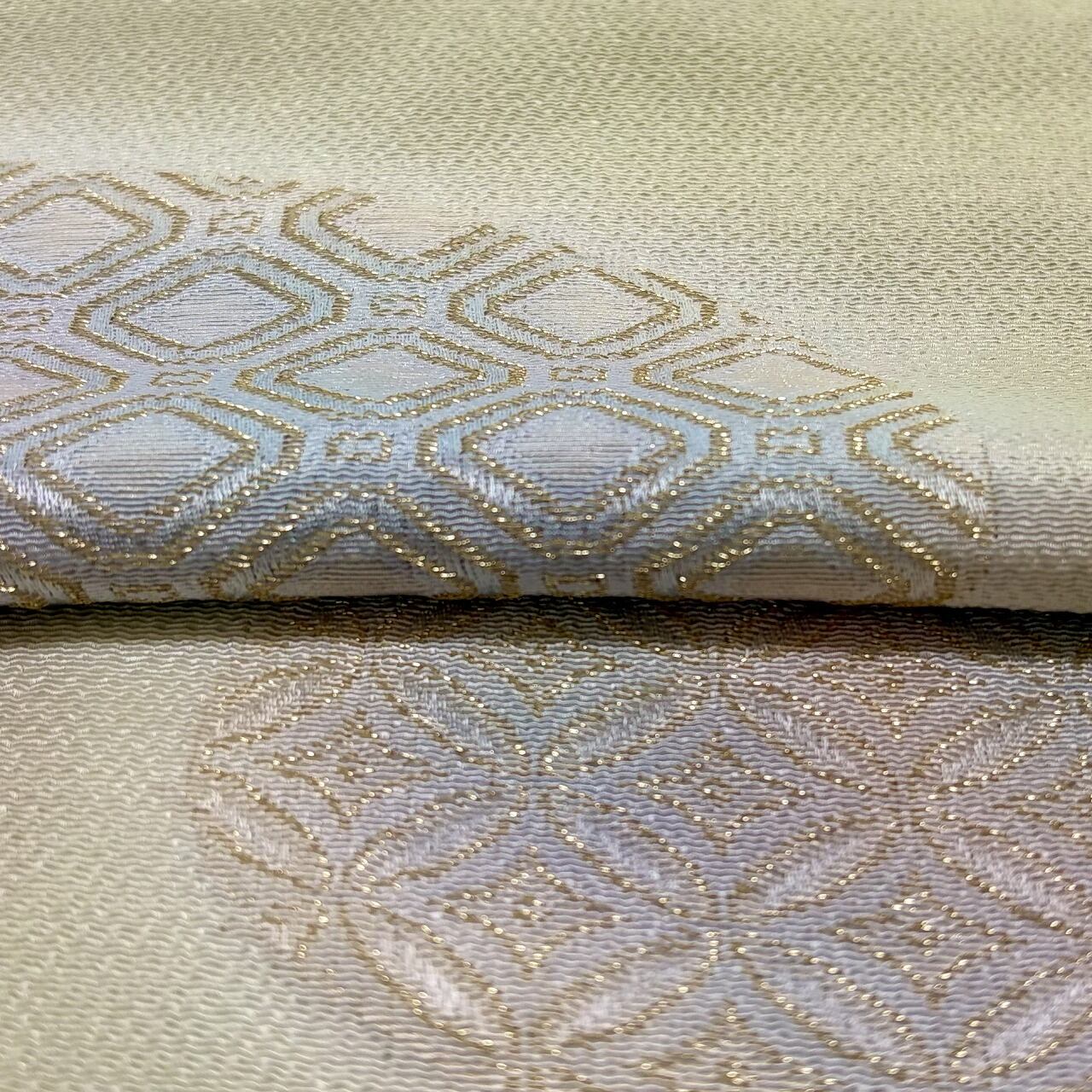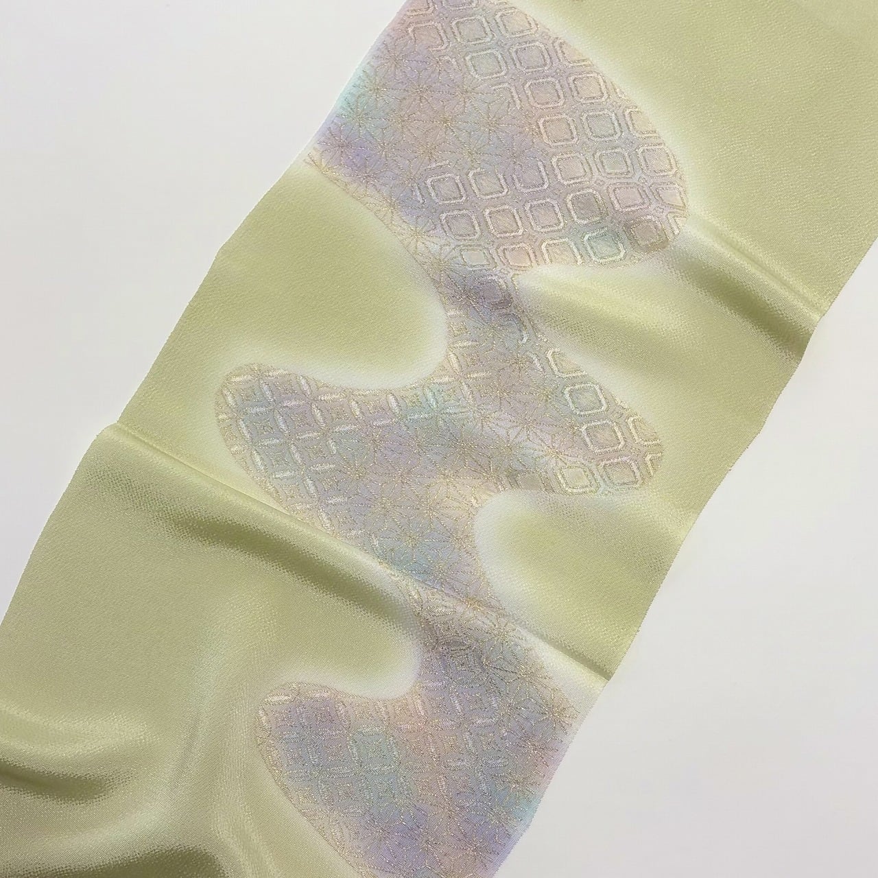 上質なちりめん地に縫取りで流水が施された帯揚げです。流水の中の柄付けは、麻の葉、七宝、菱。柔らかな玉虫色の流水取りはオーロラのようで、改まったお席の装いをより引き立て格上げしてくれそうです。