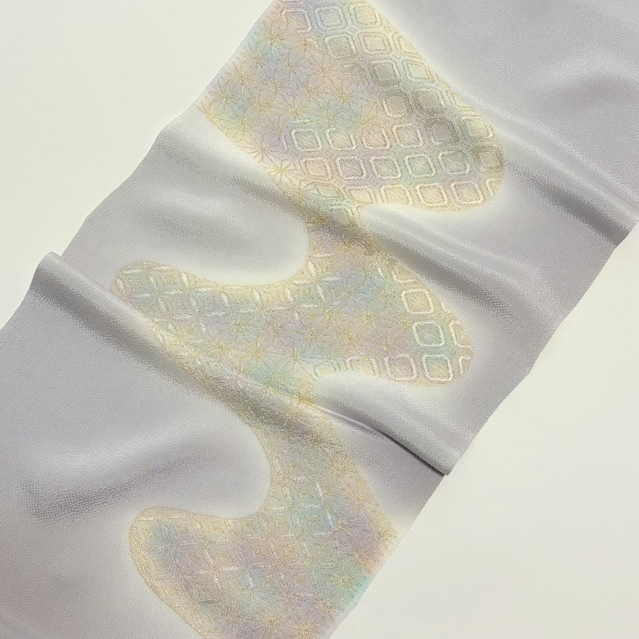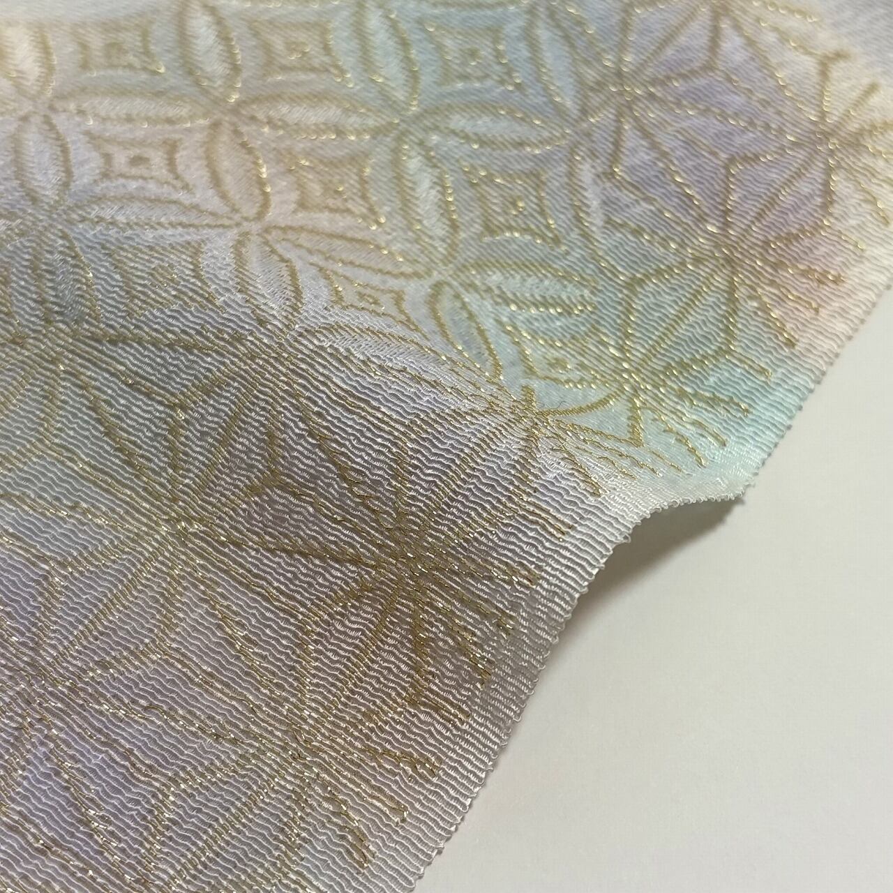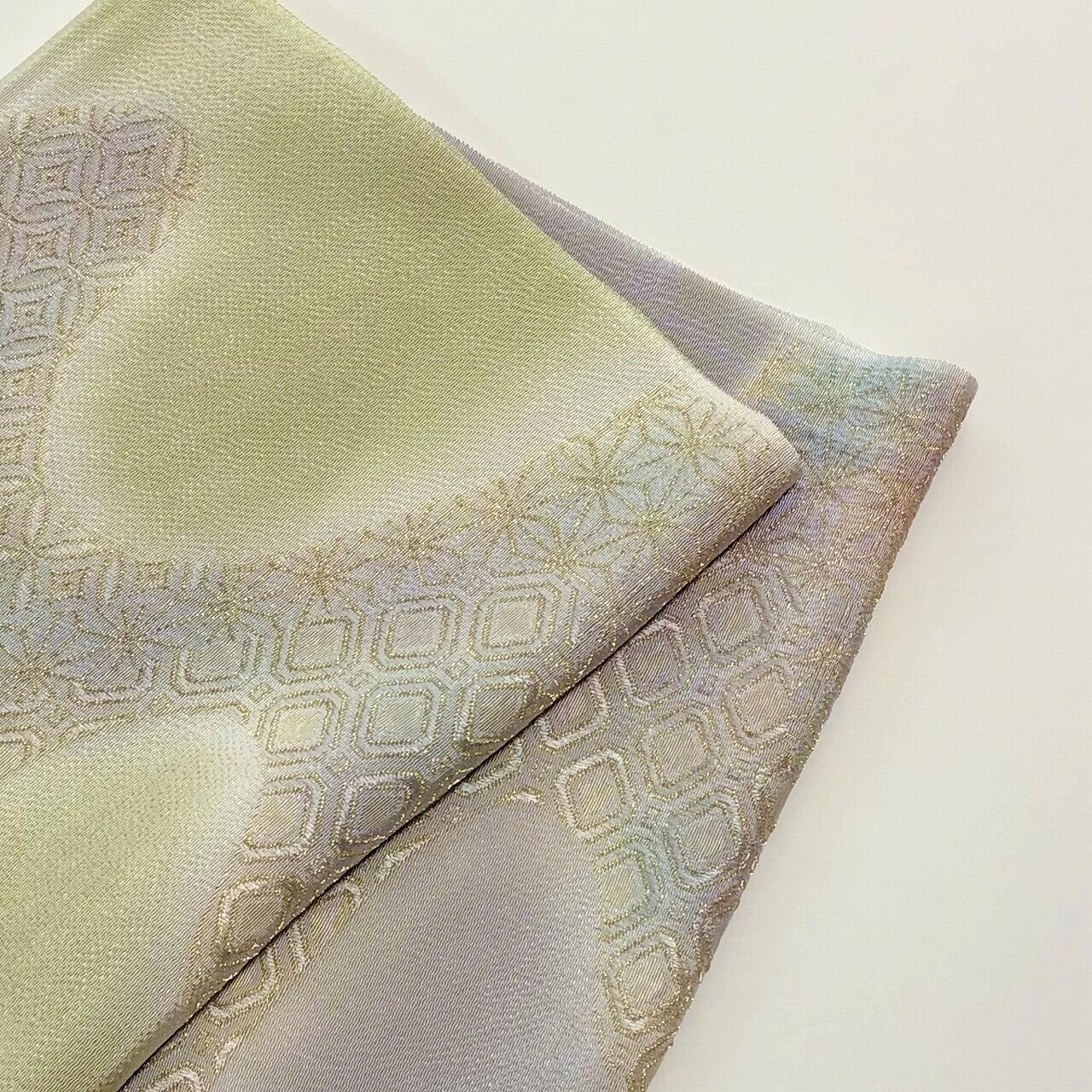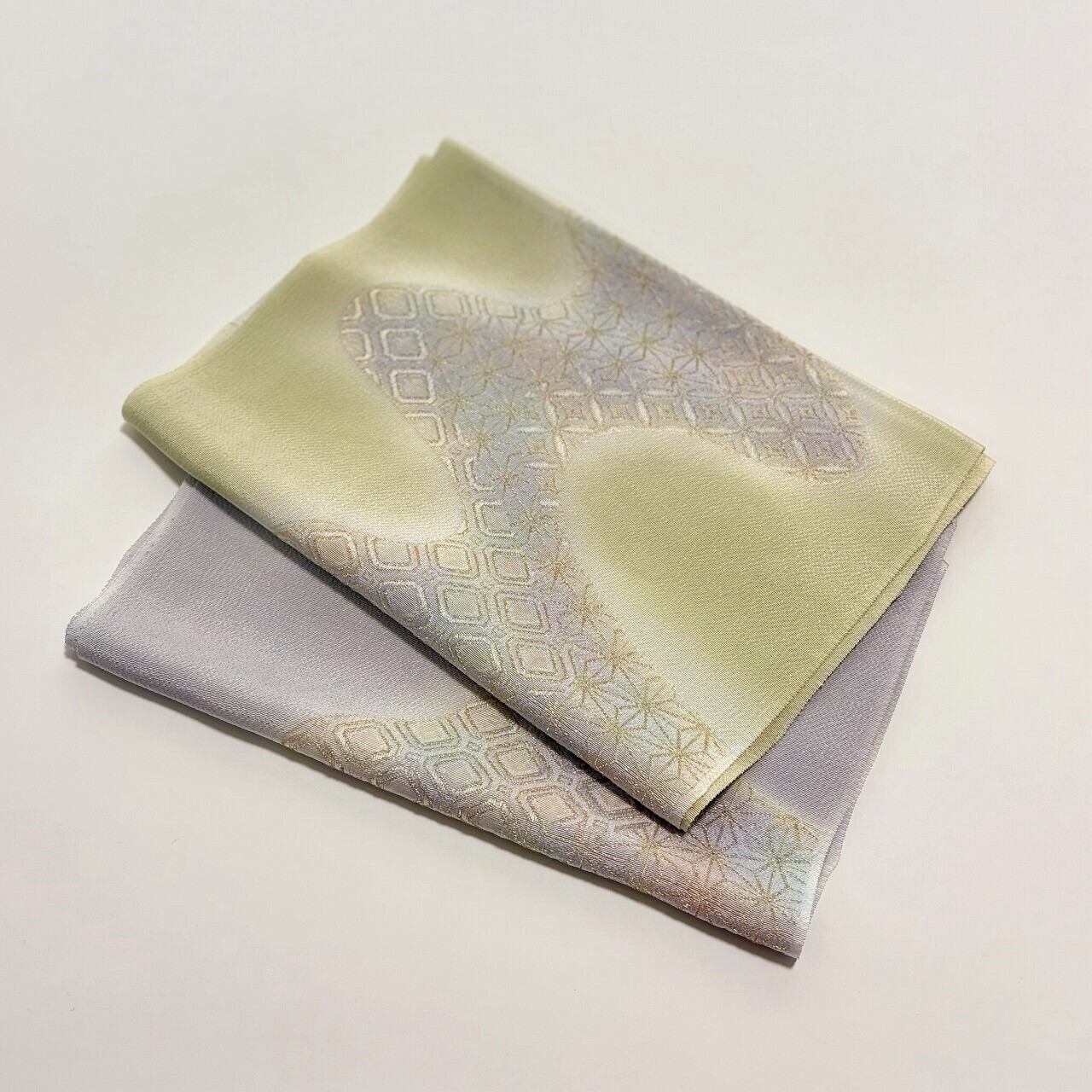 上質なちりめん地に縫取りで流水が施された帯揚げです。流水の中の柄付けは、麻の葉、七宝、菱。柔らかな玉虫色の流水取りはオーロラのようで、改まったお席の装いをより引き立て格上げしてくれそうです。