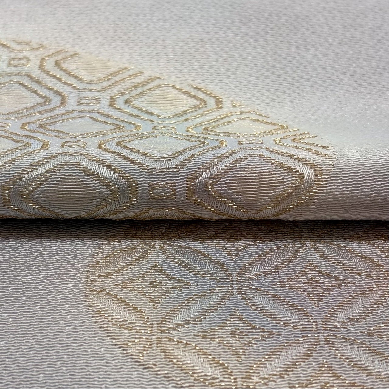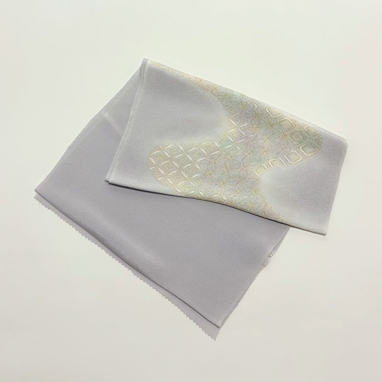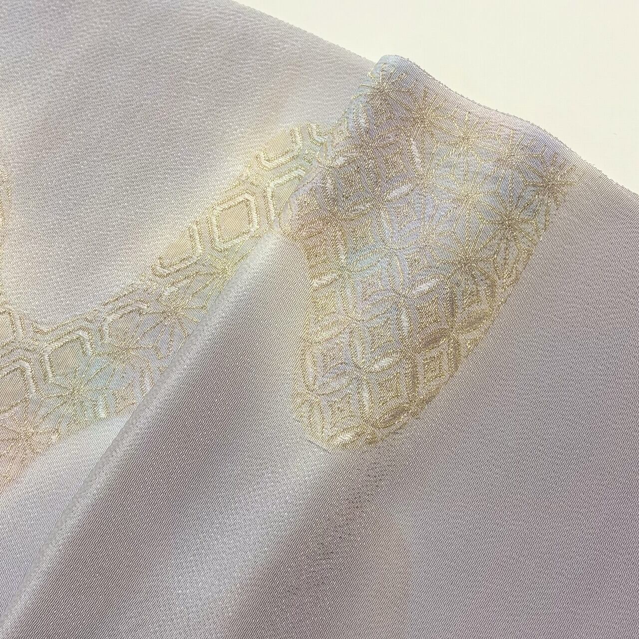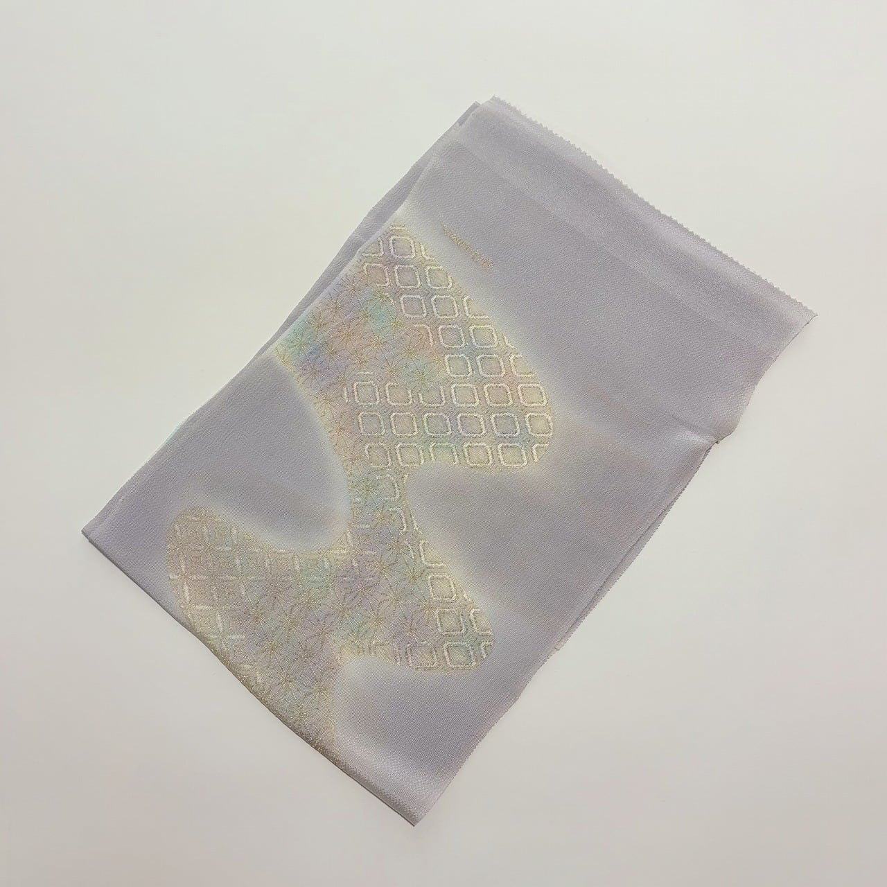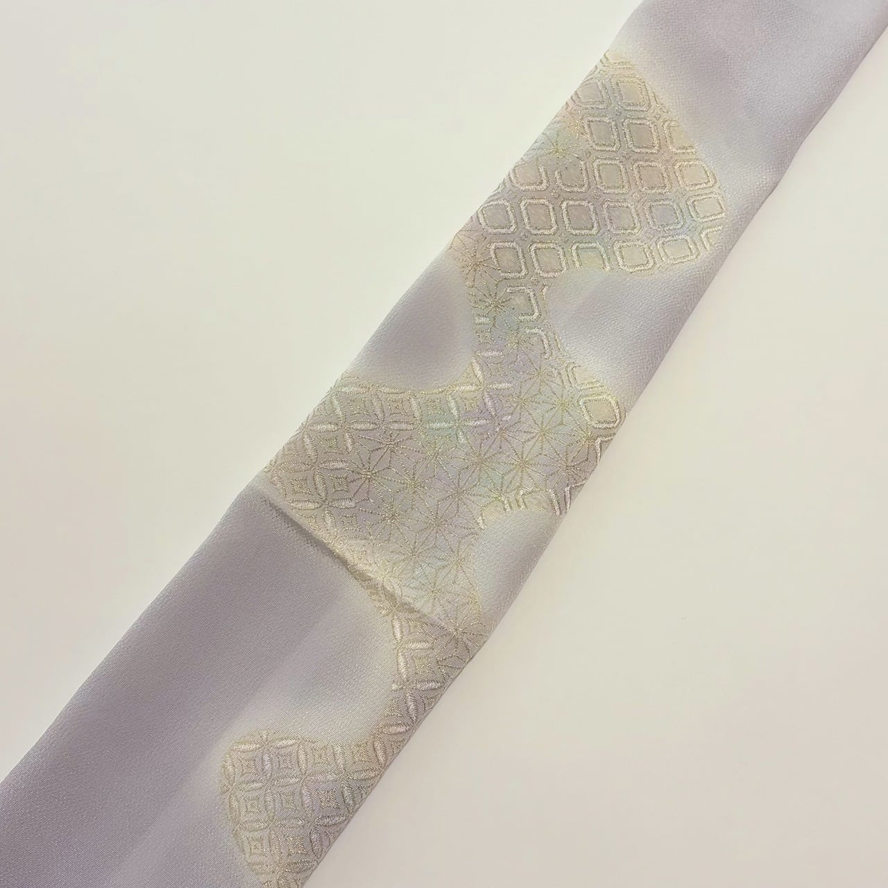 上質なちりめん地に縫取りで流水が施された帯揚げです。流水の中の柄付けは、麻の葉、七宝、菱。柔らかな玉虫色の流水取りはオーロラのようで、改まったお席の装いをより引き立て格上げしてくれそうです。