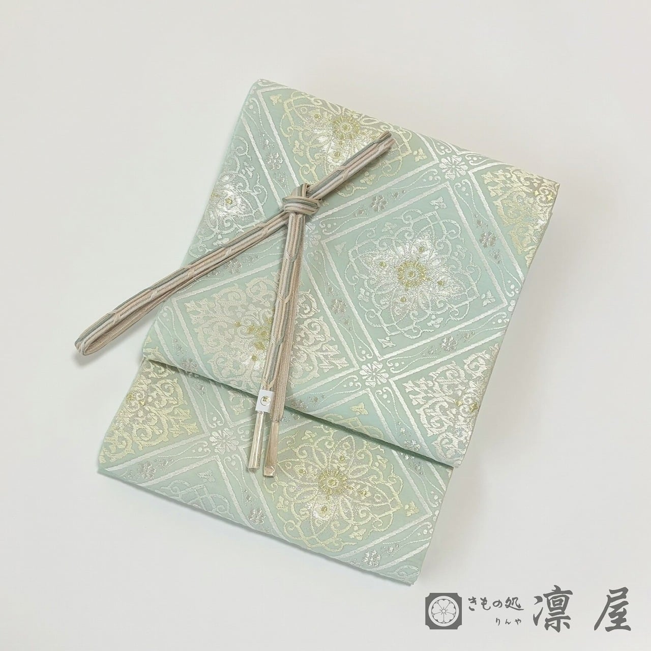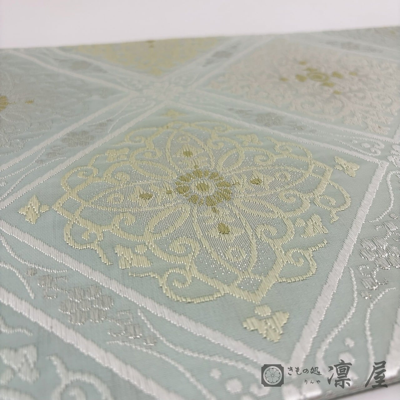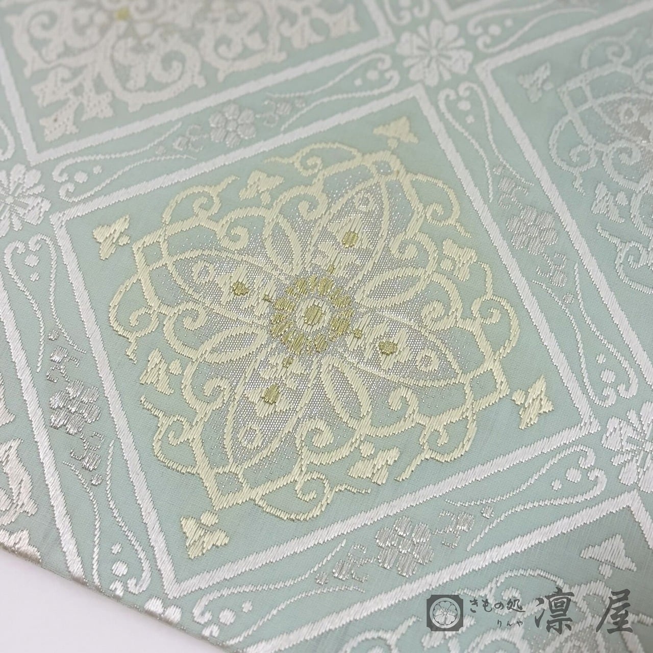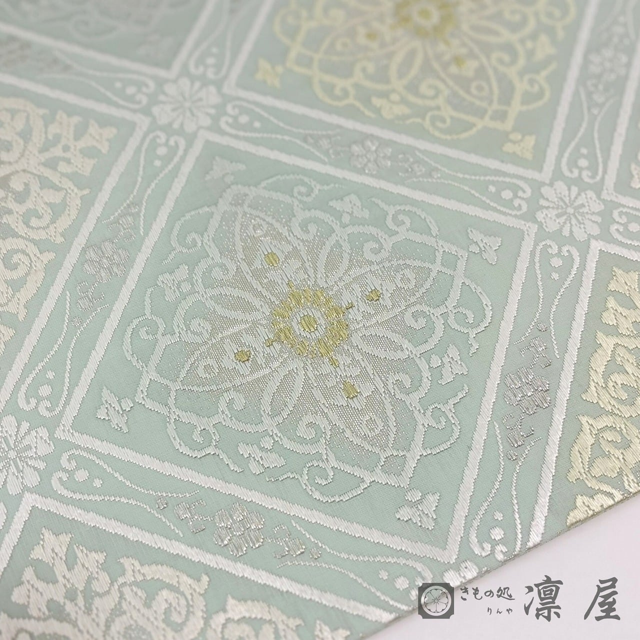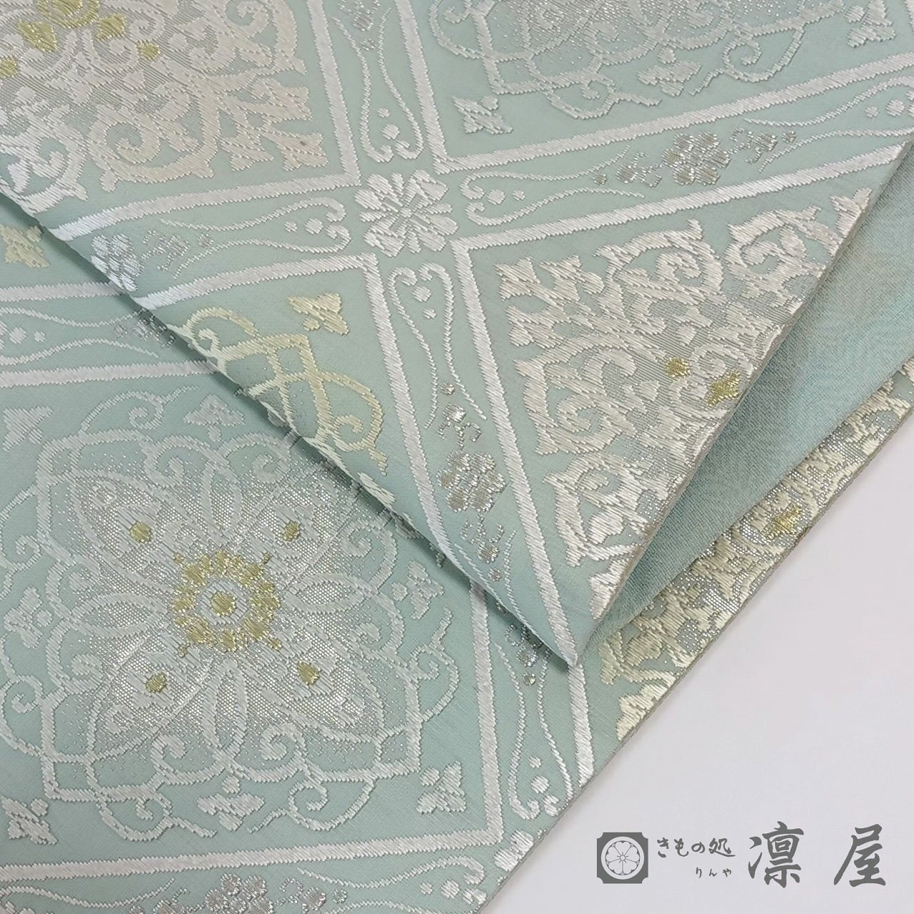 織りの密度が高くなく軽やかに織り上げており、単衣~袷まで幅広い季節でお召しいただけます。袋帯としては比較的珍しい淡い錆青磁の地に、白、クリームベージュ、金といった品のある色調で華文襷が配されており、柔らかな煌きの金糸にも楚々とした気品が漂います。