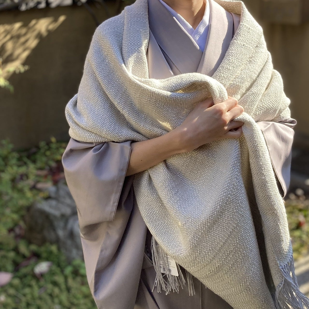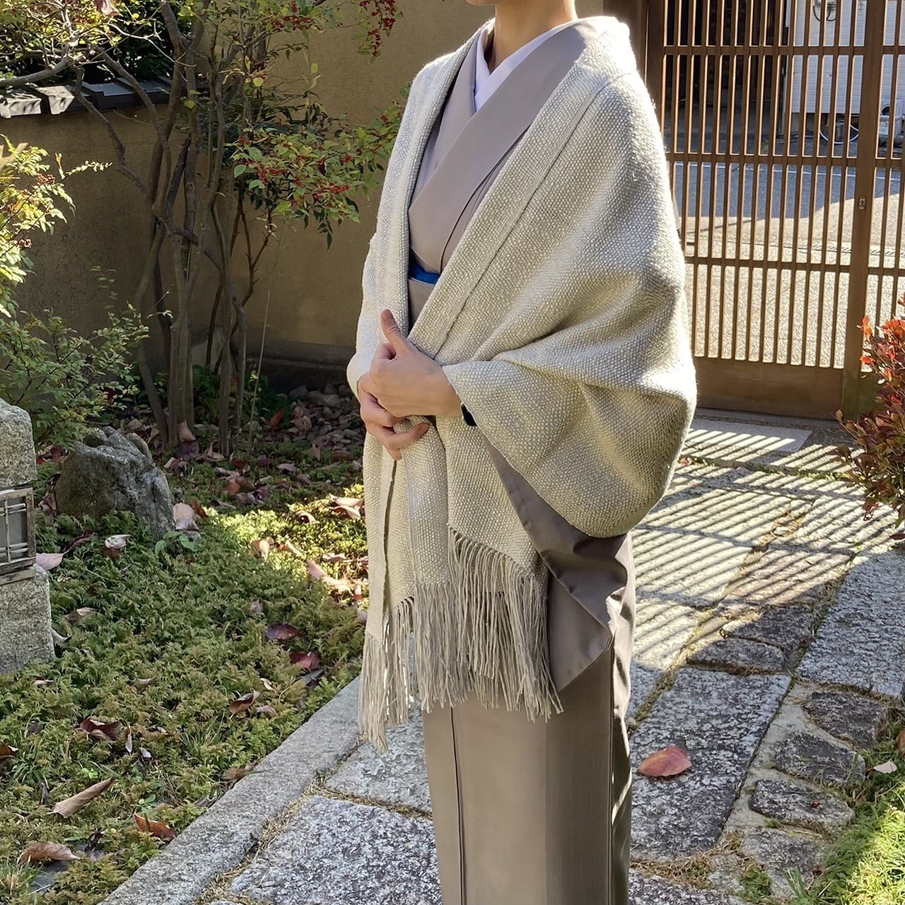 帯の下まですっぽりと覆ってくれる贅沢な大判サイズ。さっと羽織ったり首元にふんわりと巻いたり、和装にはもちろん、洋装にも合わせやすく日常使いしていただきたいお品です。