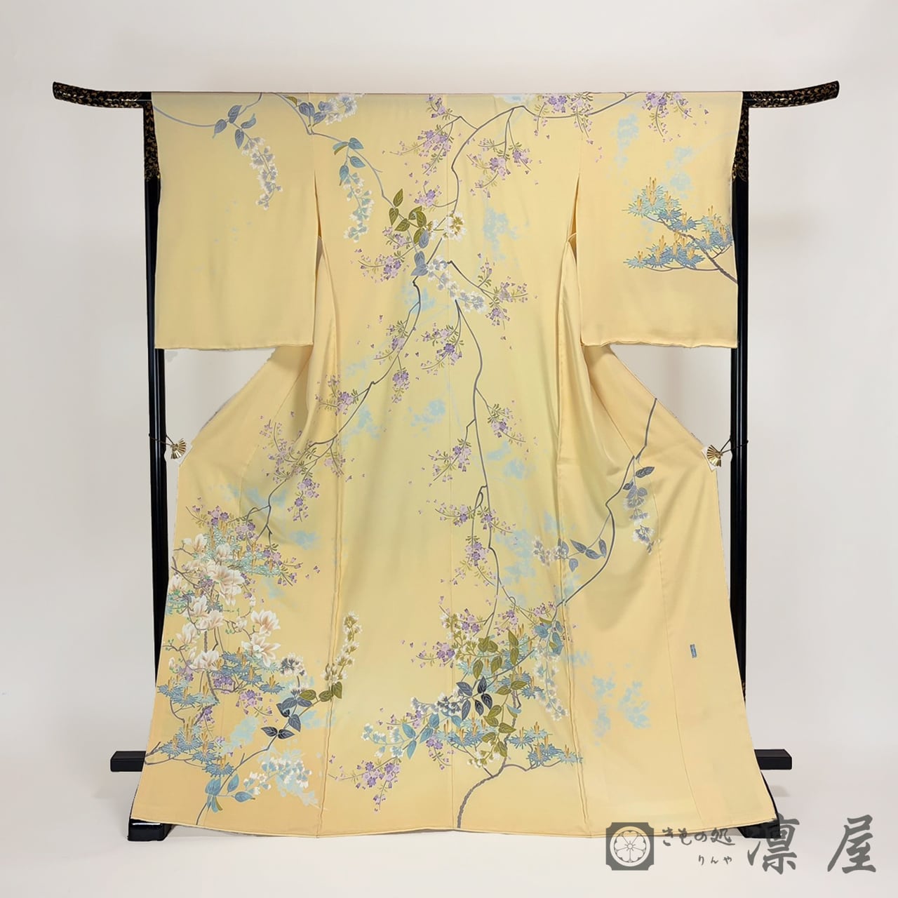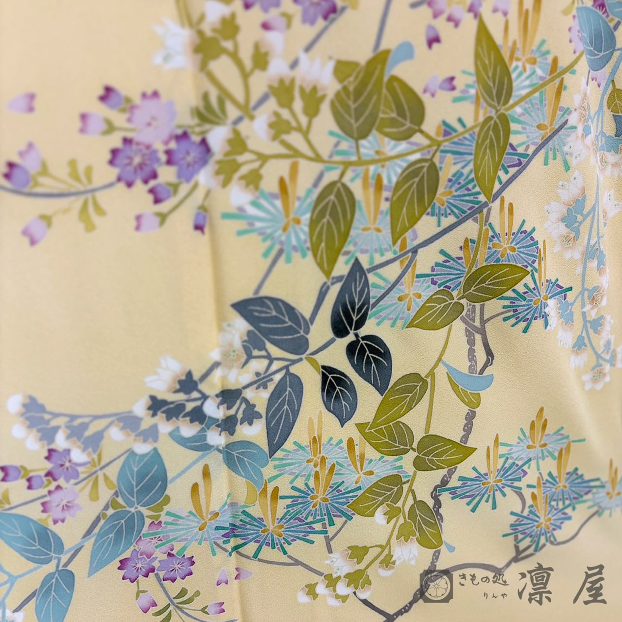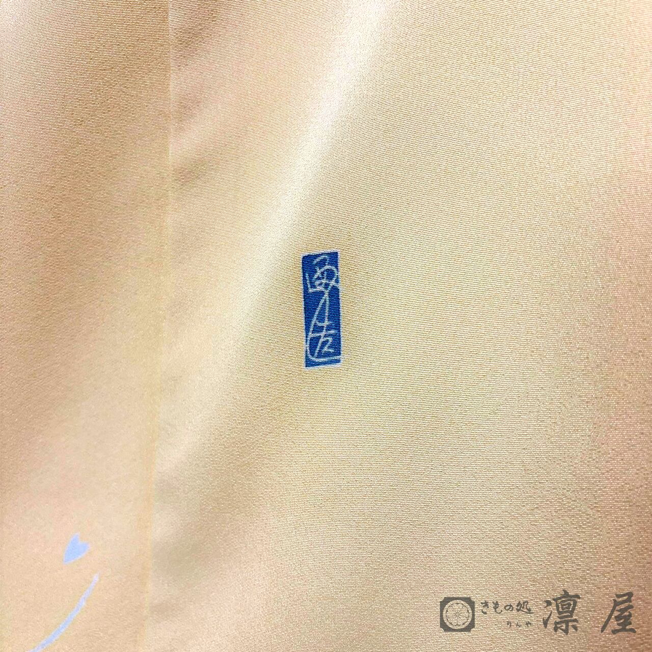 淡黄(たんこう)といった印象の、わずかに赤みを含んだ優しい黄色の地色で、裾には共濃い色のボカシが重ねられています。