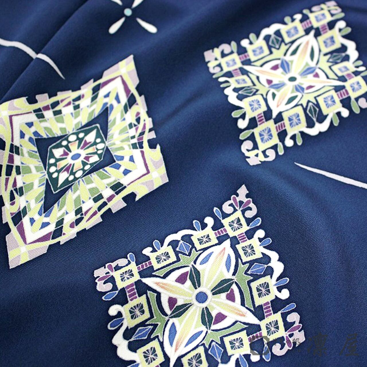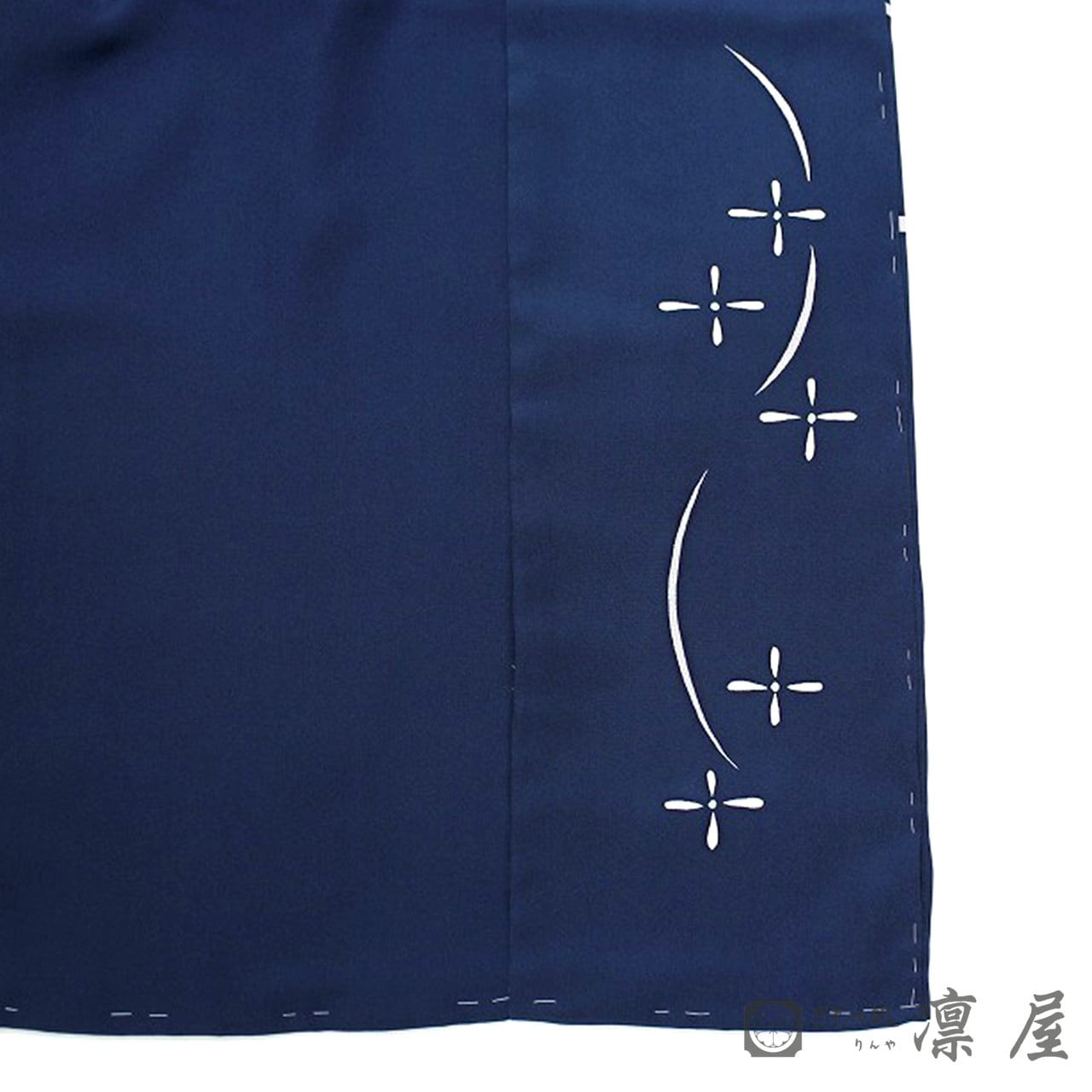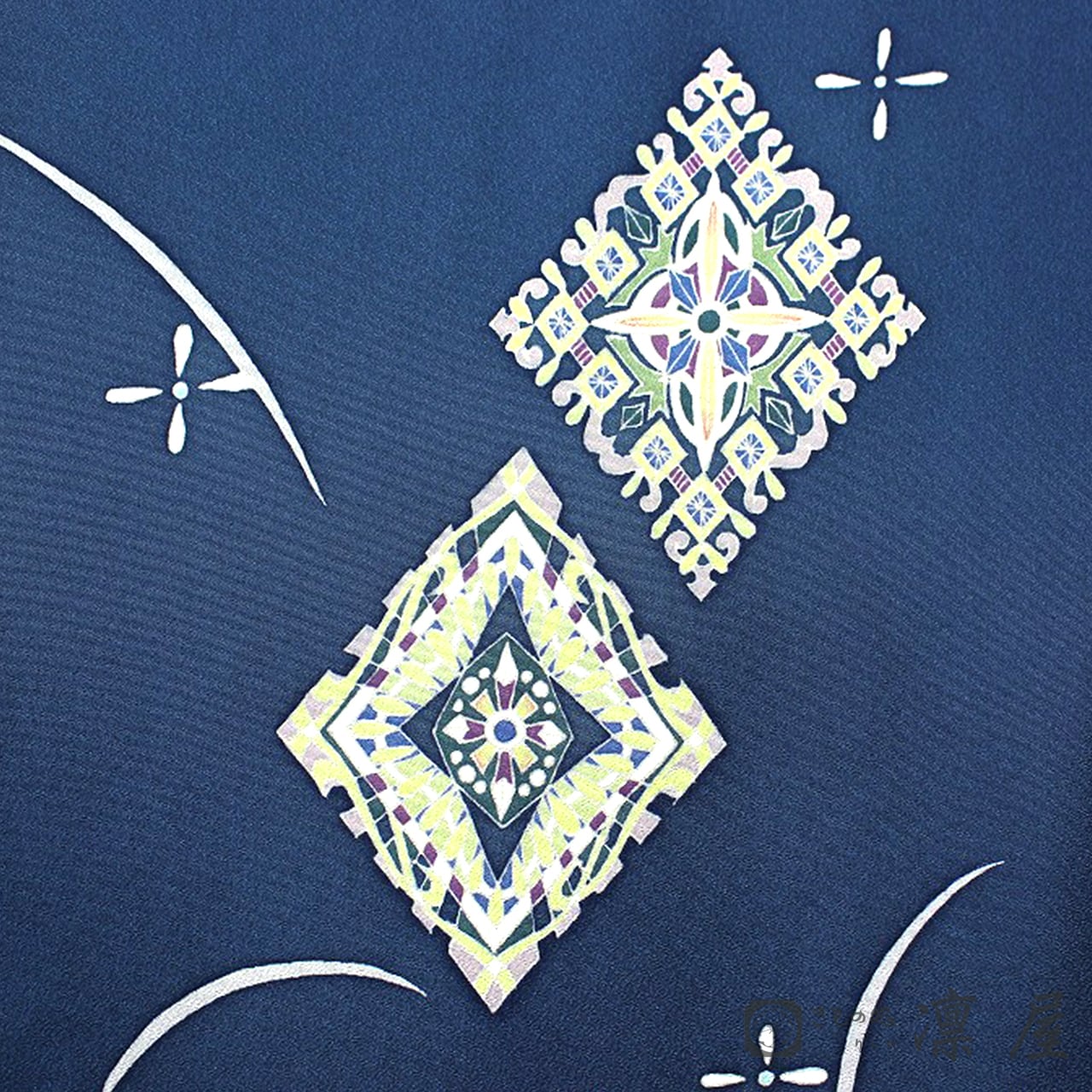 凛屋別注で染めていただいたこだわりのこっくりとした鉄紺色の地色に菱文様が映えますね。シンプルでありながら、ジュエリーを身に着けたような華やかな煌めきを感じる一枚です。