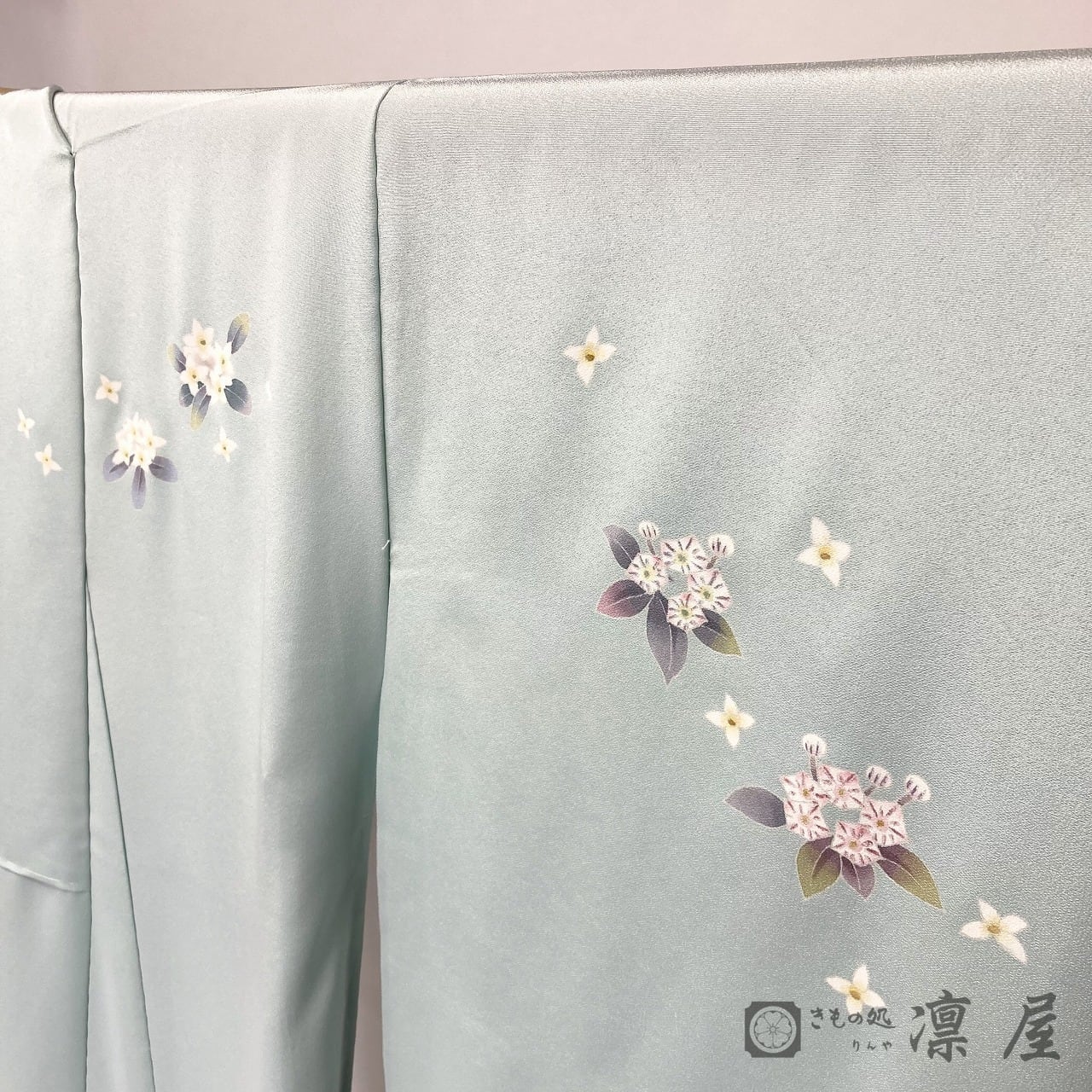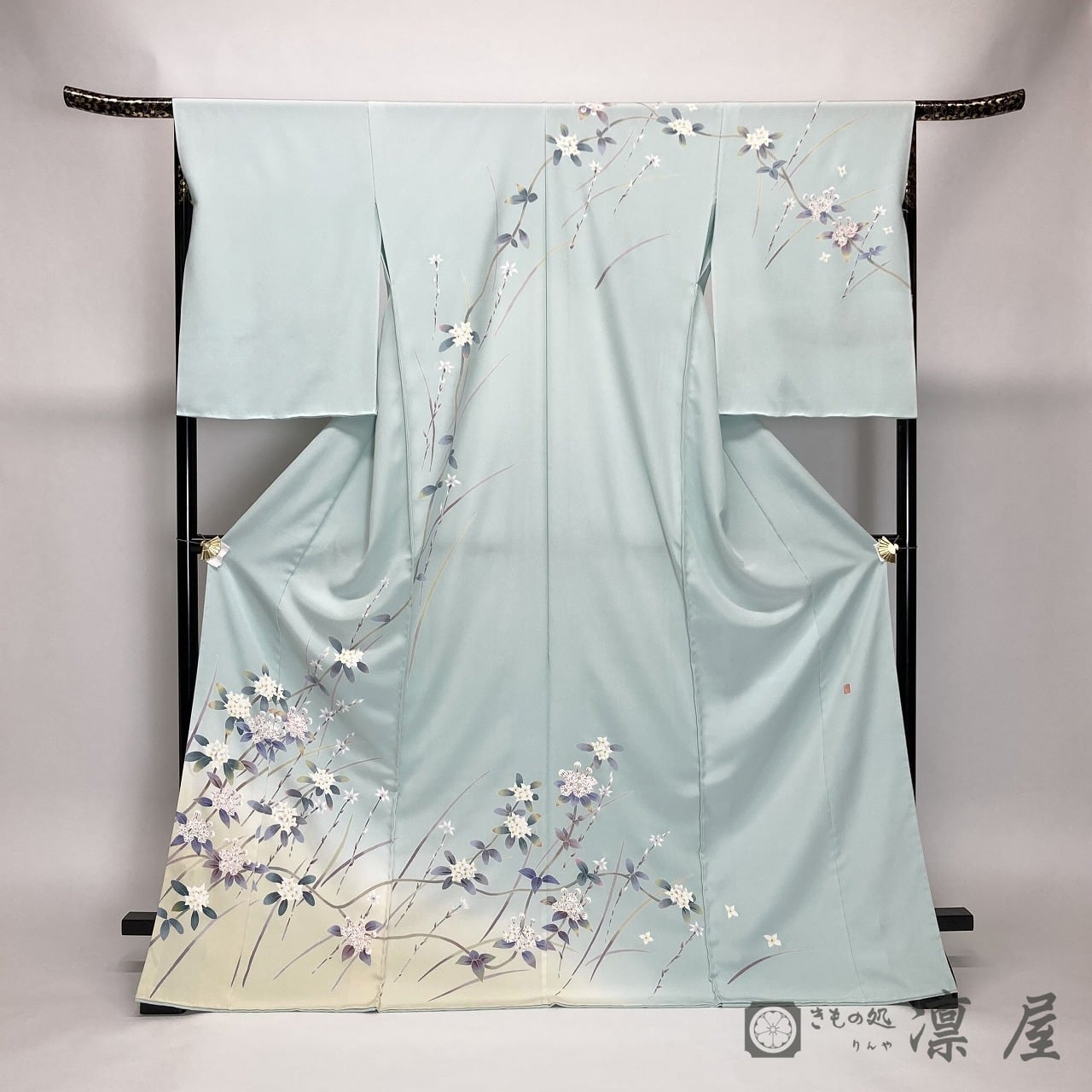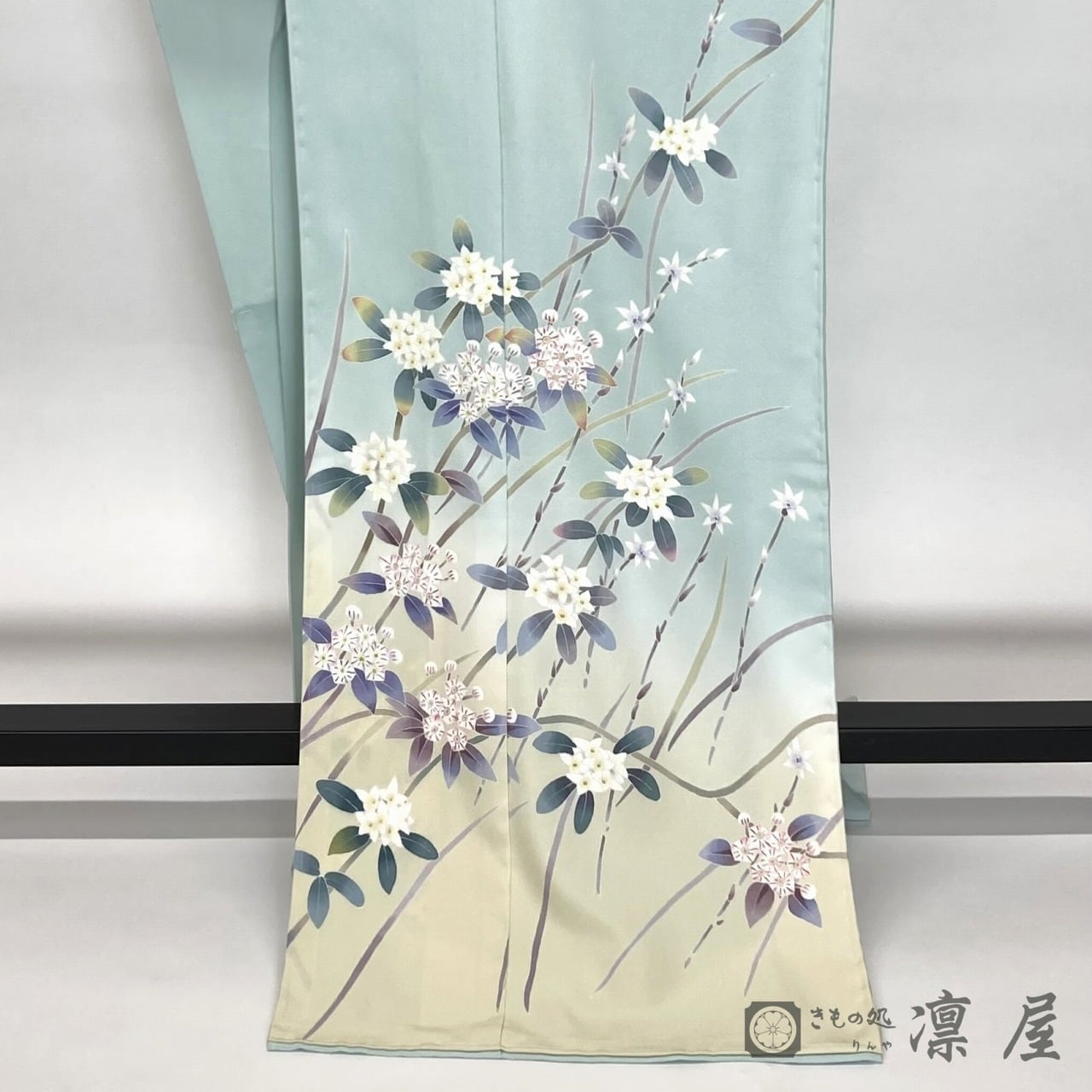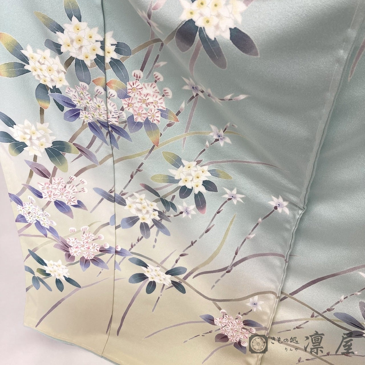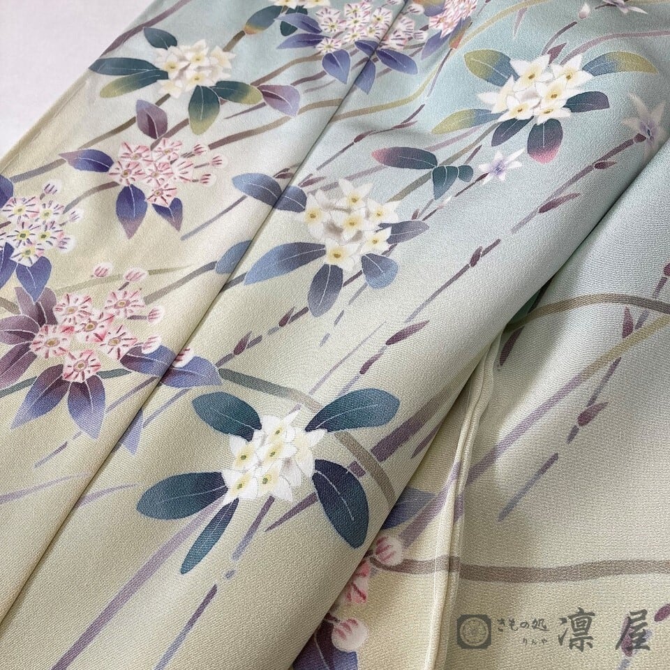 メインの地色は裏葉柳色や薄萌葱色に近く、爽やかなミントグリーンといった印象です。上前衽の裾にかけたきれいな黄味のある若苗色のぼかしが、全体の軽やかな印象に落ち着きを持たせています。