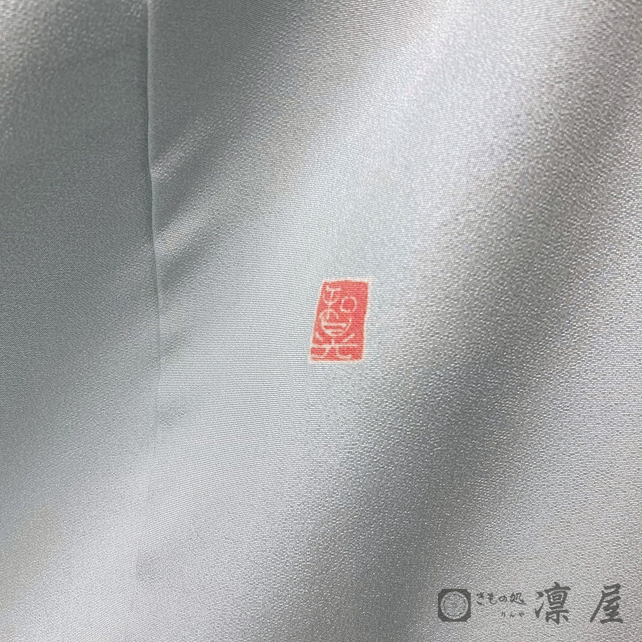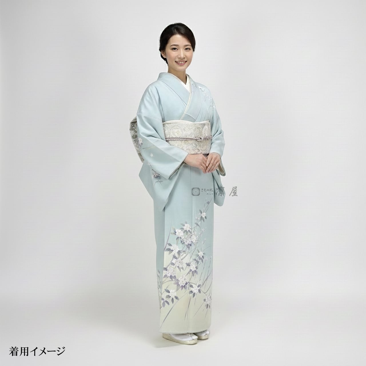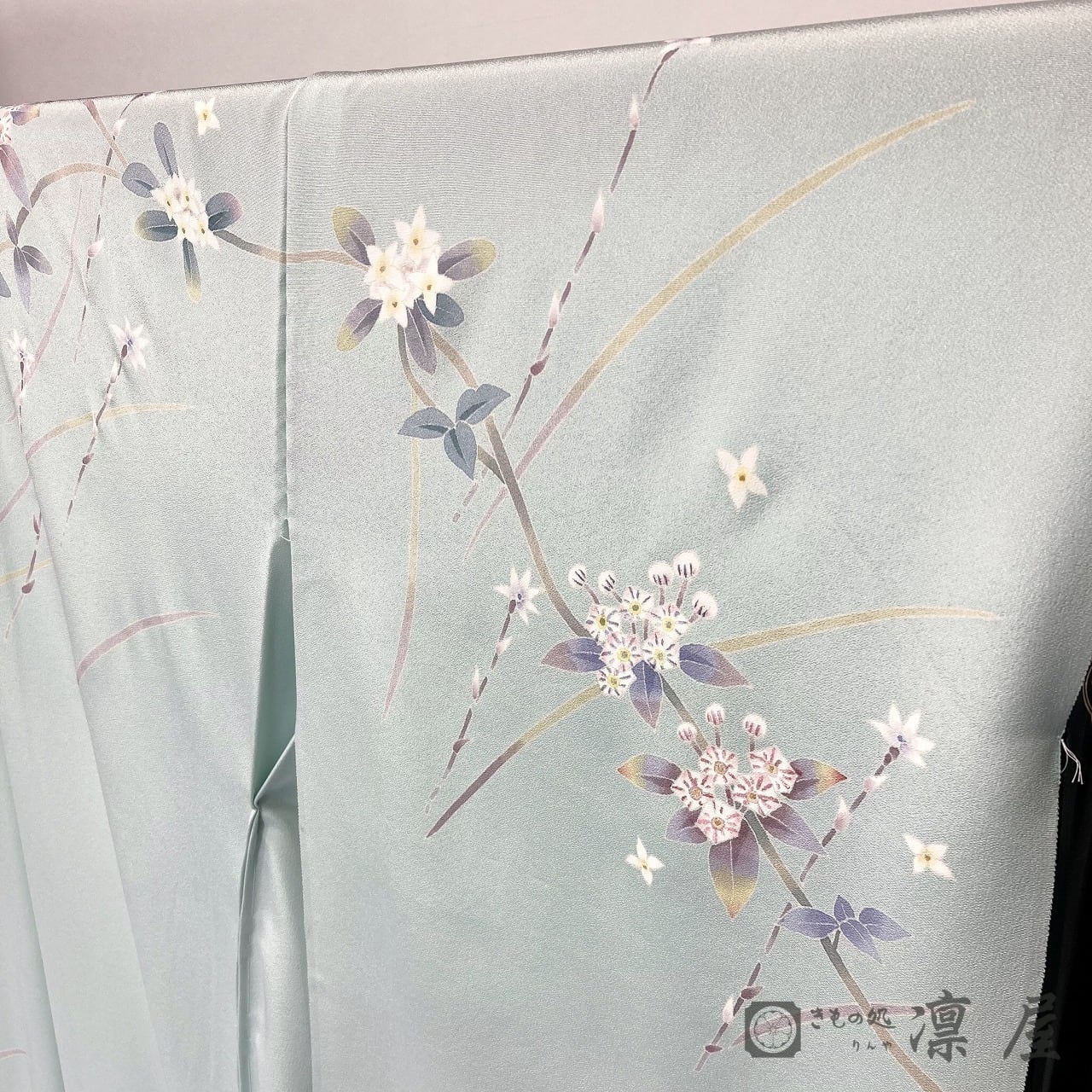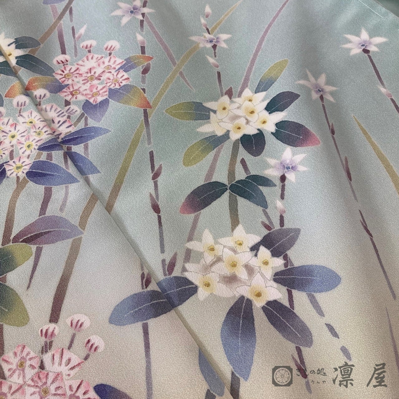 メインの地色は裏葉柳色や薄萌葱色に近く、爽やかなミントグリーンといった印象です。上前衽の裾にかけたきれいな黄味のある若苗色のぼかしが、全体の軽やかな印象に落ち着きを持たせています。