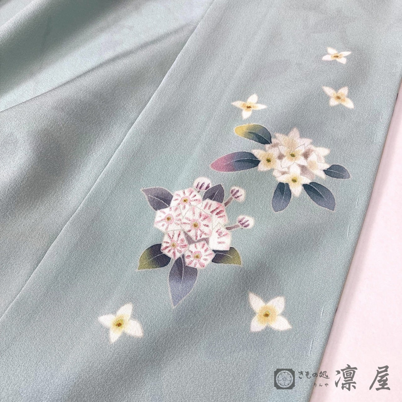 加賀友禅の訪問着に描かれるお花の中でも希少なアメリカシャクナゲというユニークな可憐さのある花弁の彩色表現により、礼装着でありながらどこか洒脱な感じがまたコーディネイトに楽しみが広がるようです。