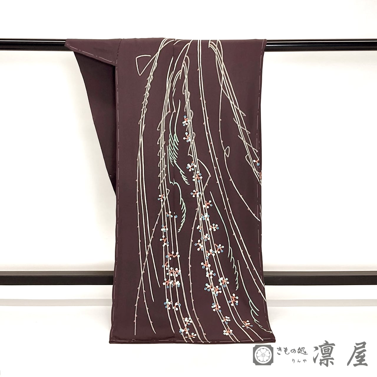 しなやかに幾重にも重なり上下に流れるように走る枝や蔓は「白上げ(しろあげ…糸目糊のみで模様を白い線描きのようにあらわす技法)」のようなすっきりとした彩色表現で、こっくりとした地色と相まって着姿にモダンな恰好よさを演出いたします。
