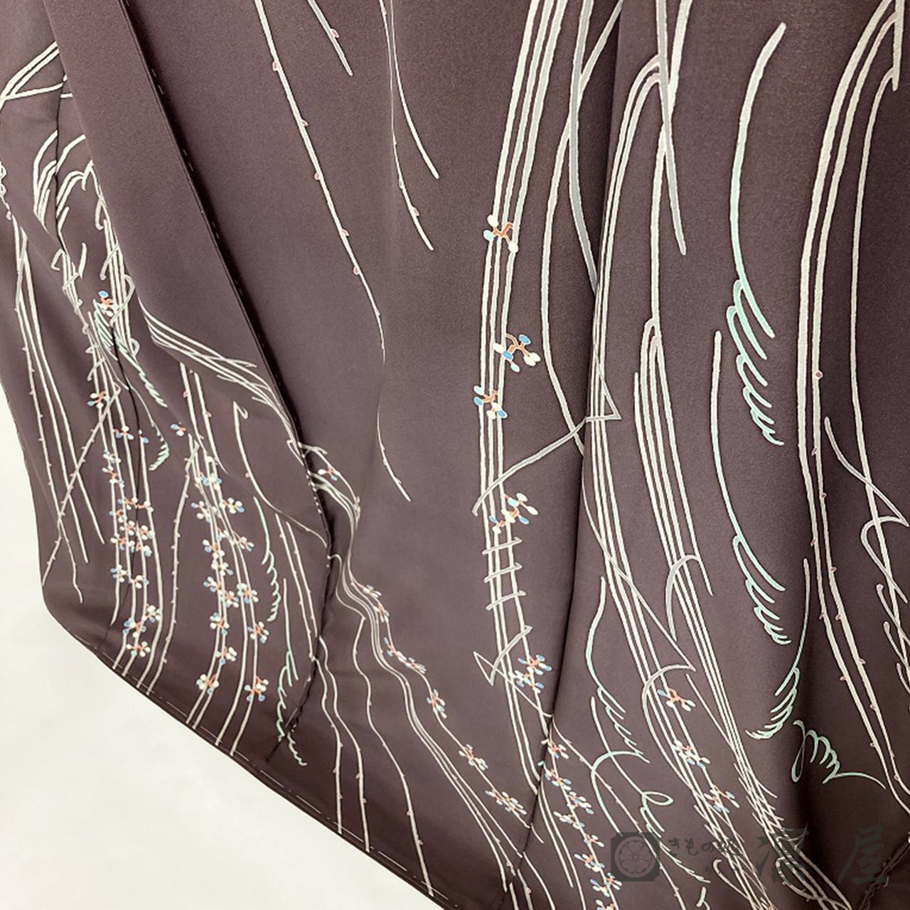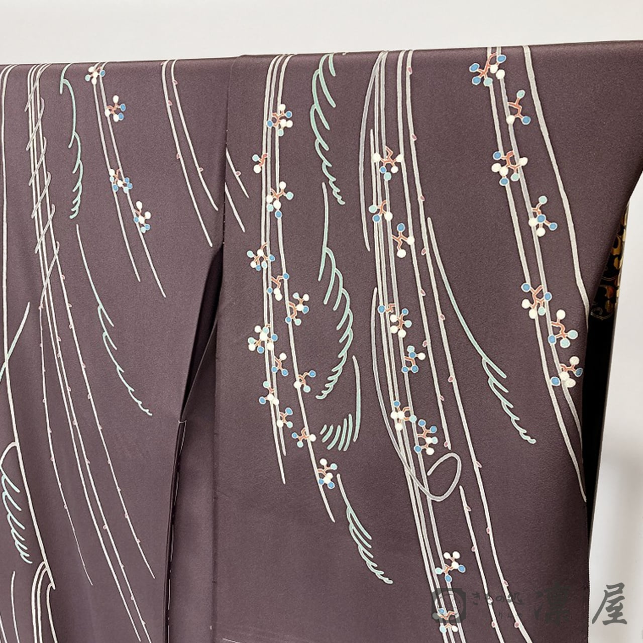 「紫鳶色(むらさきとびいろ)」や「濃色(こきいろ)」に近い、とても深みのあるグレイッシュな濃い紫色といった印象の地色です。一般的な室内光では大変落ち着いた色味に映る一方、自然光のもとでは綺麗で華やかな赤味が感じられる引き染めにより、加賀友禅の染色技術の妙味でも目を楽しませてくれます。