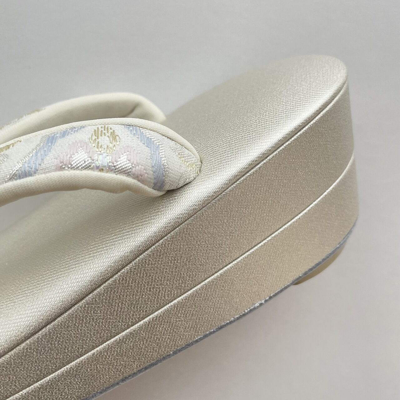 ほんのり色味が乗ったシャンパンゴールドの台と、白地に淡いブルー、グリーン、ピンクの綺麗なシャーベットカラーで柄が織り出された鼻緒の組合せ。控えめな金糸銀糸使いも非常に品よく美しく、清涼感もある一品です。