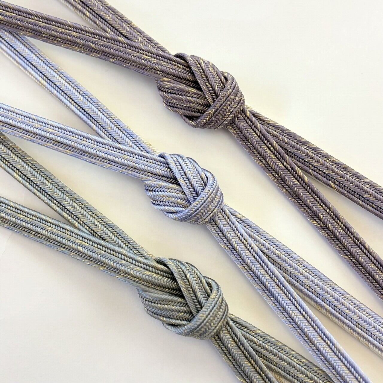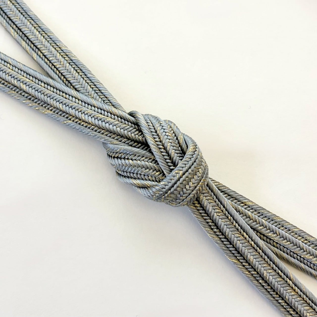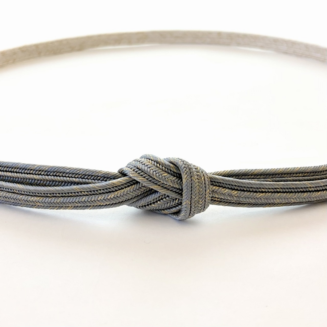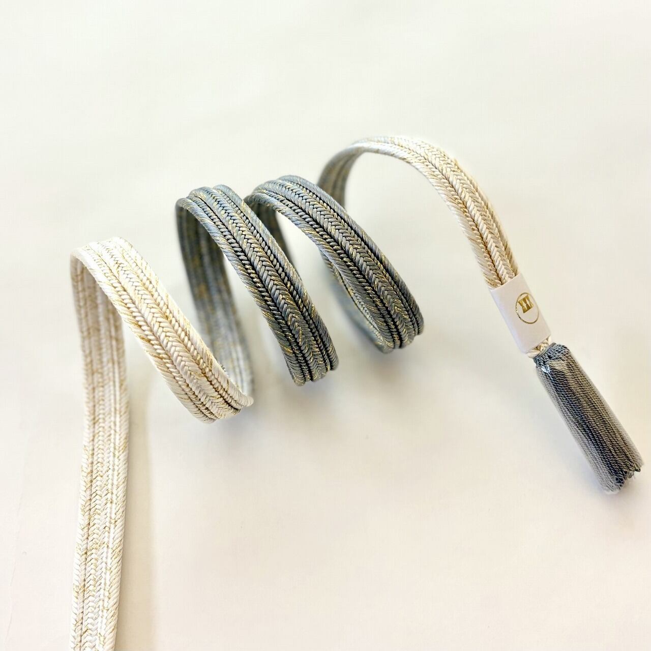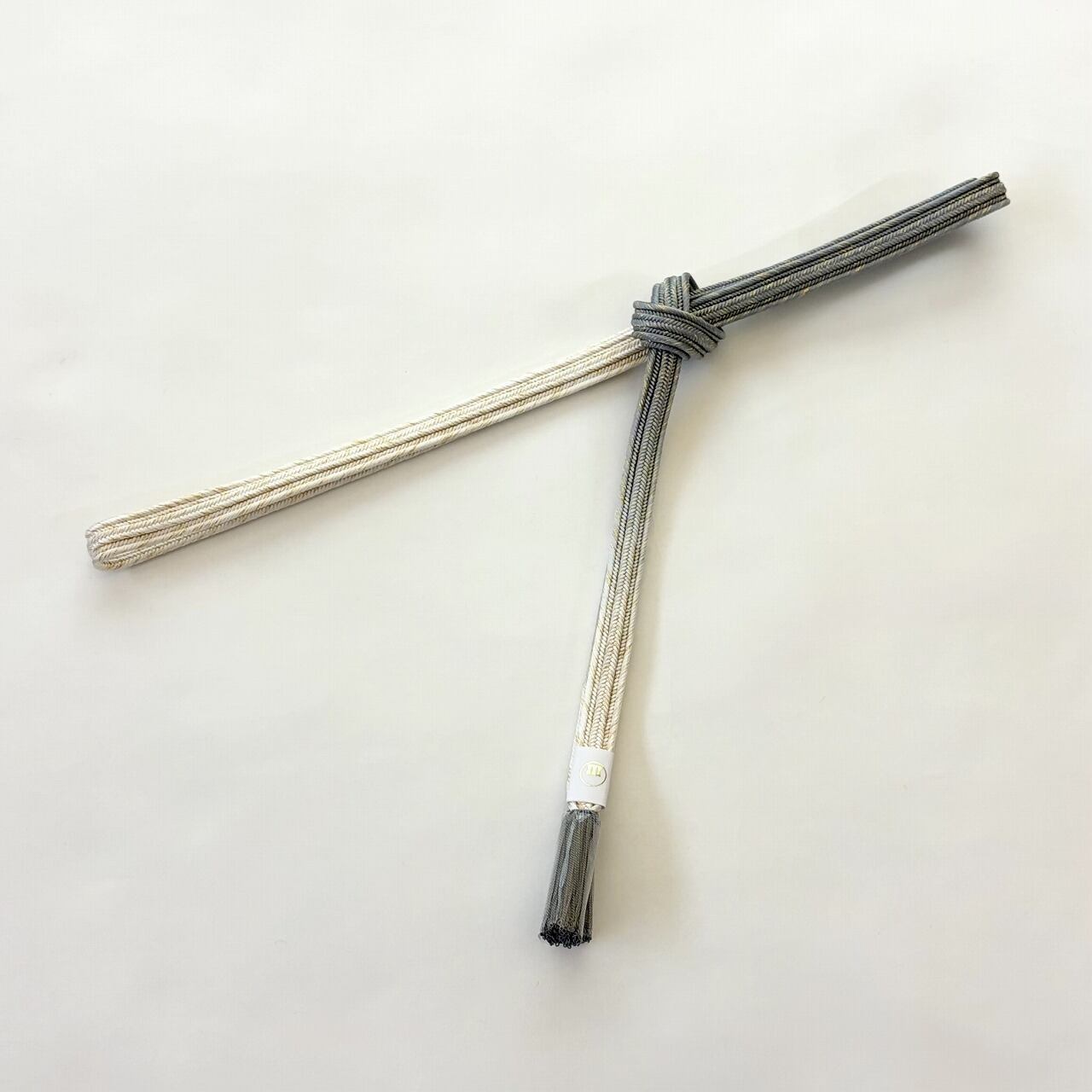 締めた時に前腹に出る部分と撚り房にはメインカラーが、そして背になる部分と先端に向けて白地へとぼかされています。畝打組の立体感のあるしっかりとした組みで格調高く、フォーマルな装いに重宝いたします。