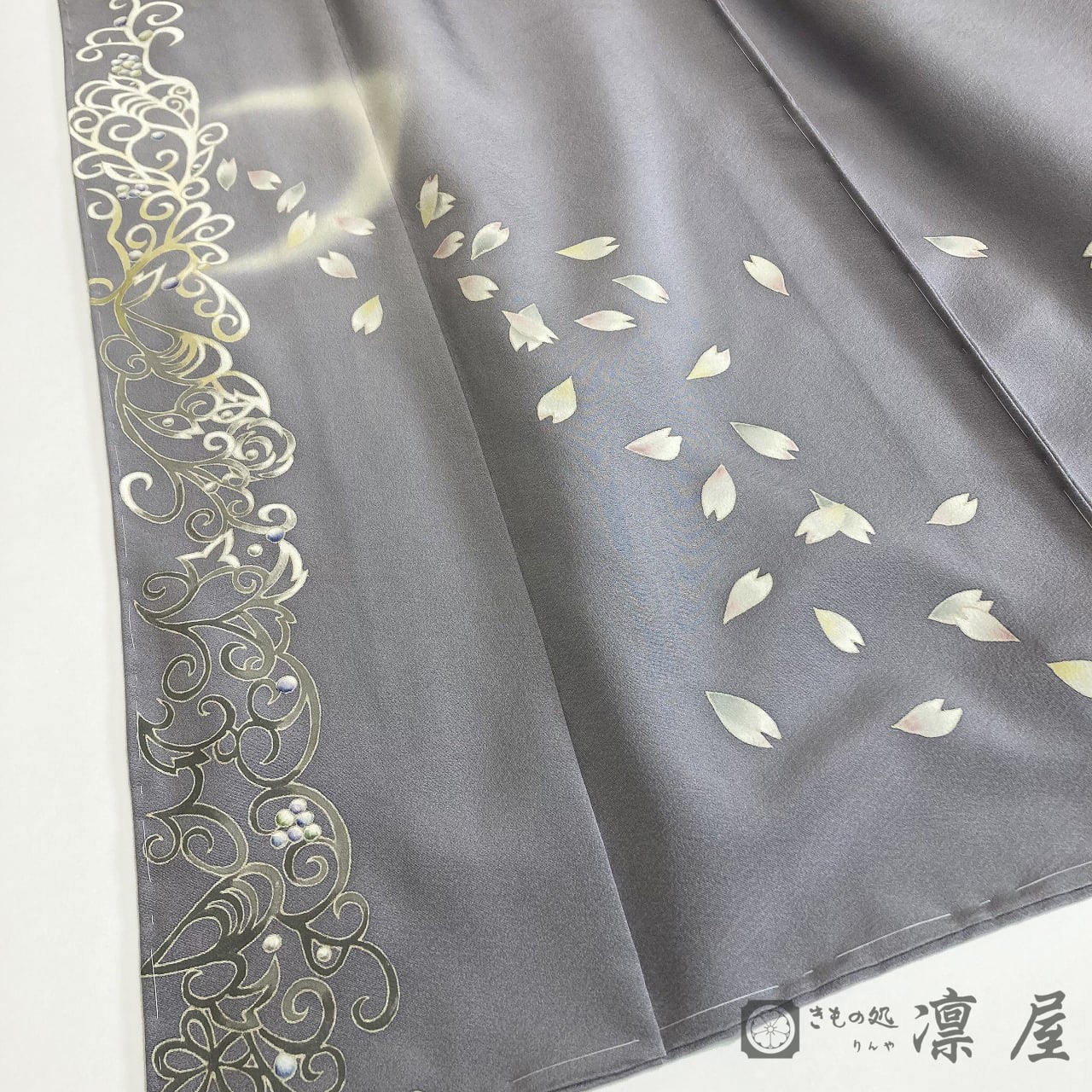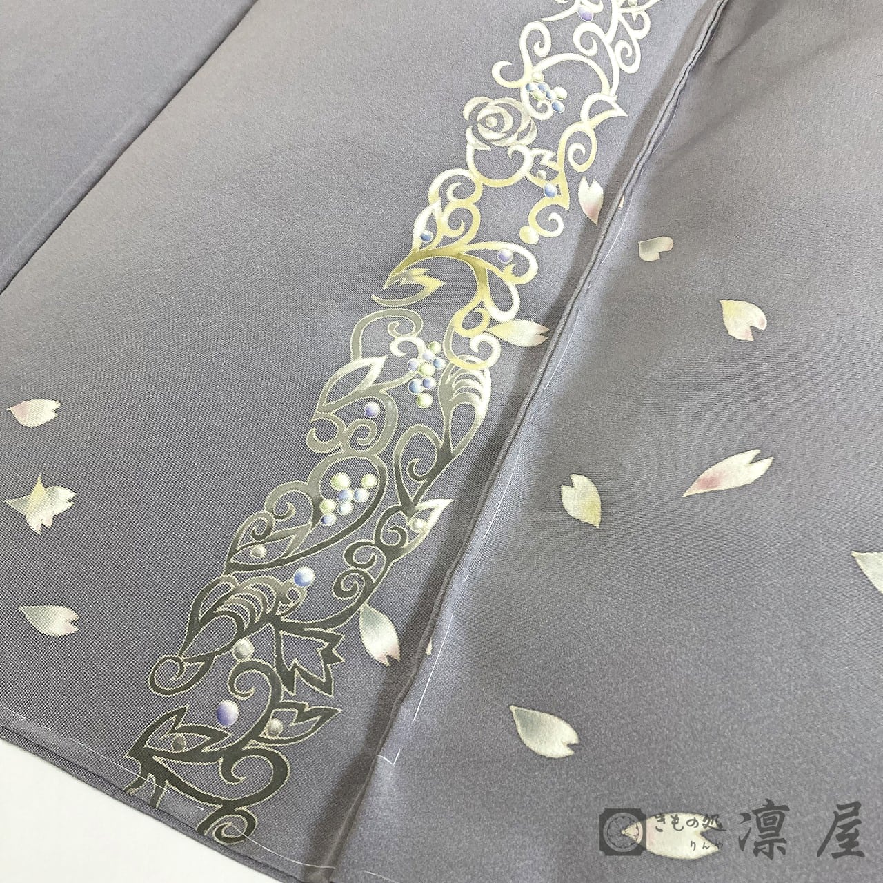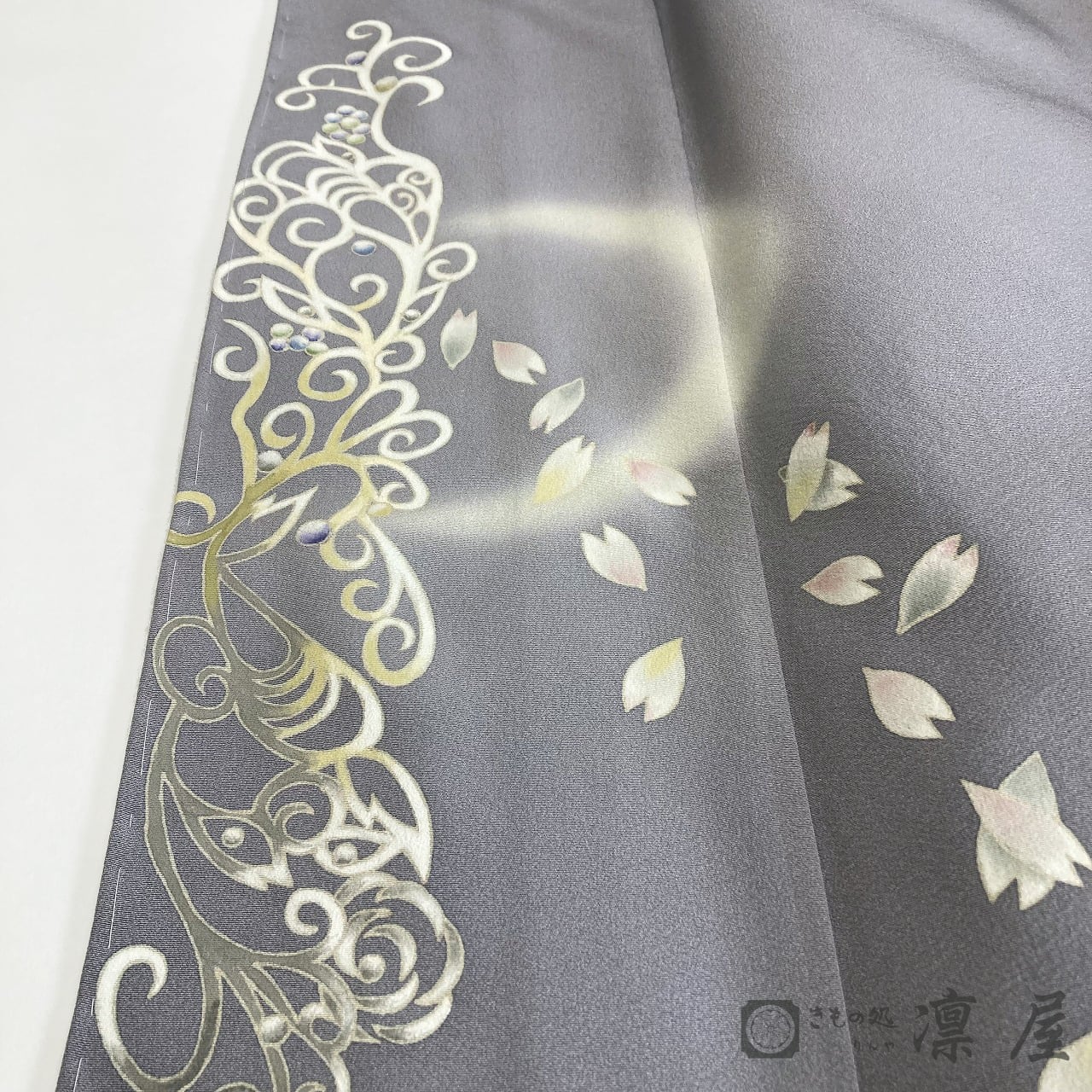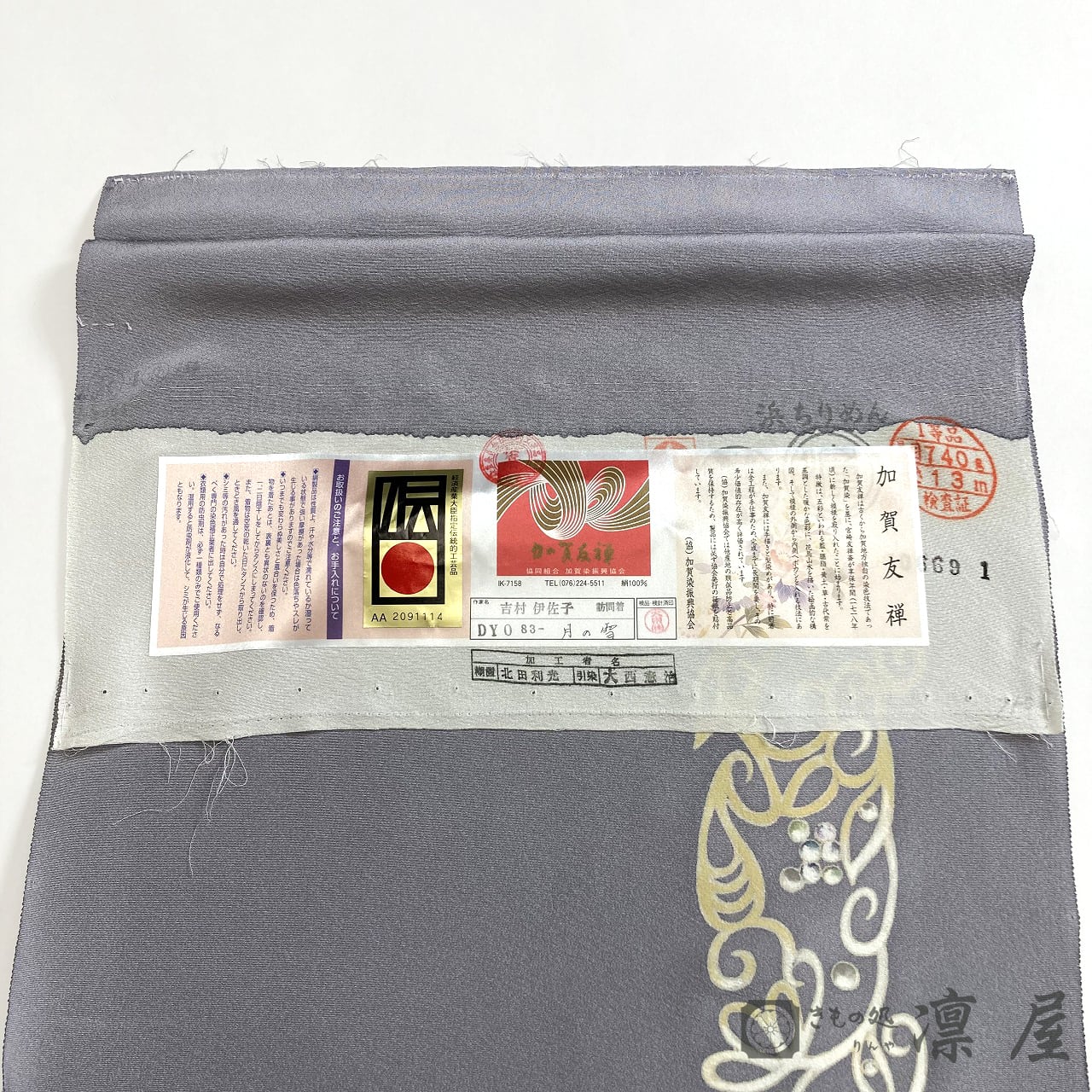 正倉院文様を主軸とした繊細な筆致が目を惹く加賀友禅作家・吉村伊佐子の作品を、りんや好みの地色に別注にて染めていただきました。