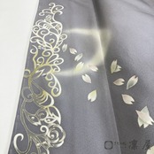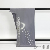 薄鼠といいましょうか、落ち着きのあるブルーグレーの地色に、引き染めのぼかし技法にて施された上前衽の「月の輪」が非常に印象的です。輝く月の明かりによって空がほのかに明るみ、鈍い青の空が広がるような情景のひときわ個性的な訪問着です。